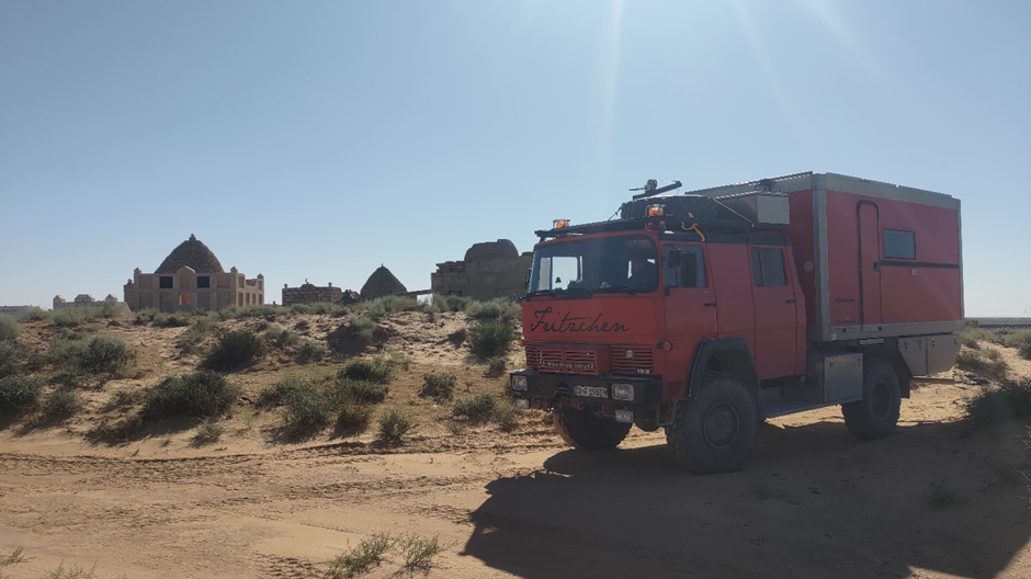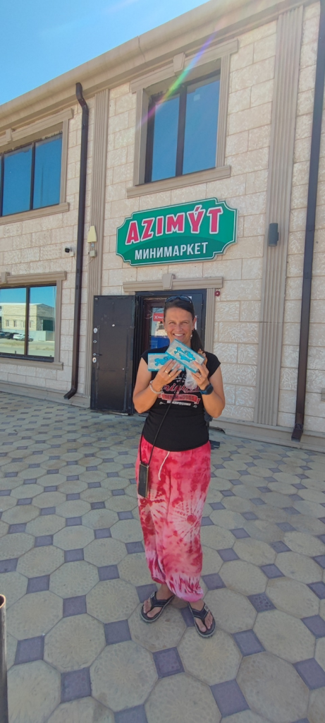 Wir fuhren nach Atyrau, wo wir gleich in einem Außenbezirk in einem kleinen Laden einkauften. Nach dem Bezahlen räumten wir alles ins Fritzchen ein, als der junge Ladenangestellte hinter uns hereilte. Er hatte zwei Tafeln lokale kasachische Schokolade in der Hand, die er mit den Worten „Welcome to Kasachstan“ uns schenkte. Unglaublich, kaum kommen wir in das Land an, überraschen uns die Kasachen mit ihrer großen Gastfreundschaft.