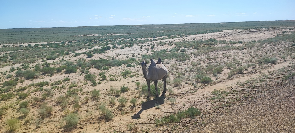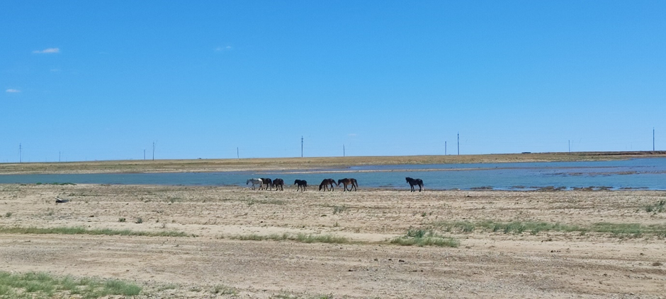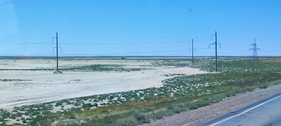Wir fuhren durch die flache kasachische Steppe/Halbwüste weiter. Abgesehen von den gelegentlichen Tieren (Pferde, Kühe oder Kamele) und Friedhöfen gab es wenig zu sehen.
