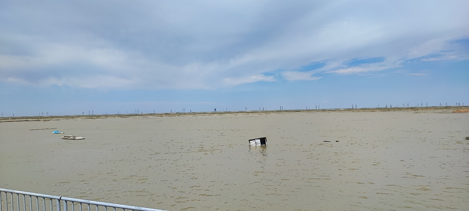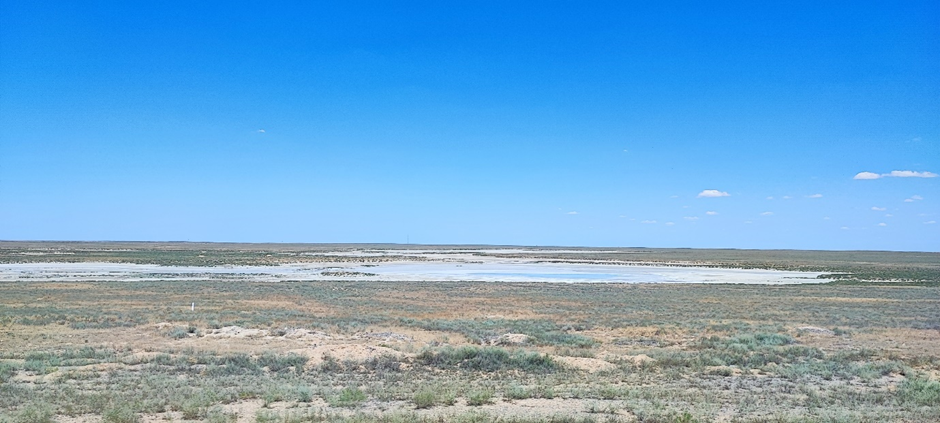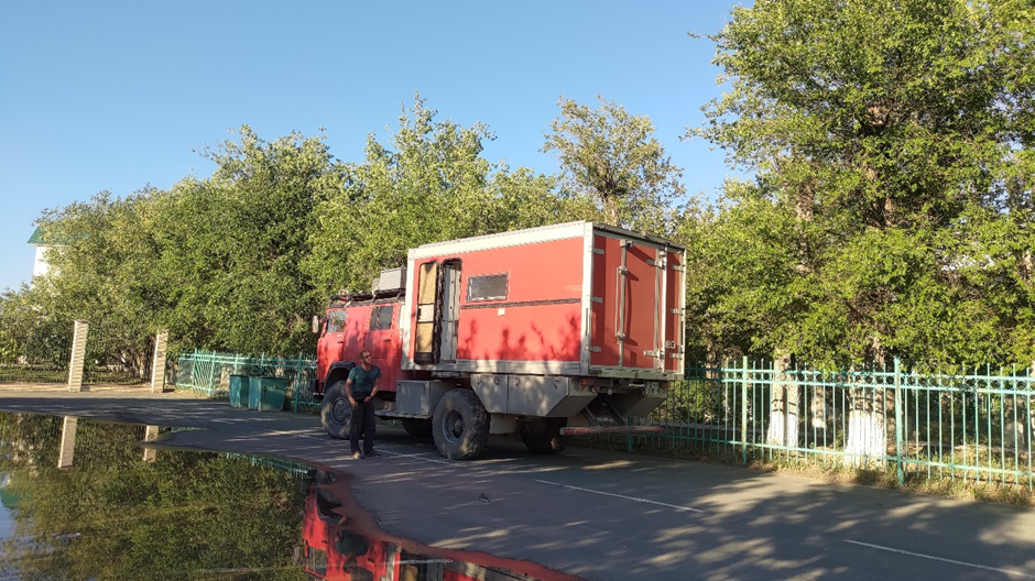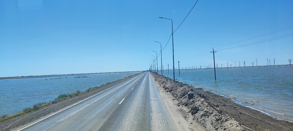 Irgendwann erreichten wir eine Stelle, wo links und rechts von der Straße Wasser lag. Am Anfang dachten wir es ist ein See, aber auf der Karte war dieser nicht zu sehen. Erst als wir Häuser und Strompfosten mitten im Wasser sahen, ist uns klar geworden, dass es immer noch Wasser von den Überflutungen im April ist. Am Morgen des 13. April ist der Wasserpegel des Urals bei Orenburg auf 11,71 Meter gestiegen. Westlich von Orenburg kam es auch in Westkasachstan zu Überschwemmungen am Ural. Mindestens sechs Menschen wurden verletzt und der Schaden wurde auf über 40 Milliarden Rubel (rund 400 Millionen Euro) geschätzt. Die Ausmaße der Überschwemmungen waren jetzt im Juli immer noch riesengroß.
