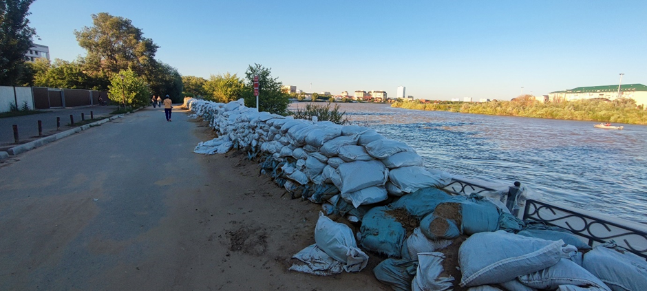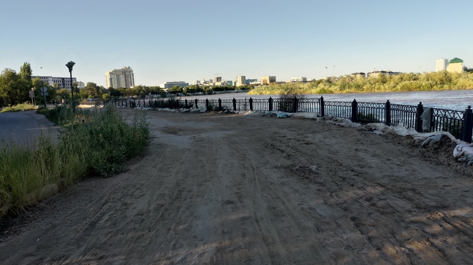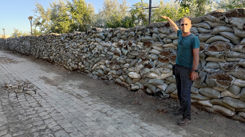 Wir liefen auf der anderen Seite des Ural Flusses zurück. Hier mussten wir teilweise sogar über die Sandsäcke klettern, die noch nicht weggeräumt wurden.