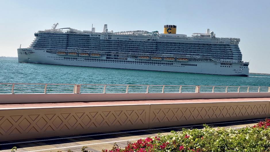 Wir haben wieder mal ausgiebig ausgeschlafen und langsam gefrühstückt. Als wir beim Frühstück durch unser Fenster geschaut haben, konnten wir beobachten, wie gerade ein riesengroßes Costa Kreuzfahrtschiff ankommt. Neben dem sah das Aida-Schiff fast klein aus. Als wir es gegoogelt haben, stellte sich heraus, dass die Costa Toscana eines der größten Kreuzfahrschiffe der Welt ist. Der Ozeanriese mit 337 Metern Länge hat Platz für 6554 Passagiere. Es hat 18 Decks, 4 Pools und 11 Restaurants. Es war faszinierend, zu beobachten, wie das riesige Schiff in den Hafen manövrierte.