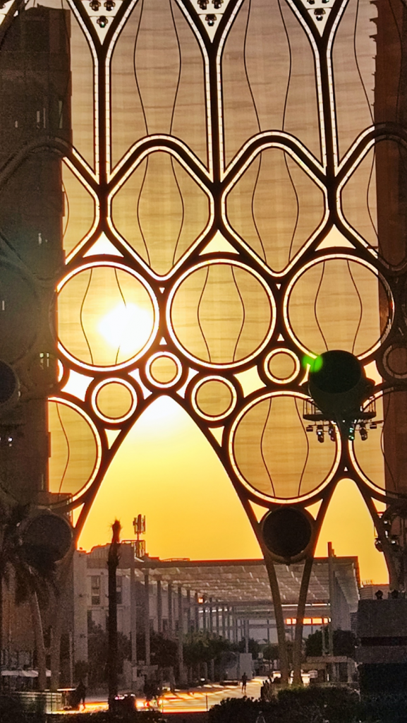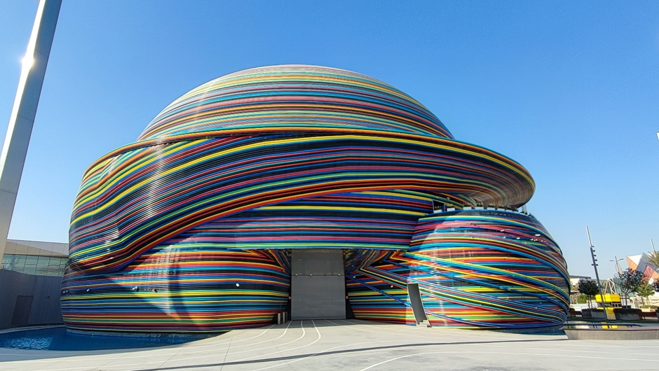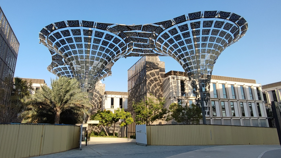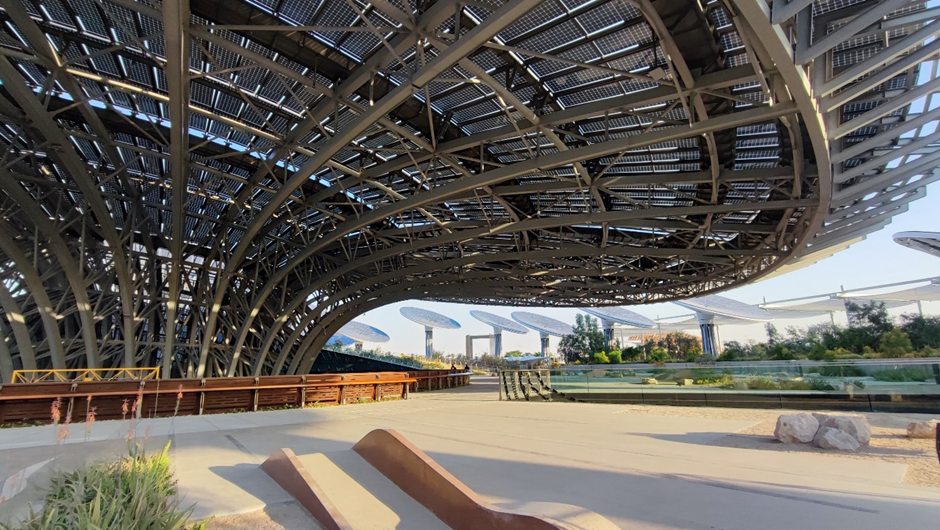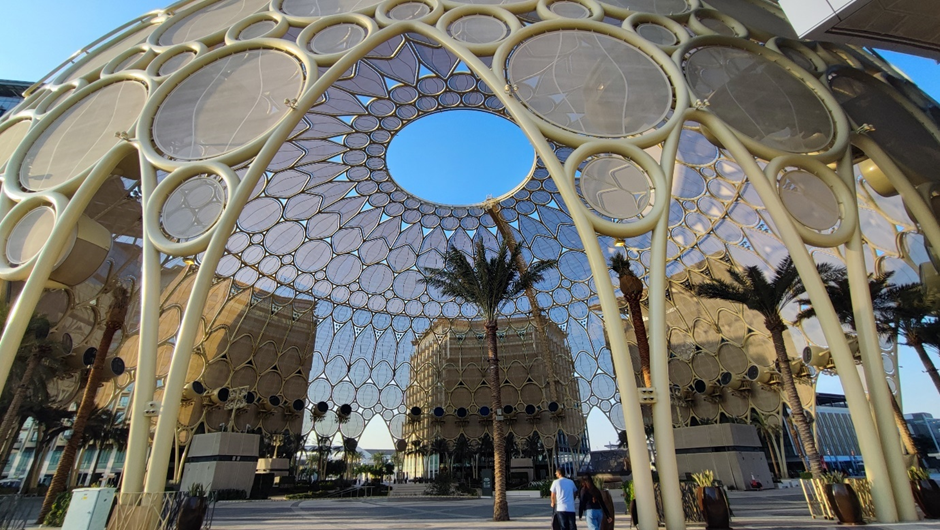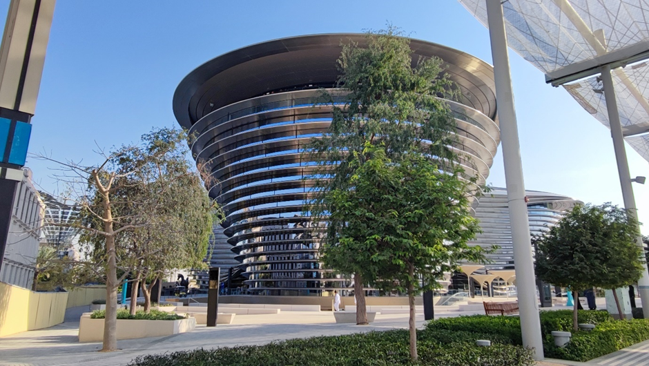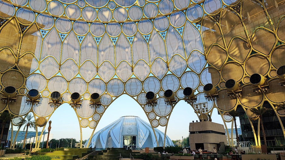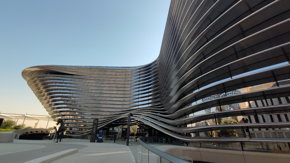 Nachmittags wollten wir zum Gelände des Dubai Expo 2020 fahren, um den Mobility Pavilion anzuschauen. Wir wussten nicht ganz genau, was uns erwartet, aber wir haben gedacht, dass Expo Gebäude immer architektonisch interessant sind. Es war nicht ganz einfach, auf dem riesigen Gelände den richtigen Parkplatz zu finden. Manche waren gesperrt oder eine Baustelle geworden. Als wir endlich einen Platz in der Nähe des Mobility Pavilions gefunden haben, sind wir dann zu Fuß auf Entdeckungstour gestartet. Die verschiedenen Pavillons der Länder waren tatsächlich architektonisch interessant. (Nicht alle aus 2020 sind stehen geblieben, wir fanden keinen von Deutschland oder Ungarn.)