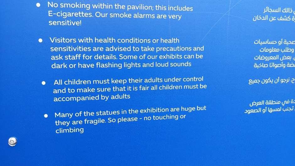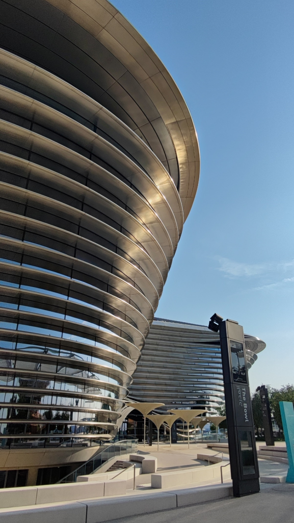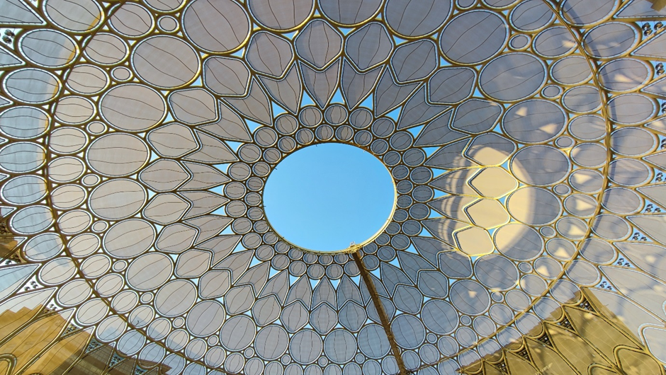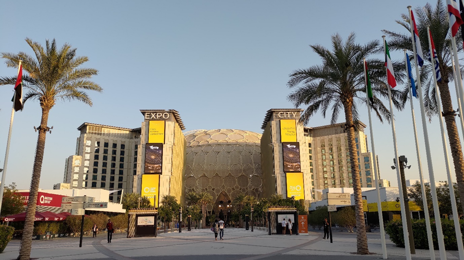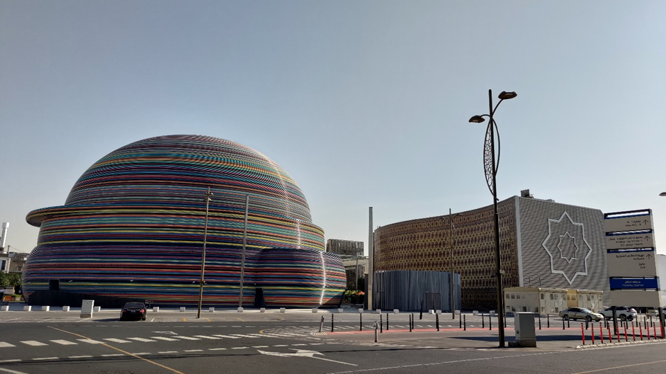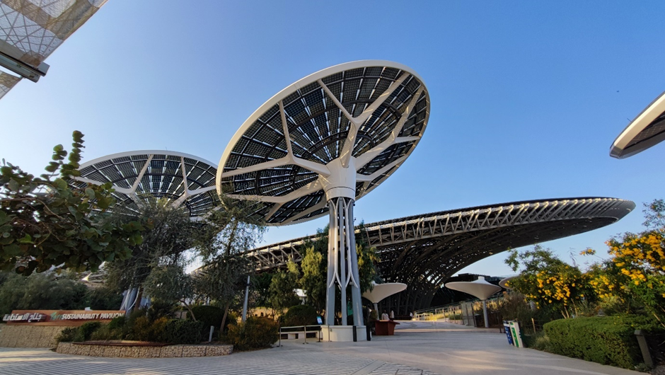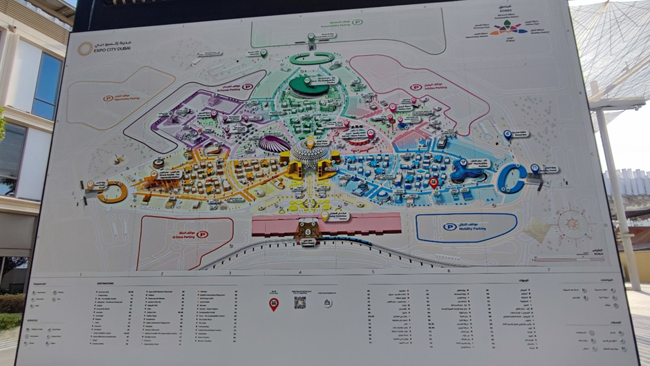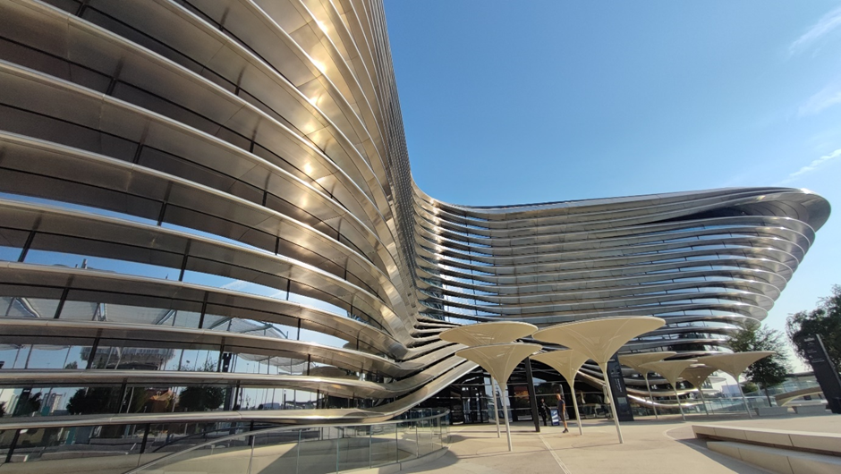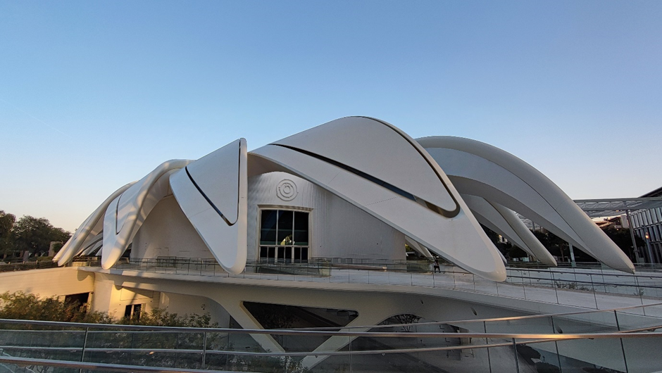 Nachmittags wollten wir zum Gelände des Dubai Expo 2020 fahren, um den Mobility Pavilion anzuschauen. Wir wussten nicht ganz genau, was uns erwartet, aber wir haben gedacht, dass Expo Gebäude immer architektonisch interessant sind. Es war nicht ganz einfach, auf dem riesigen Gelände den richtigen Parkplatz zu finden. Manche waren gesperrt oder eine Baustelle geworden. Als wir endlich einen Platz in der Nähe des Mobility Pavilions gefunden haben, sind wir dann zu Fuß auf Entdeckungstour gestartet. Die verschiedenen Pavillons der Länder waren tatsächlich architektonisch interessant. (Nicht alle aus 2020 sind stehen geblieben, wir fanden keinen von Deutschland oder Ungarn.)