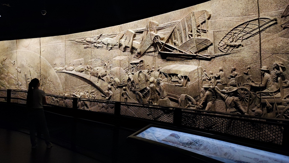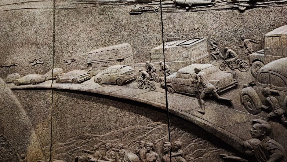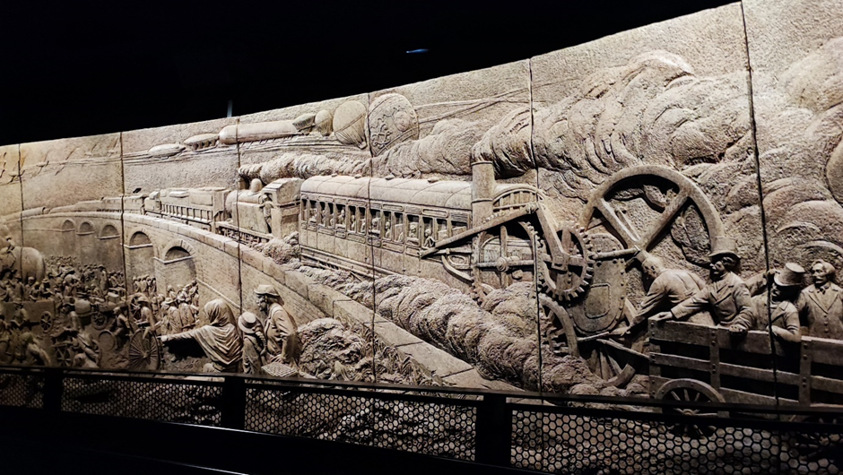 In dem großen Raum war um die Wand herum ein geniales Wandrelief installiert. Dieses hat die Entwicklung der verschiedenen Mobilitäts- bzw. Verkehrsformen gezeigt. Angefangen von Laufen bis zu Weltraumreisen.