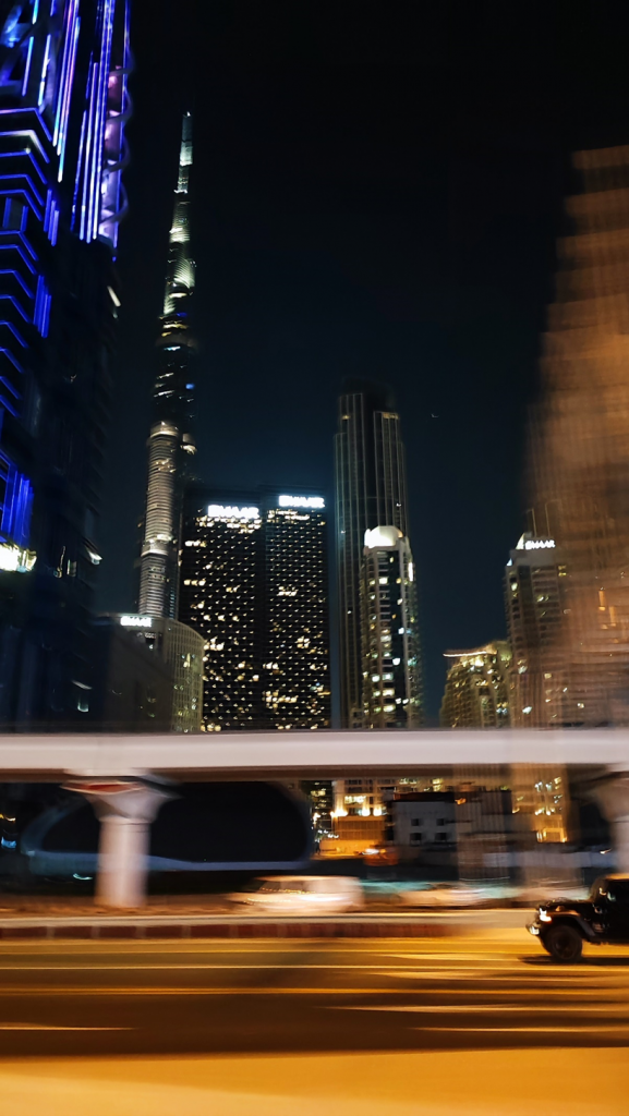 Im Dunkeln sind wir in Richtung Sharjah losgefahren, da wir morgen um 10 Uhr unser Fritzchen dort abgeben sollten. Auf dem Weg sind wir durch das nächtliche, hell erleuchtete Dubai durchgefahren. Unser Weg führte auf zweimal 8-spurige Autobahnen durch Wälder von Wolkenkratzern. Wir sind auch vor dem Burj Kalifa und dem Museum der Zukunft vorbeigefahren, haben aber nicht mehr angehalten, da es schon spät war und wir noch viel erledigen mussten, bevor wir morgen Fritzchen abgeben.