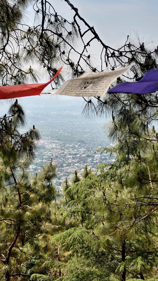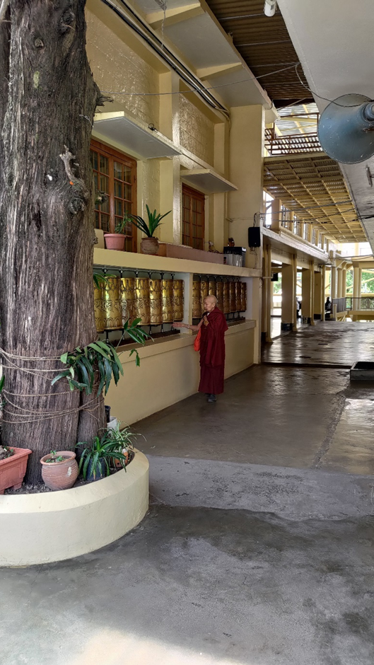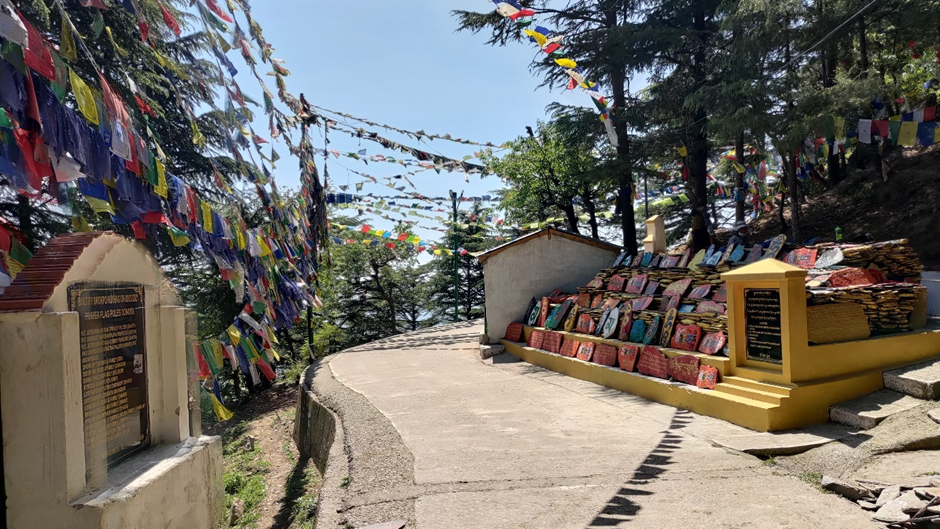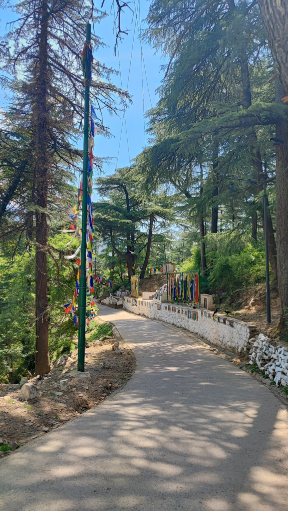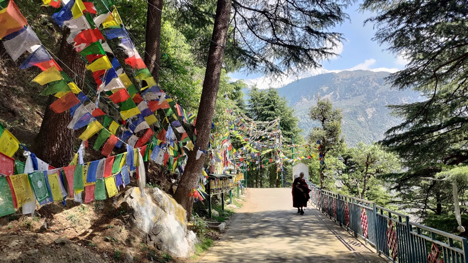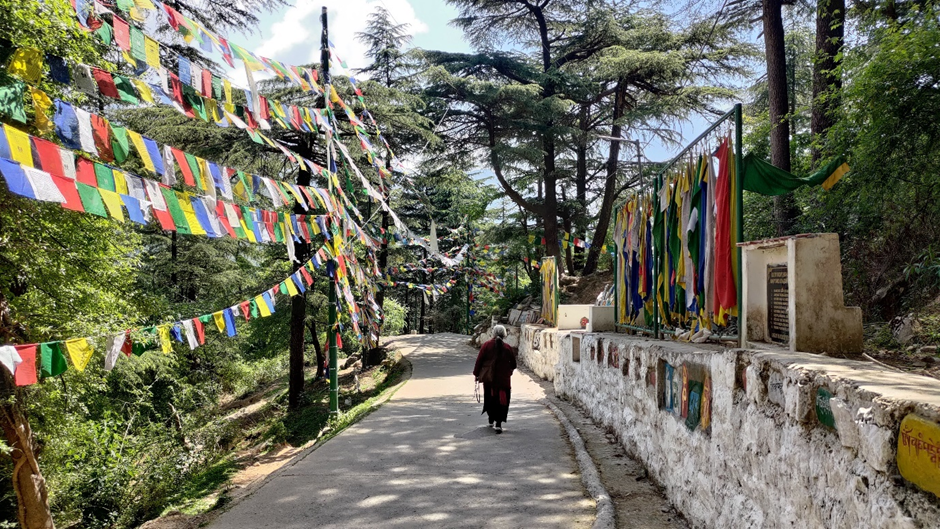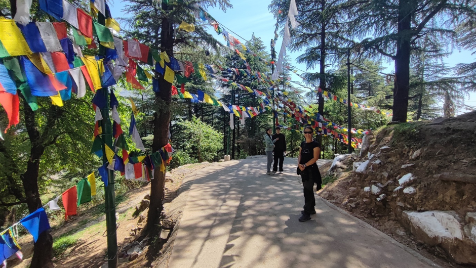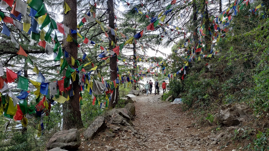 Wir sind auf einem malerischen Weg nach Gangchen Kyishong gelaufen. Der Pfad war begleitet von vielen Gebetsmühlen und Gebetsfahnen. Wir hatten auch einen wunderschönen Ausblick auf die nahen Berge und auf das Tal mit Dharamsala.