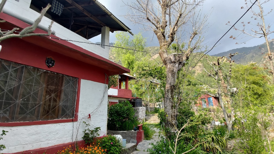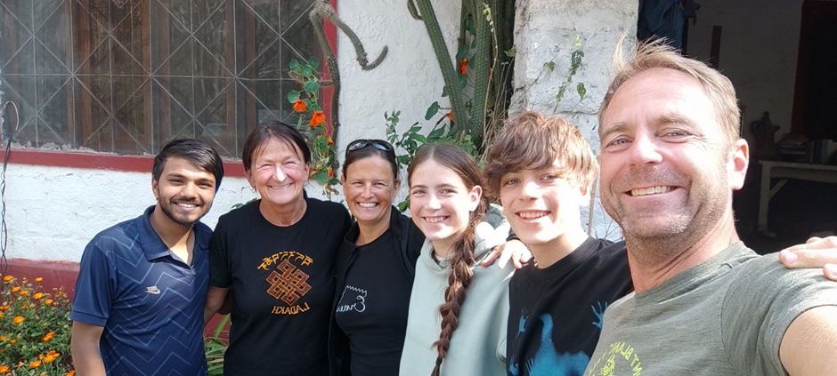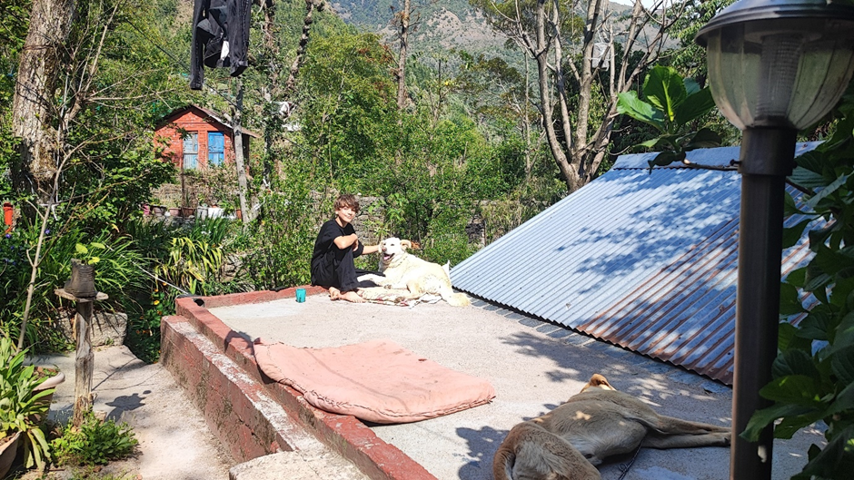 Nach dem Museum haben wir wieder ein Taxi genommen, um zu Ria nach Lower Dharamkot zu fahren. Der Taxifahrer hat uns in Upper Dharamkot rausgelassen (er hat gesagt, er kann nicht weiterfahren, weil er dann nicht wenden kann, was eigentlich nicht stimmte) und wir sind dann zu Fuß ins Tal nach Lower Dharamkot gelaufen. Unten angekommen haben wir Ria angerufen. Sie kam und holte uns ab. Sie führe uns zu ihrem Haus, wo wir auch ihrem Sohn, Roshan trafen. Wir saßen mit ihnen im wunderschönen, grünen Garten. Ria kommt aus unserer Heimat, wir haben festgestellt, wir haben sogar gemeinsame Bekannten. Sie hat von ihrem nicht alltäglichen Leben in Indien und wir über unsere Reise erzählt. Sie betreibt hier ein Guesthouse, backt Kuchen und Brot und da sie eine gelernte Friseurmeisterin ist, kann man sich bei ihr sogar die Haare professionell schneiden lassen. Bevor wir gingen, kauften wir ein frisch gebackenes Sauerteigbrot von ihr, das gerade warm aus dem Ofen kam.