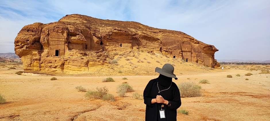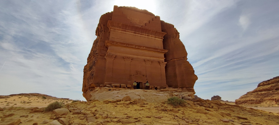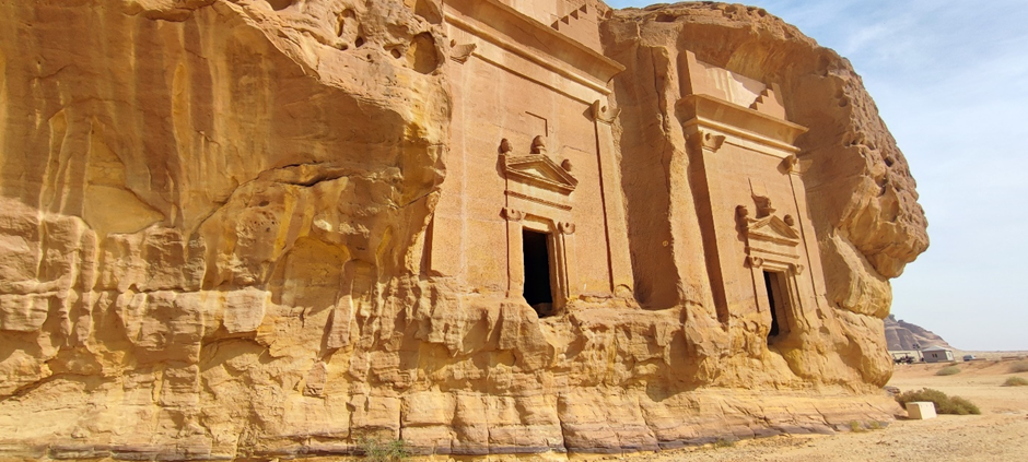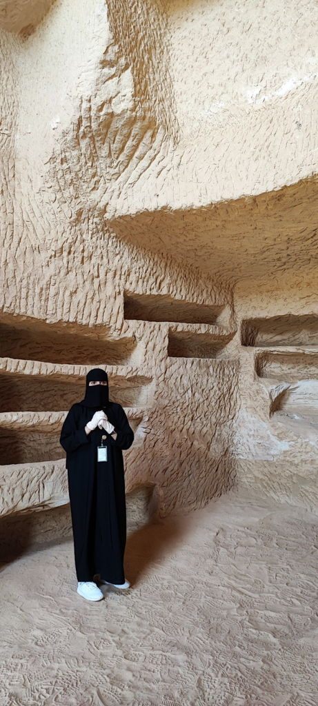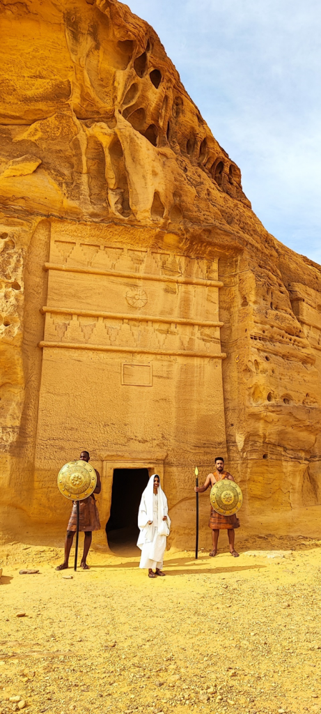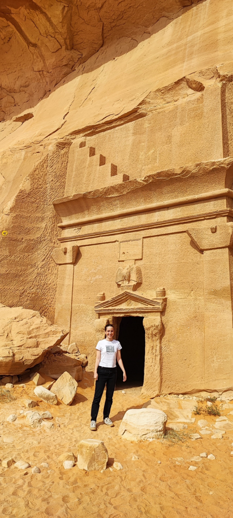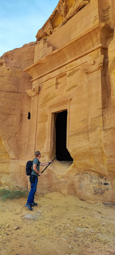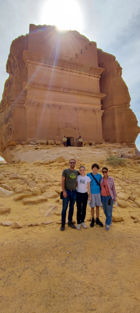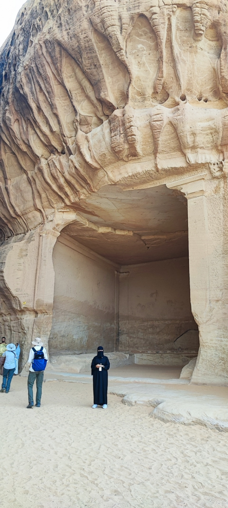 Am Besucherzentrum in Hegra angekommen waren wir mit frischen Säften (der Granatapfelsaft war wirklich sehr lecker) und getrockneten Früchten (Mangos, Feigen, Datteln, Ananas) empfangen worden. Nach kurzer Wartezeit sind wir hier in einen zweiten klimatisierten Reisebus gestiegen. Drei Mitarbeiter von Hegra haben uns begleitet. Im Bus haben sie kleine Wasserflaschen verteilt. Wir haben an vier Stellen auf dem Gelände angehalten, um die Gräber und andere kultische Orte bewundern zu können. Wir hatten Glück, da neben der Führerin vom Besucherzentrum, die auch vieles vom Ort, den Gräber und den Nabatäer erzählte, die Reisegruppe, die mit uns im Bus war, einen eigenen Reiseführer hatte. Er war Archäologe und war tatsächlich Teil des Ausgrabungsteams hier in Hegra. Seine Kommentare und Informationen waren natürlich noch tiefgründiger als die von der saudischen Reiseführerin.