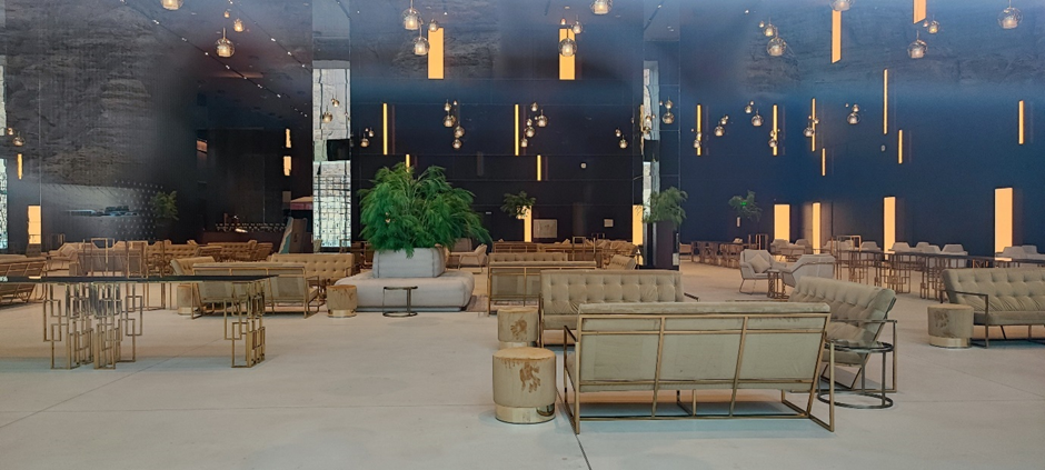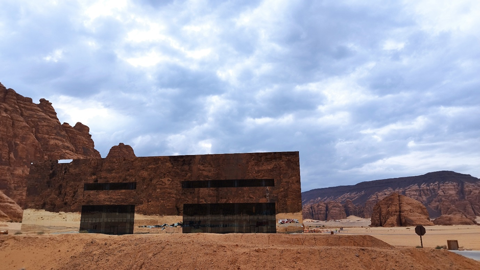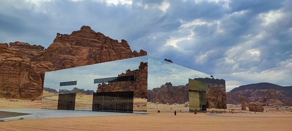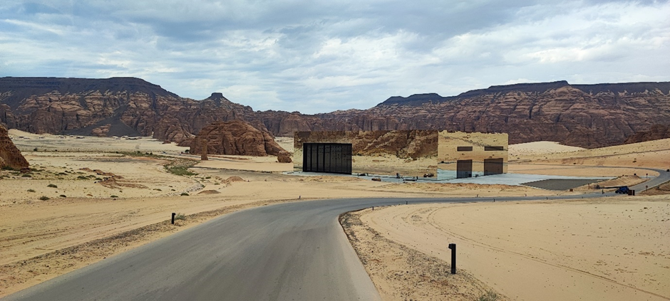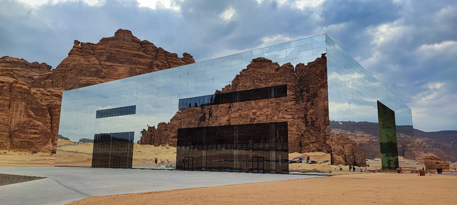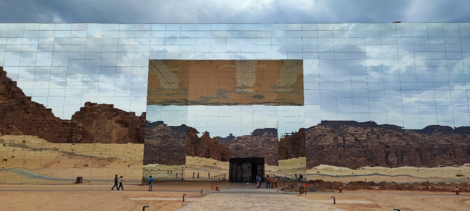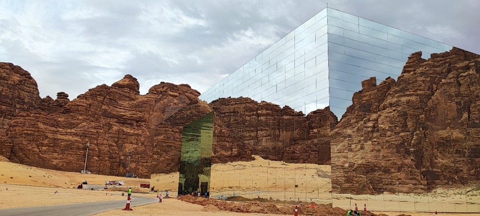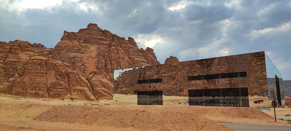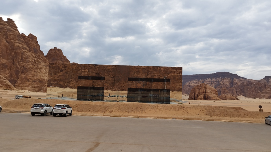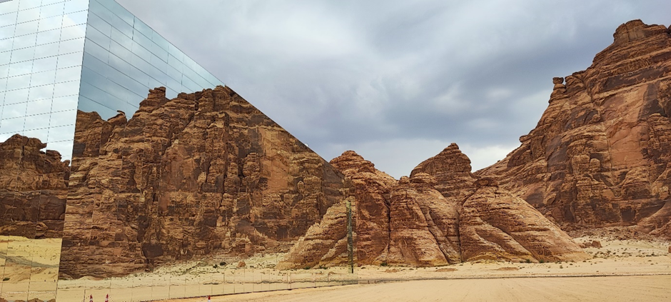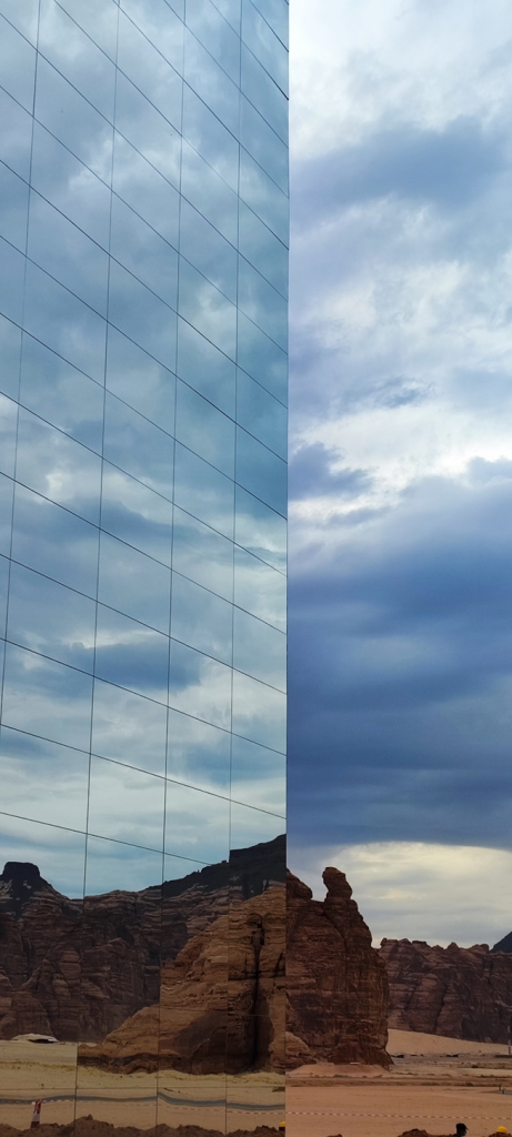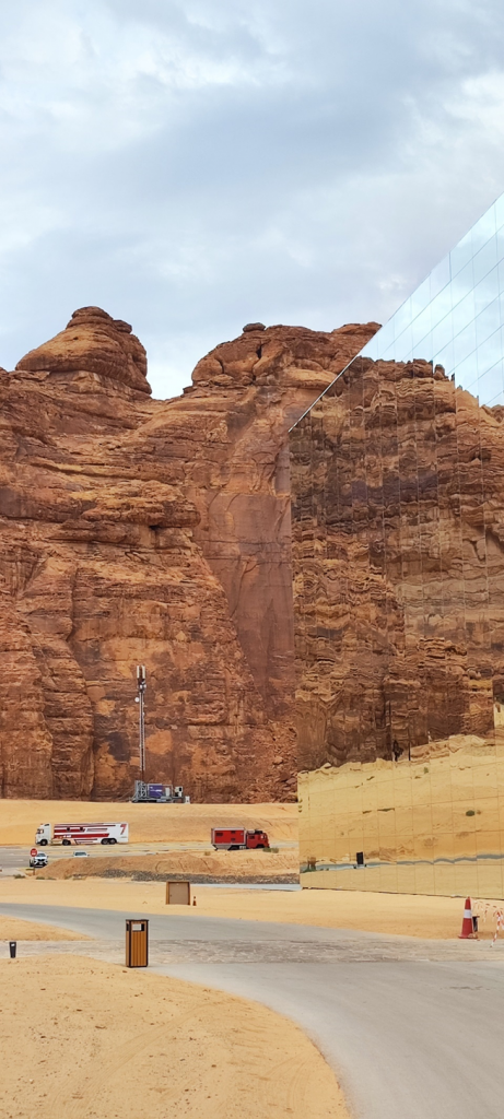 Wir sind als nächstes zu dem sog. Mirror House in Maraya gefahren. Das Gebäude liegt versteckt in einem Tal, umgeben von großen, schroffen Felsen und ist das größte mit Spiegeln bedeckte Gebäude der Welt. Man darf es normalerweise nur dann besichtigen, wenn man eine Reservierung in einem der Restaurants im Gebäude oder dahinter im Resort gemacht hat. Wir haben natürlich keine Reservierung gehabt, wollten aber trotzdem rein. Als wir von der Hauptstraße abgebogen sind, standen wir gleich nach ein paar hundert Metern vor einer Schranke. Die Wachmänner wollten uns erstmal nicht reinlassen. Marc hat versucht, ihnen zu erklären, dass er ein deutscher Architekt ist und er das Gebäude sehr interessant findet. Wir würden nur ein paar Bilder machen und wieder rausfahren. Die Wachmänner haben auch nicht wirklich Englisch gekonnt und wir durften immer noch nicht rein. Dann kam ein Auto rauswärts. Als der Mann anhielt, hat er gesagt: „Nice house!“ Wir wussten nicht wer er ist, aber er konnte gut Englisch. Marc hat ihm unser Problem erklärt. Es stellte sich heraus, dass er der Manager des Ortes ist. Er hat uns dann erlaubt, reinzufahren.