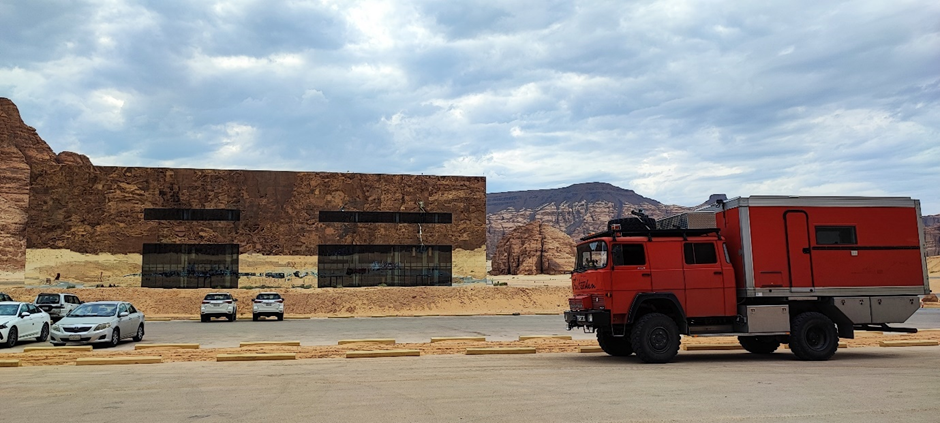 Es war schon relativ spät und wir wollten nicht mehr die lange Reise nach Wadi Disah antreten. Stattdessen sind wir nur zu einer weitere Felsformation, dem sog. Rainbow Rock gefahren. Ich habe eine andere Wasserstelle in IOverlander gefunden, die auf dem Weg zu Rainbow Arch lag und die wir angefahren sind. Hier war der Druck viel besser, innerhalb kürzester Zeit waren unsere Tanks voll. Neben der Straße waren überall Baustellen: die Straße wurde erweitert, ein neues Resort und eine Tankstelle mit kleinen Touristenmarkt wurde gebaut. Von der Straße zum Felsbogen haben sie schon eine Schotterstraße angelegt, es wird nicht mehr lang dauern, und hier wird es auch so ausgebaut wie bei Elephant Rock. Aber jetzt waren wir fast alleine, nur 2 junge Belgier haben wir getroffen, die mit ihrem Mietwagen zum Fels gefahren sind. Wir haben uns noch ein bisschen unterhalten und zusammen den Sternenhimmel bewundert, bevor sie zurück nach Al Ula gefahren und wir ins Bett gegangen sind.