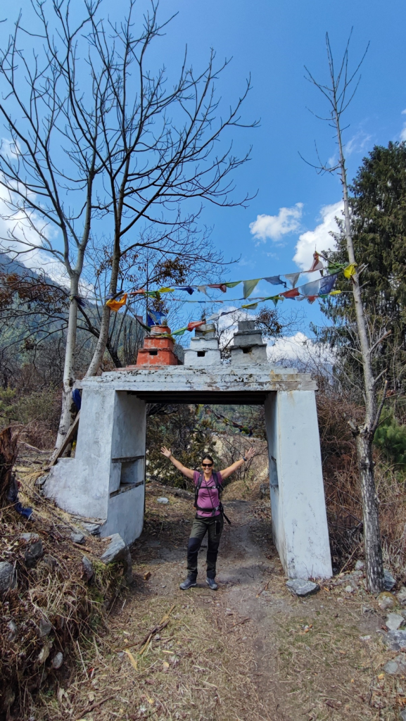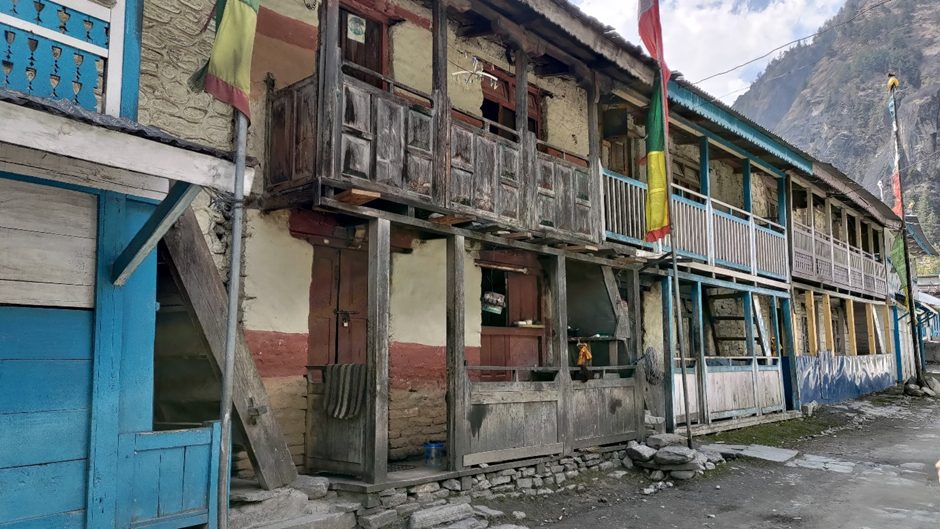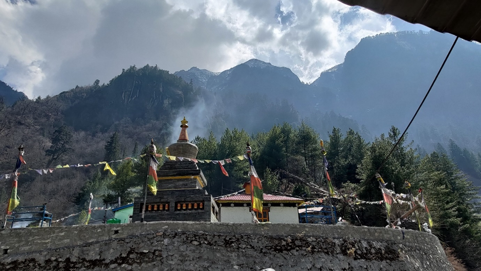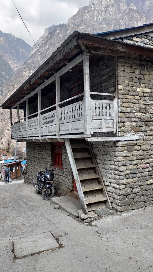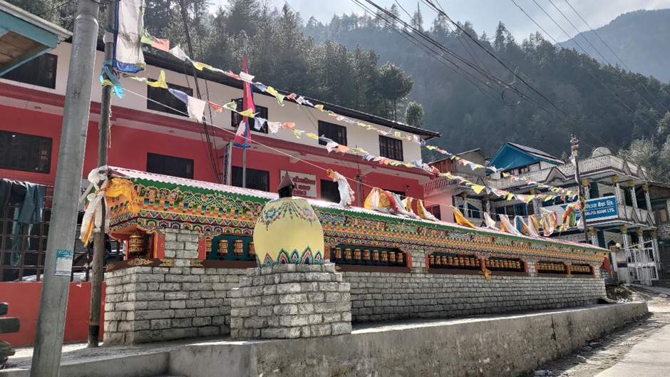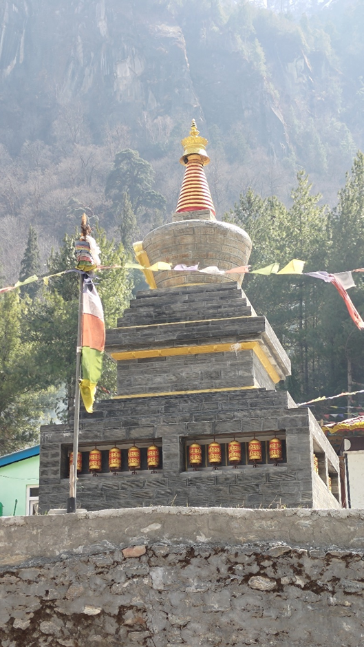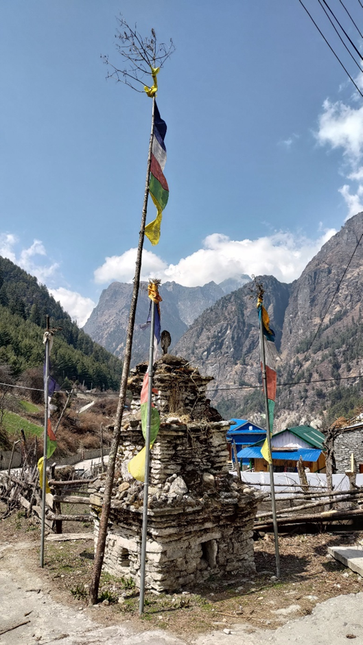 Ab und zu überquerten wir mehr oder weniger traditionelle Nepalesische Dörfer mit alten Stein- oder Holzhäusern, Gompas, Gebetsmühlen und Gebetsfahnen.