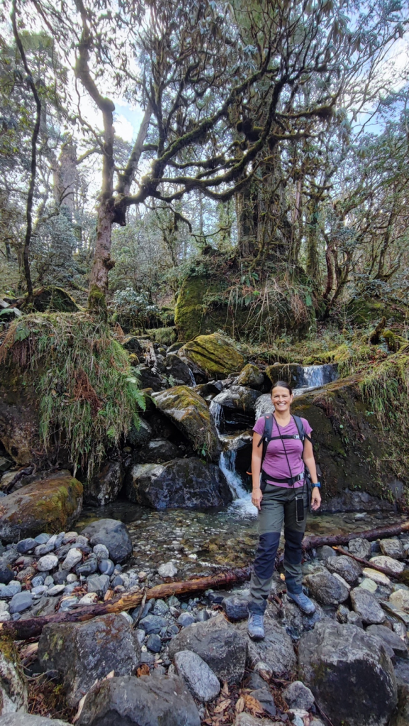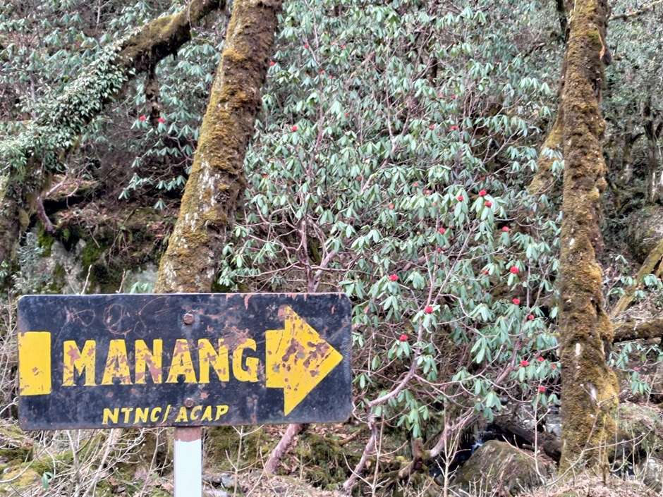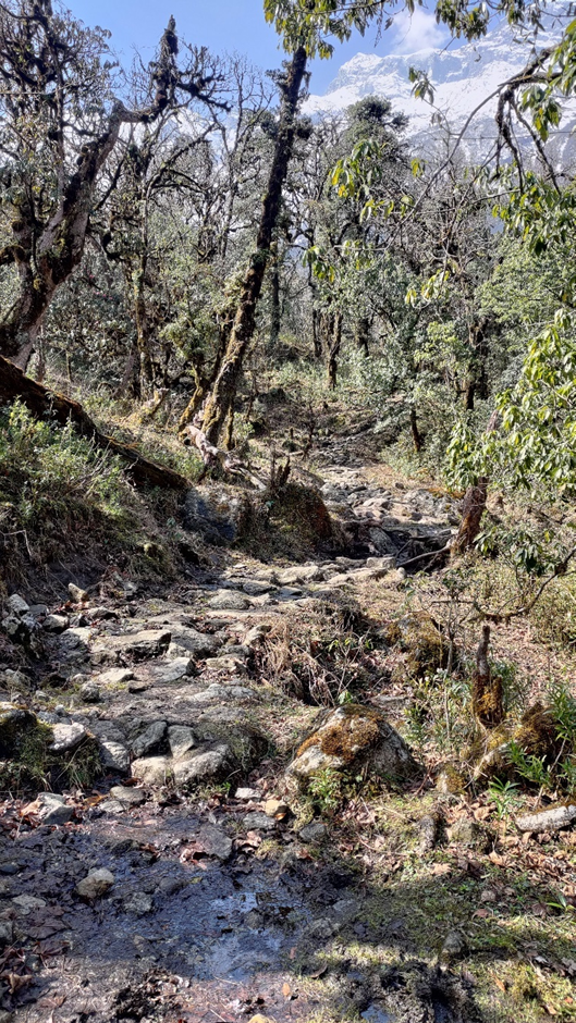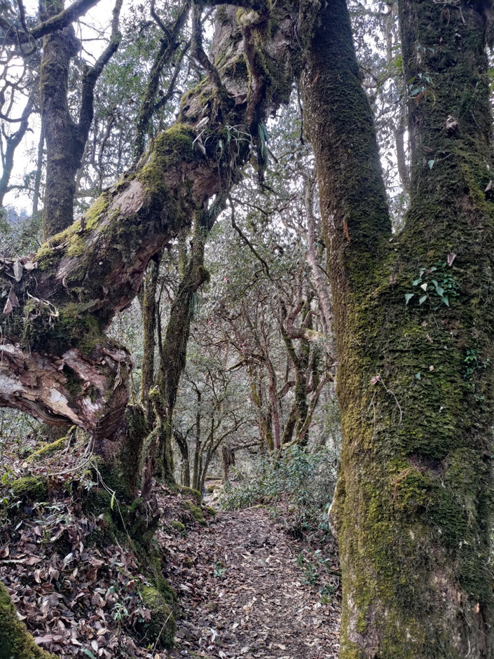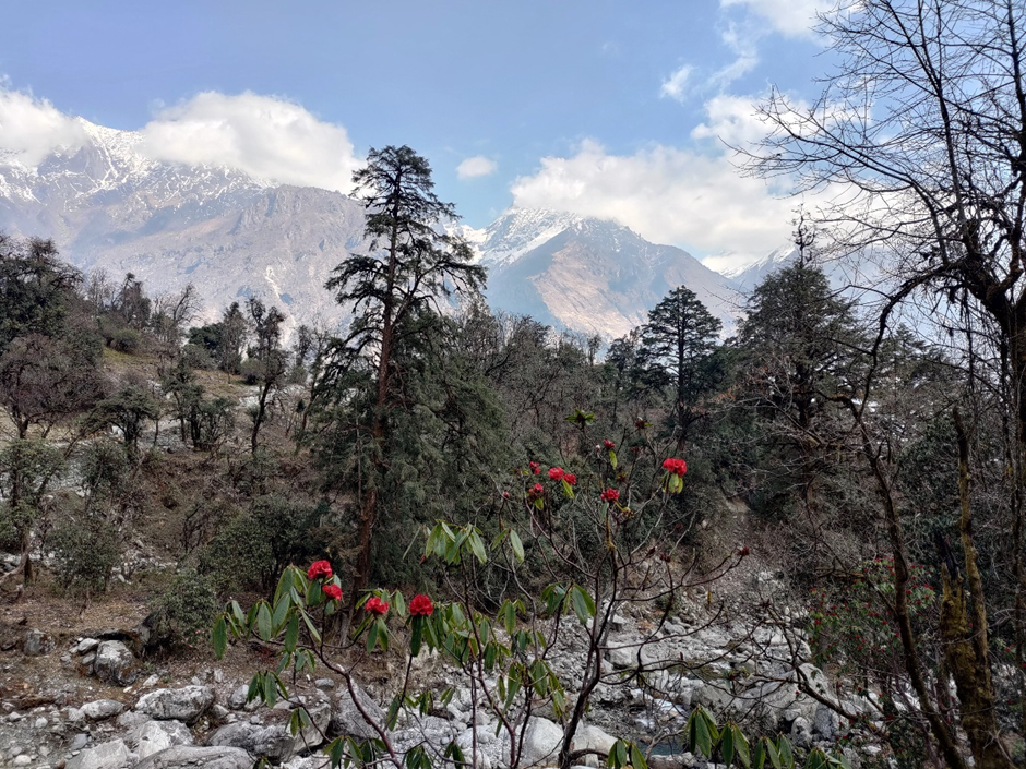 Wir trafen etliche andere Wanderer und auch Nepali Träger. Nach dem anstrengendem Treppenstieg kamen wir in einem wunderschönen Rhododendronwald an. Überall blühte Jasmin und die Luft duftete stark danach.