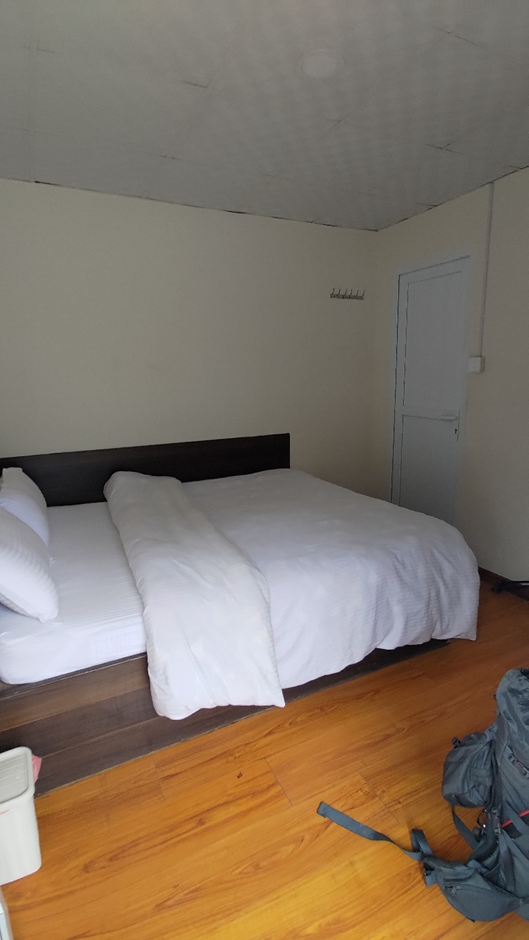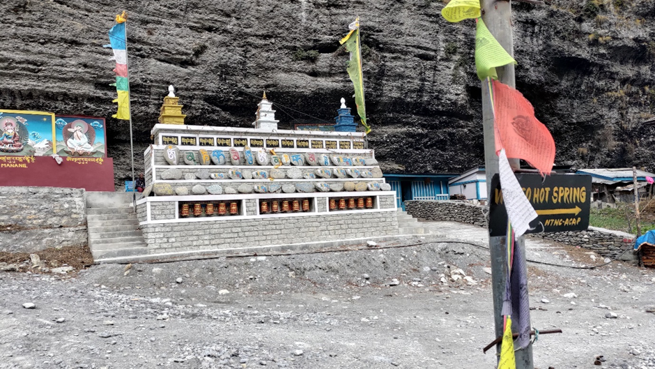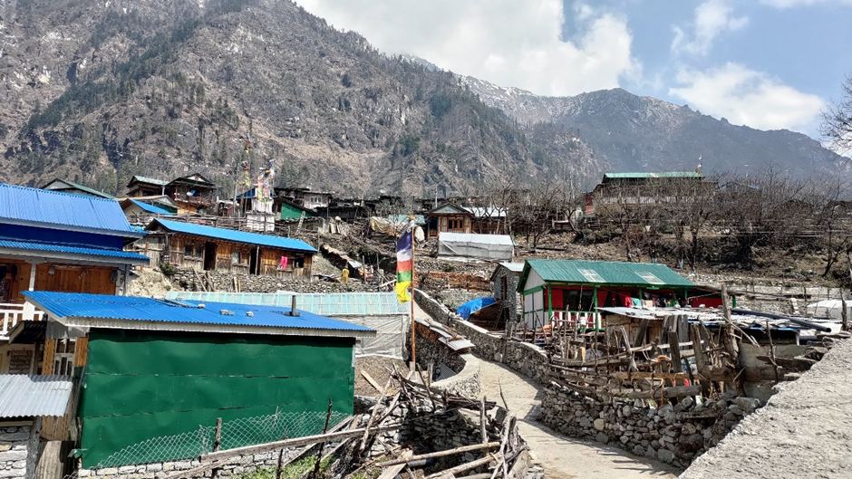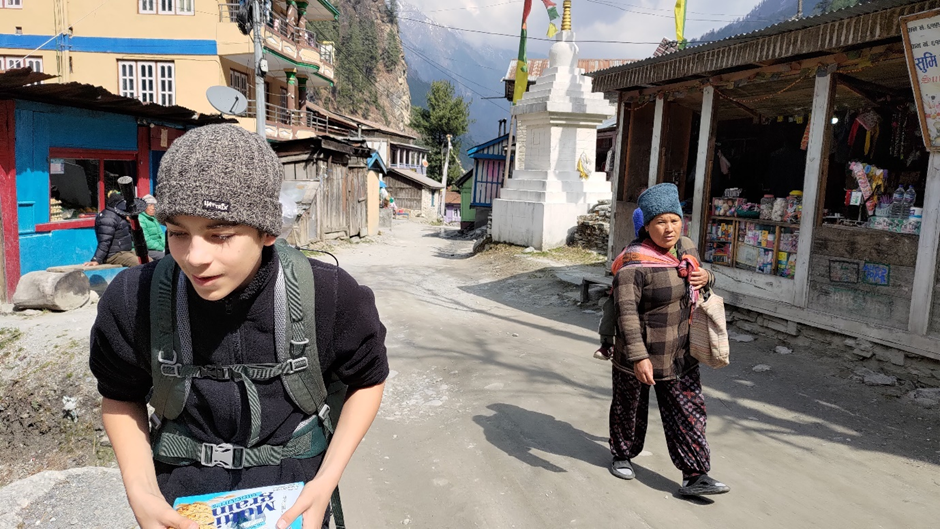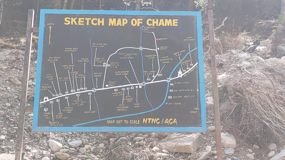 Chame ist das regionale Zentrum das Manang Districts, mit einer Bank, einer Polizeistation und der District Administration. Es dient auch als großer Basar für die umliegenden Dörfer, man kann hier alles kaufen. (Na gut, nicht alles, aber vieles.) Wir haben auch ein paar Sachen besorgt, wie Klopapier und Kniestützen für Marc. Für die Nacht haben wir uns in ein sehr neues Guesthouse mit isolierten Türen und Fenstern einquartiert. Es kostete mit 1000 NPR mehr als die bisherigen Zimmer (500 NPR) aber die warmen Zimmer waren es uns Wert.
