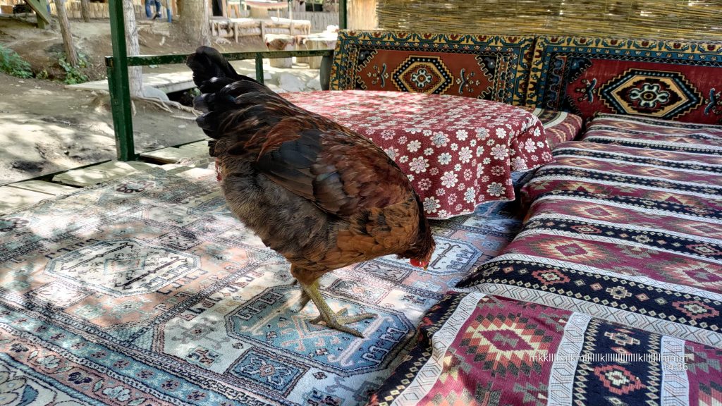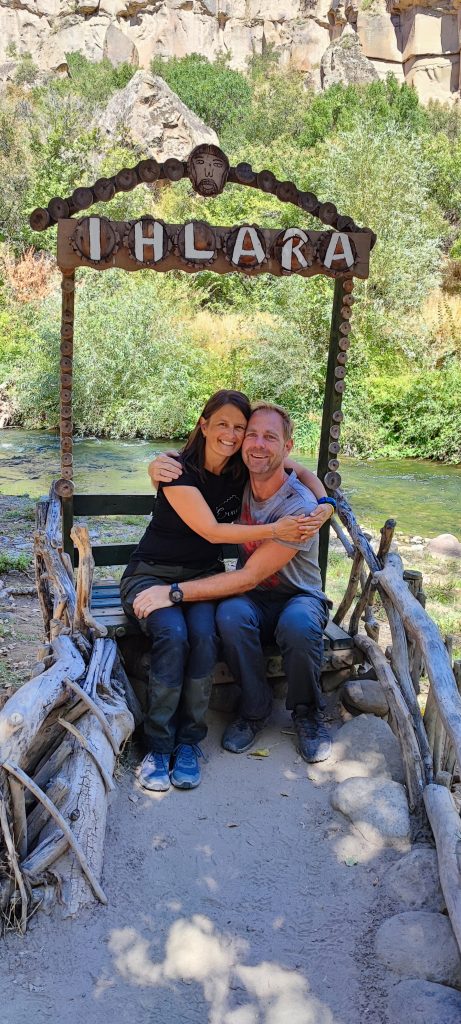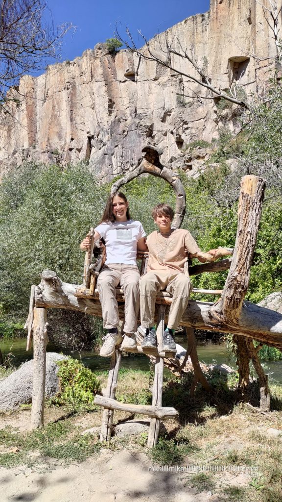 Wir (vor allem die Kinder) sind allerdings immer hungriger geworden. Deshalb haben wir uns sehr gefreut, als wir mitten im Tal eine Gaststätte gefunden haben. Es gab Terrassen über dem Fluss, wo man auf türkische Weise auf dem Boden sitzend etwas essen und trinken konnte. Auch im Wasser standen Picknicktische, wo man seine Füße im Wasser baumeln lassen konnte. Wir haben Toasts, Getränke und nachher einen Chai gekauft und auf einer der Terrassen entspannt unsere Bäuche gefüllt. So gestärkt sind wir dann weitergelaufen. Als wir bei Belisirma angekommen sind, hat man gesehen, wie viele Touristen hier in der Hochsaison sein können: Es gab hier unzählige Restaurants mit Terrassen über dem Wasser und auch ein Taxi, womit man nach Ihlara zurückfahren konnte. Da wir schon satt waren und zügig weiter nach Selime wollten, sind wir gar nicht stehen geblieben.
