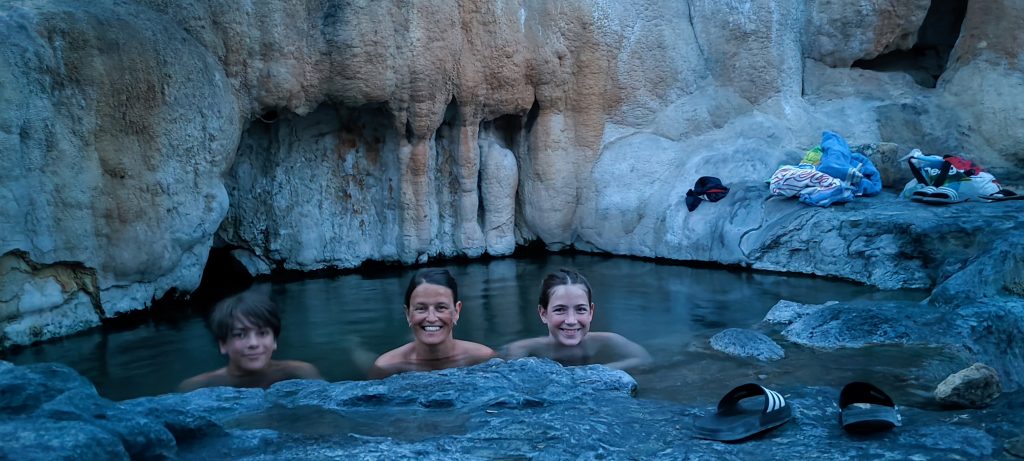 Ich musste noch einen neuen Schlafplatz aussuchen. Ich habe auf IOverlander einen Platz gefunden wo drin stand: „Hot Tub“.  Ein Pool mit Thermalwasser. Das wäre was nach dem heutigen Tag. Wir waren von der ganztägigen Wanderung sehr müde und jetzt, Mitte September, werden hier auf über 1000 m die Abende und Nächte ziemlich kühl. Also sind wir hingefahren. Und tatsächlich war am angegebenen Ort ein kleiner Pool aus Stein, unter einen Tropfsteinwand, rand voll mit ca. 40-45 Grad warmem Wasser.
