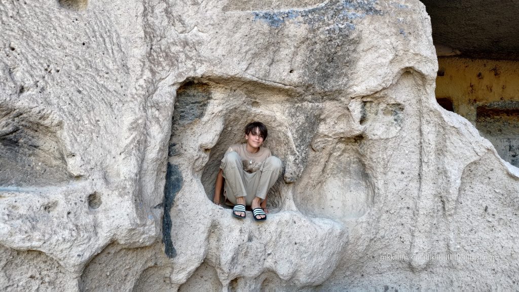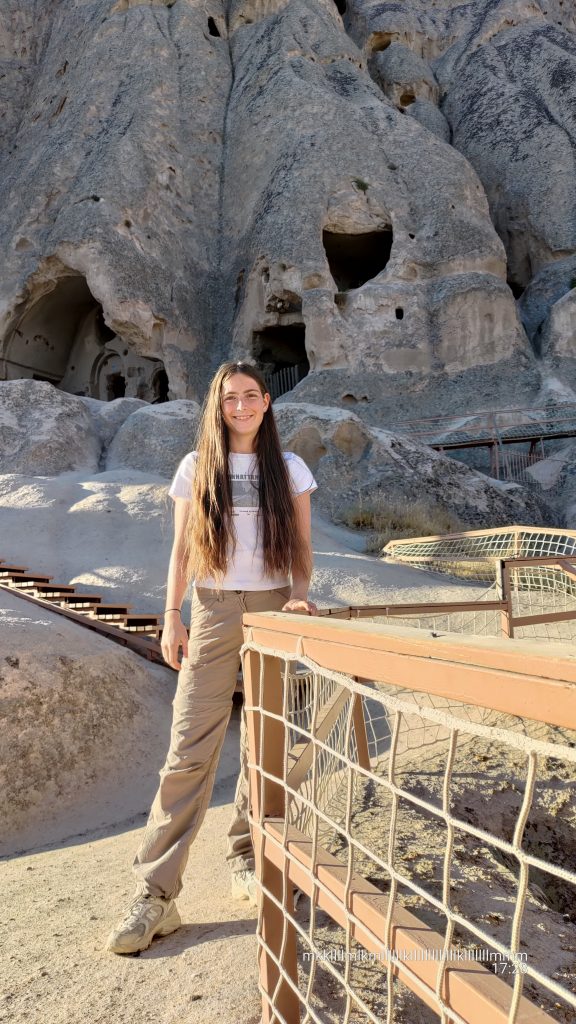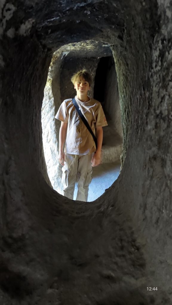Als die Felswände angefangen haben, haben wir gleich die ersten Höhlenwohnungen gefunden. Natürlich mussten wir sie entdecken. Wir sind hochgeklettert und reingegangen. Innen gab es weitere Gänge. Und Räume. Und Gänge. Und Räume. Es ging immer weiter. Wir mussten aufpassen, da im Boden überall Lüftungsschächte,  Feuerstellen und andere Löcher waren. Wir sind am Ende ganz woanders herausgekommen, als wir reingegangen sind. Es hat echt Spaß gemacht, die Höhlengänge zu entdecken.