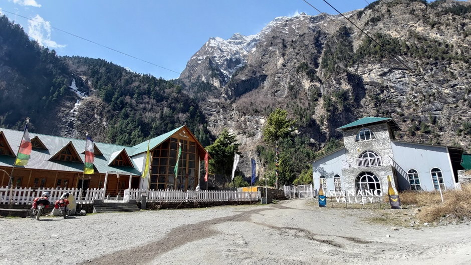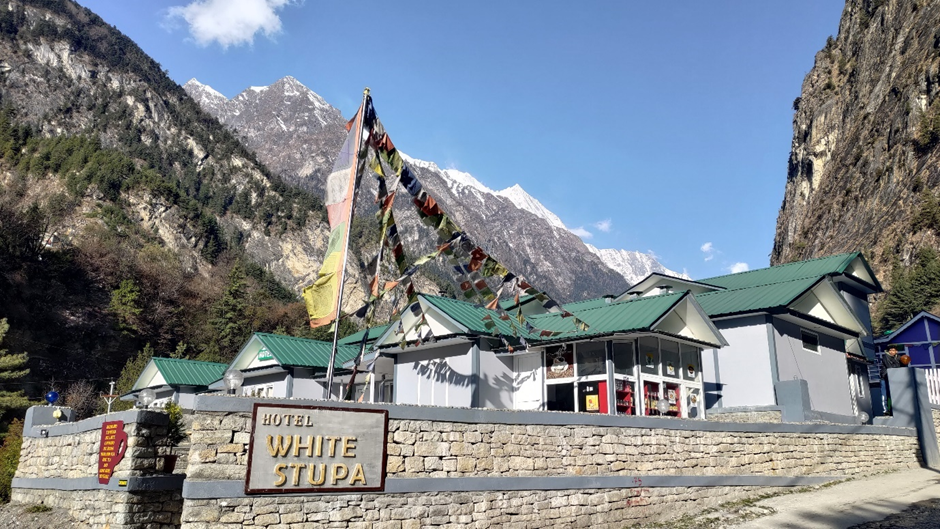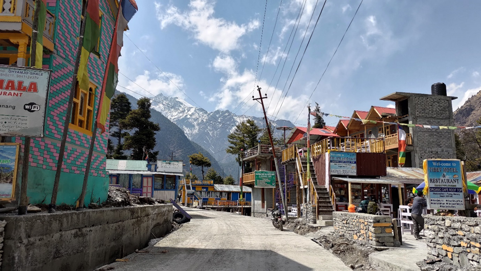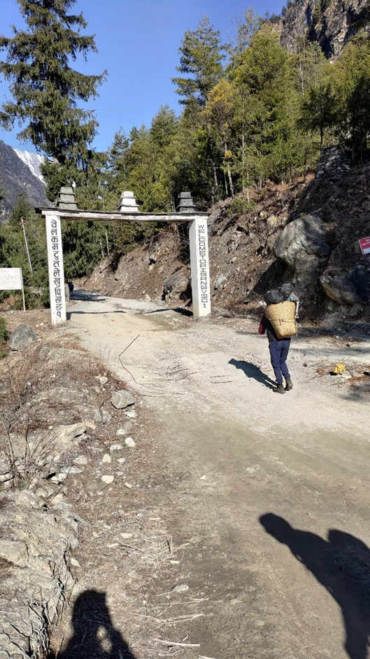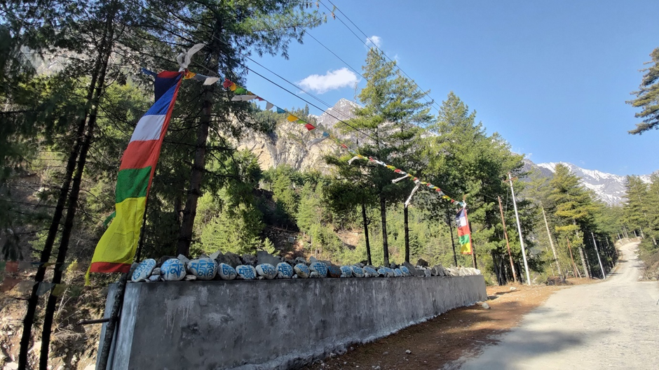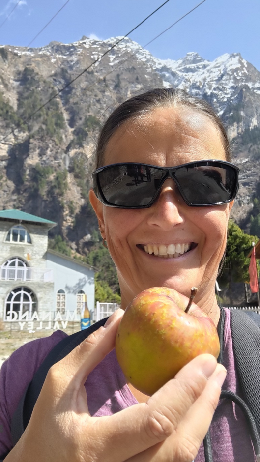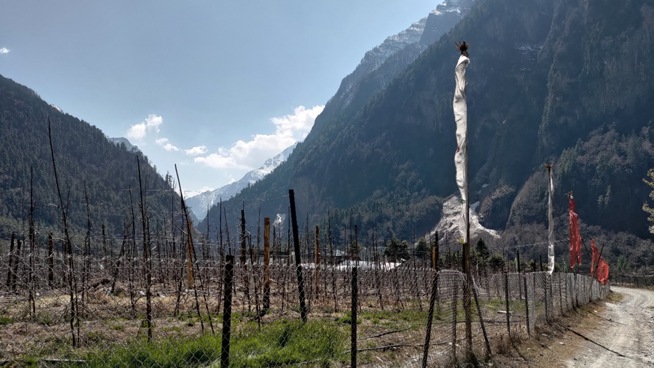 In Bhratang führte die Straße zwischen vielen Apfelbäumen hinein. Bhratang ist ein bekanntes Apfeldorf, hier befindet sich die größte Apfelplantage Nepals. Der Eigentümer hat in 2015 60.000 Apfelbäume aus Italien importiert und hier einpflanzen lassen. Im Dorf gibt es eine Apfelfarm, wo man Äpfel und Produkte aus Äpfeln kaufen kann. Es gibt auch eine große, sehr moderne Lodge. Wir kauften nur 4 Äpfel und liefen weiter.