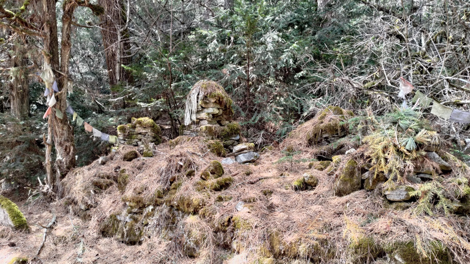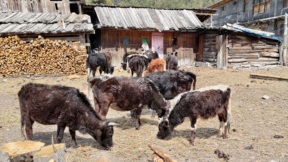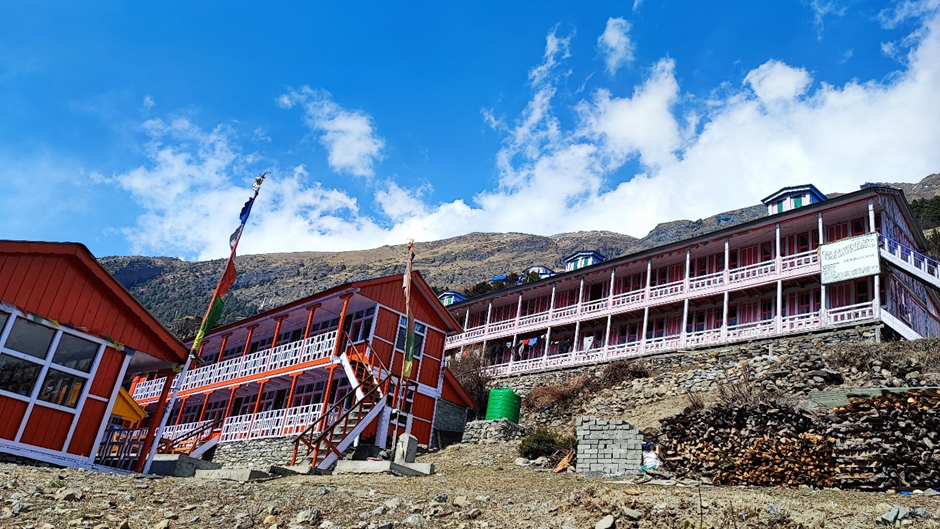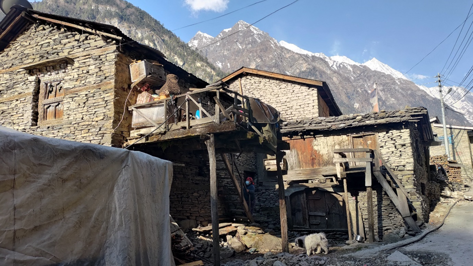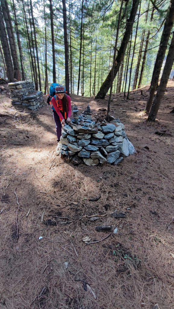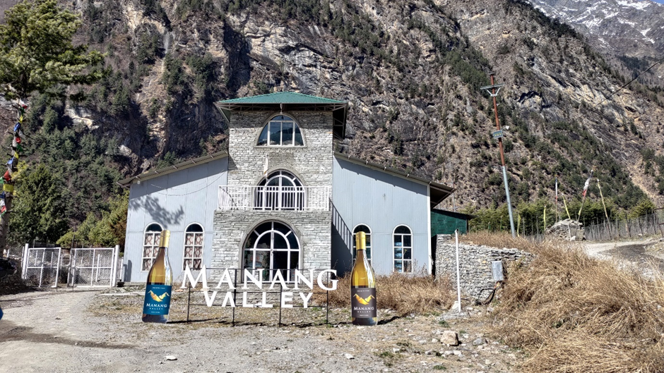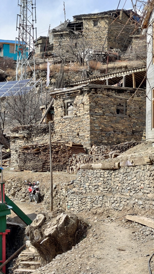 In Bhratang führte die Straße zwischen vielen Apfelbäumen hinein. Bhratang ist ein bekanntes Apfeldorf, hier befindet sich die größte Apfelplantage Nepals. Der Eigentümer hat in 2015 60.000 Apfelbäume aus Italien importiert und hier einpflanzen lassen. Im Dorf gibt es eine Apfelfarm, wo man Äpfel und Produkte aus Äpfeln kaufen kann. Es gibt auch eine große, sehr moderne Lodge. Wir kauften nur 4 Äpfel und liefen weiter.