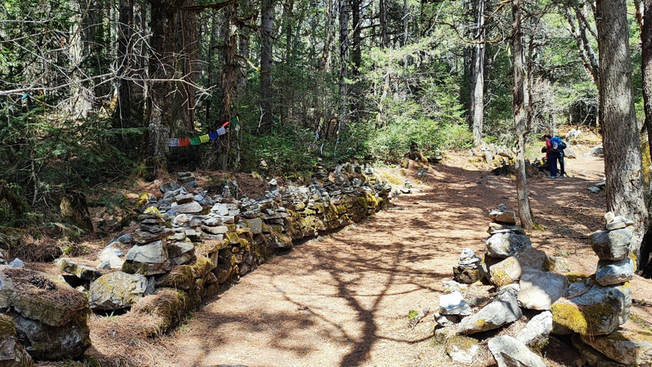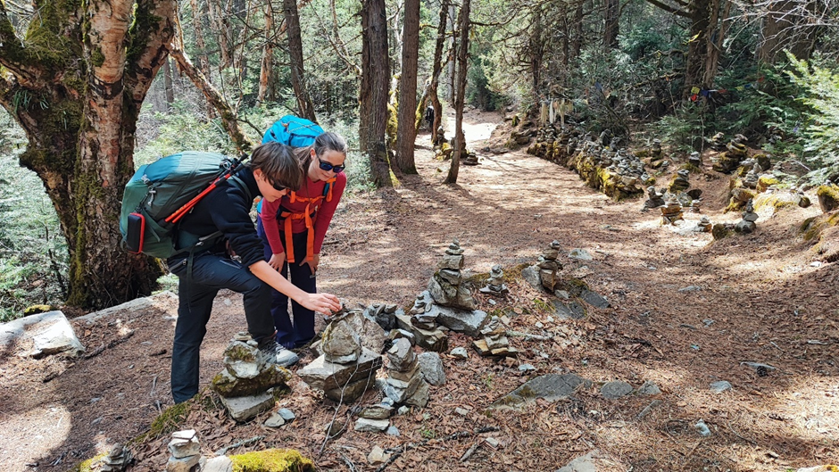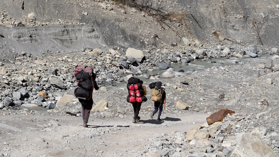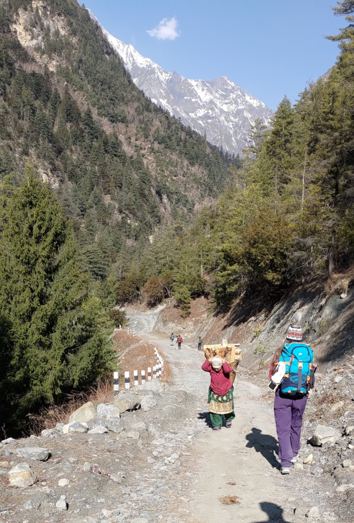 Auf dem Weg trafen wir viele andere Wanderer, öfter auch größere Gruppen. Nepalesen tragen alles in Körben, die sie mit einem Gurt auf dem Kopf tragen.
