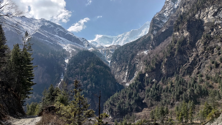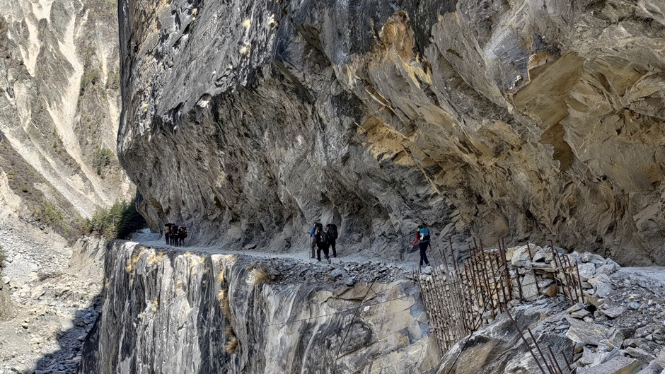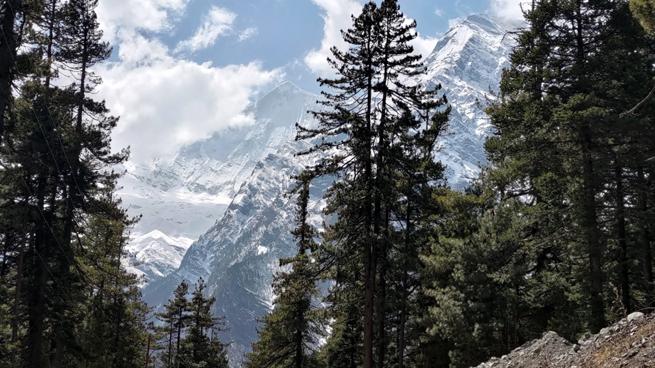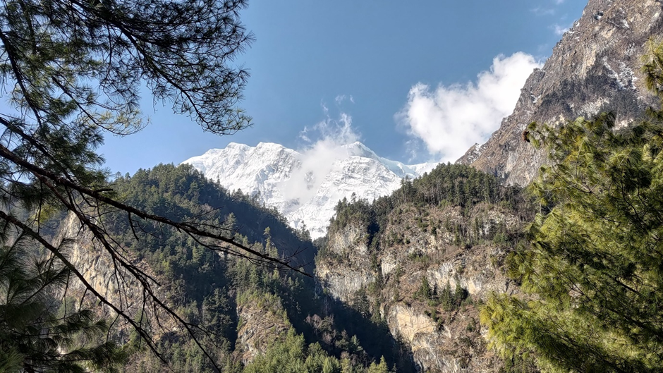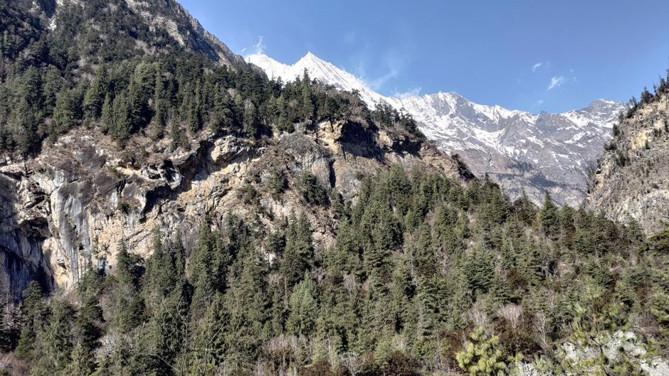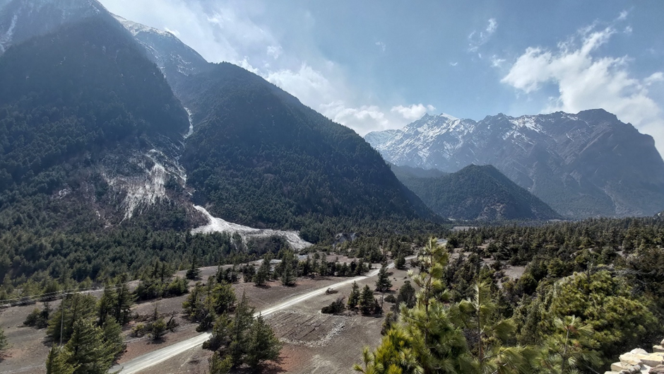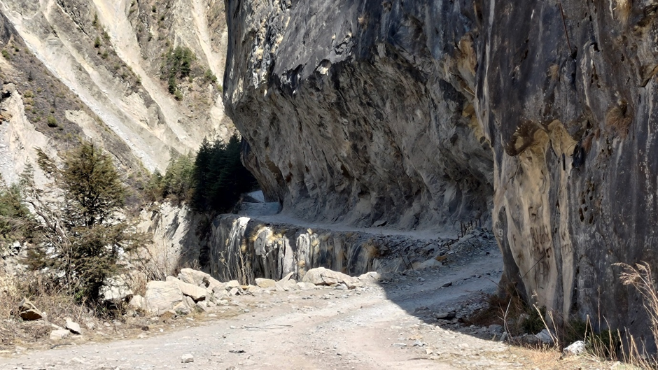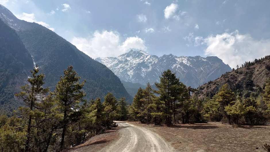 Die Straße sah hier sehr spektakulär aus, sie wurde aus dem Fels heraus gesprengt. Hier hatten wir wieder eine wunderschöne Sicht auf den Annapurna II. Der Trail führte wieder durch schöne Wälder.