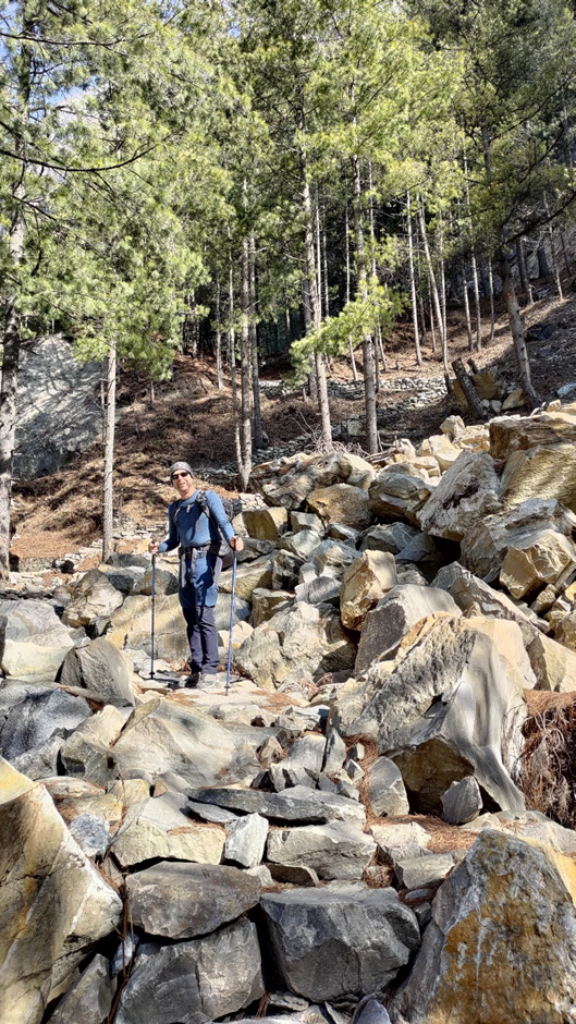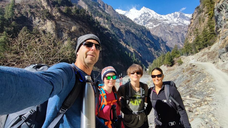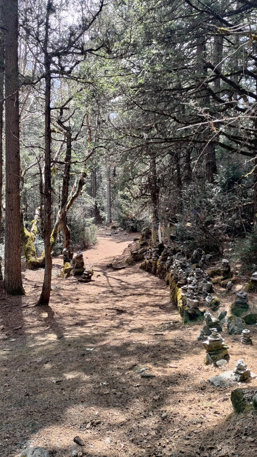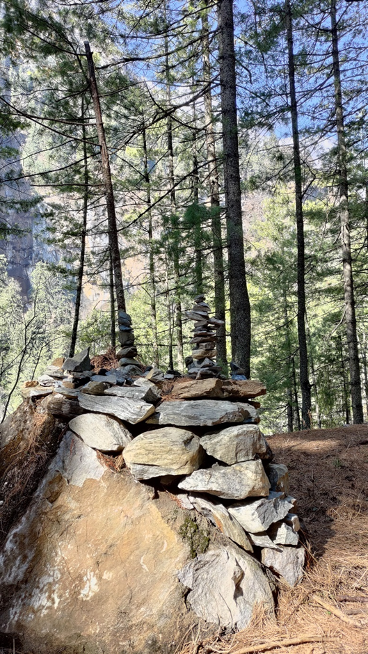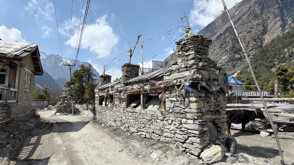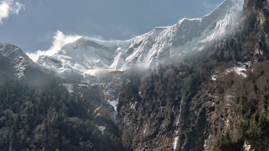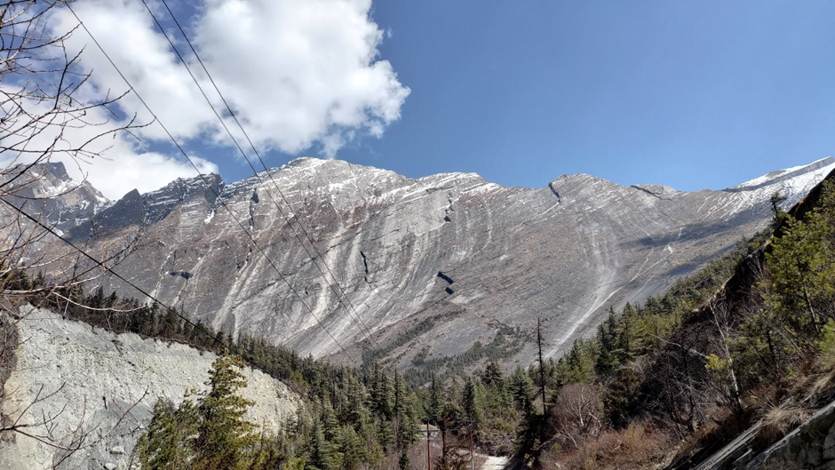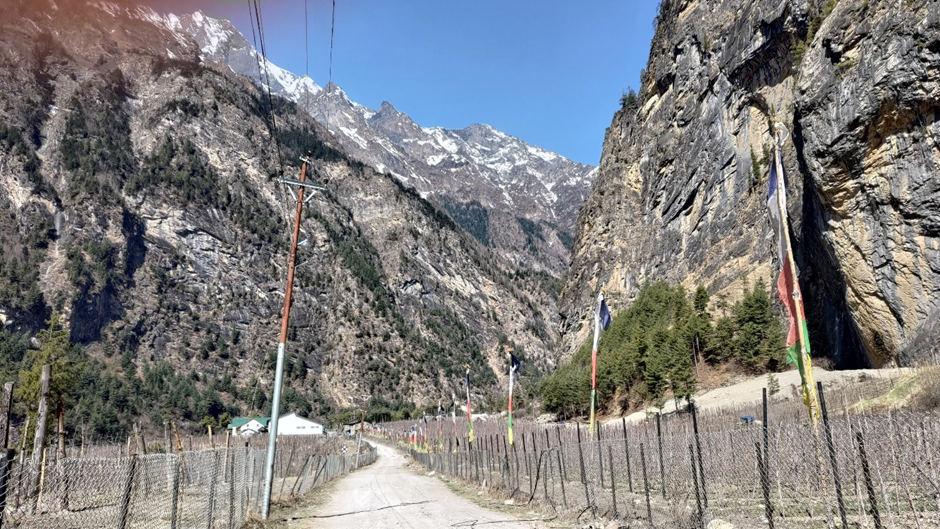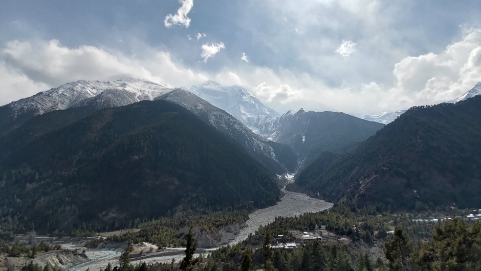 Die Straße sah hier sehr spektakulär aus, sie wurde aus dem Fels heraus gesprengt. Hier hatten wir wieder eine wunderschöne Sicht auf den Annapurna II. Der Trail führte wieder durch schöne Wälder.