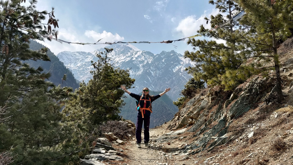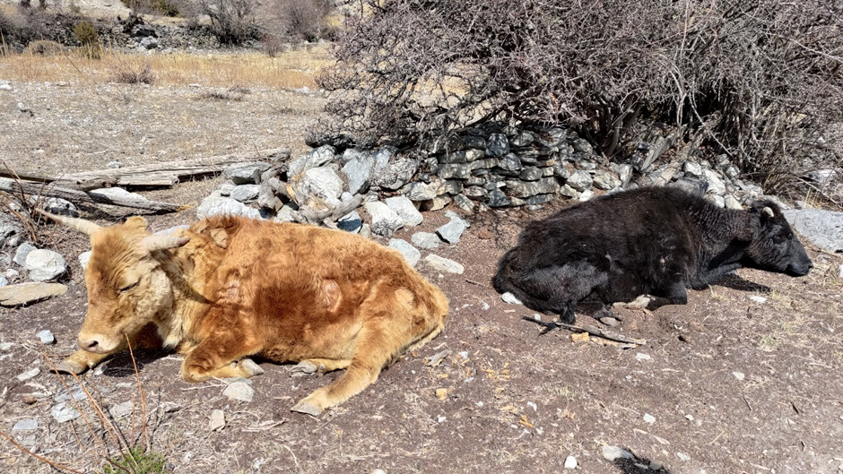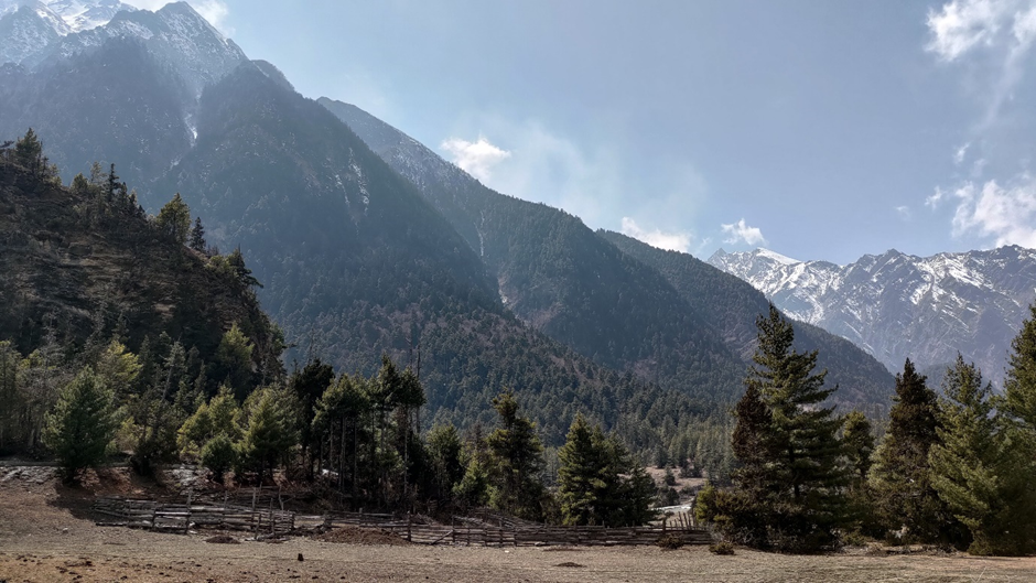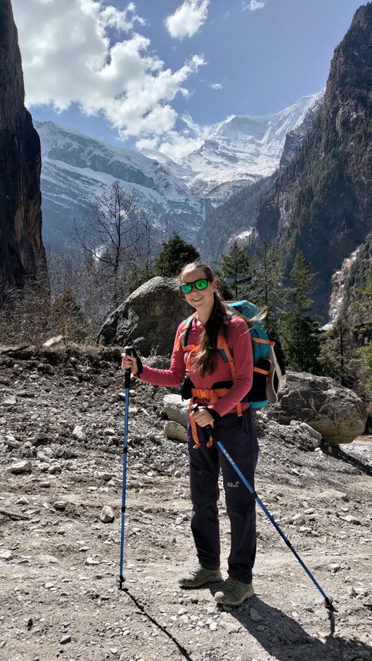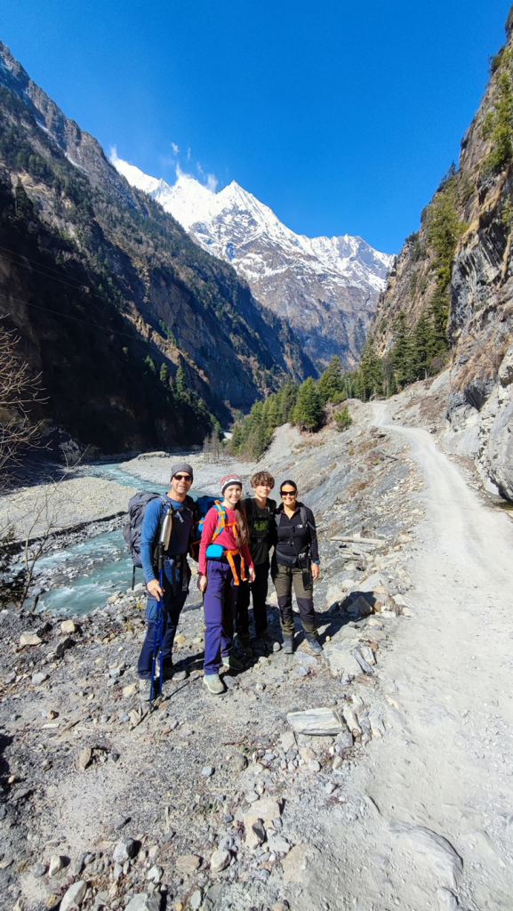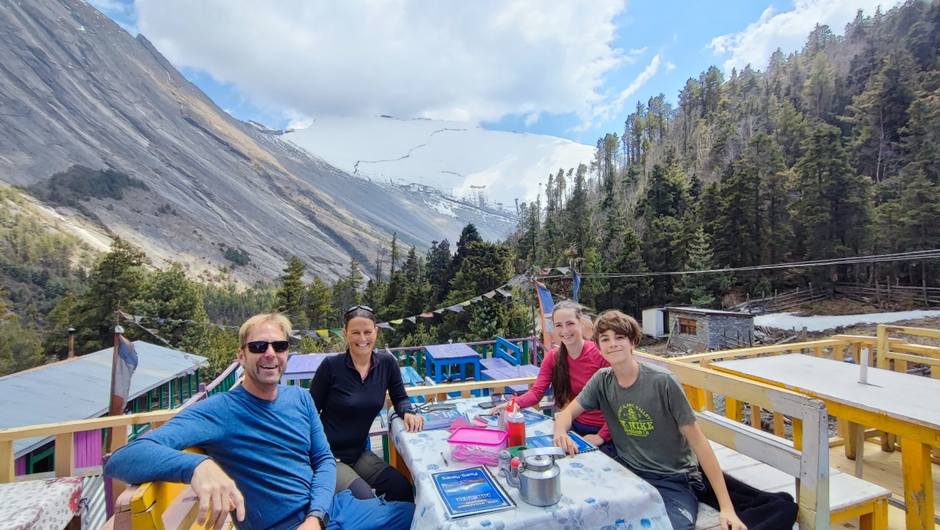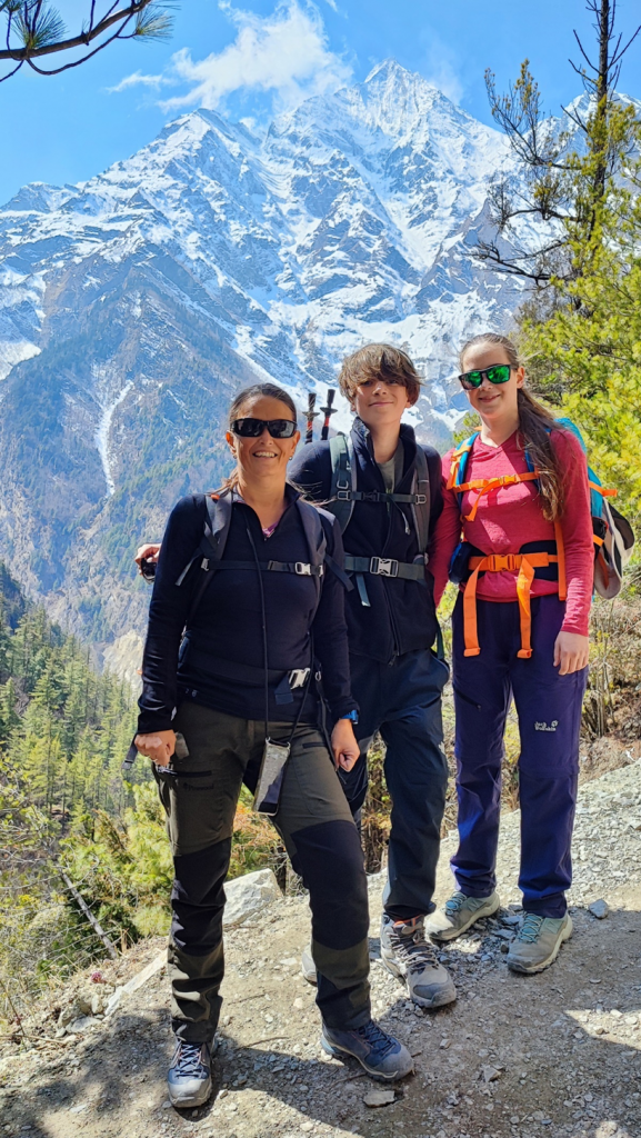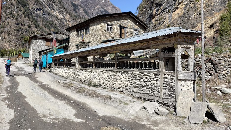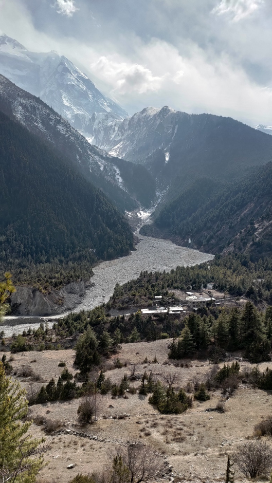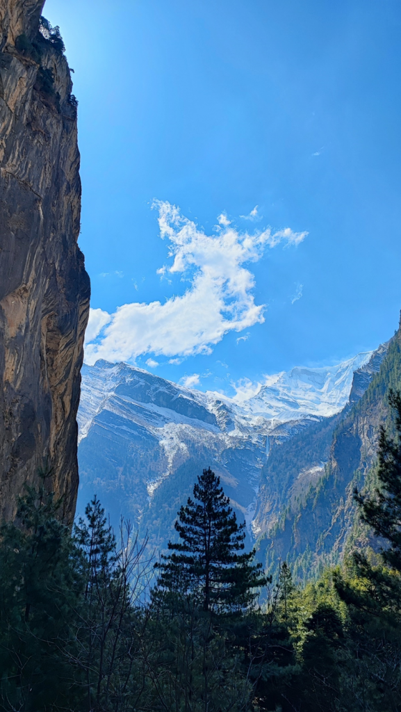 Wir sind heute eine halbe Stunde früher aufgestanden als bisher, weil wir heute einen langen Tag vor uns hatten. Wir wollten bis Upper Pisang kommen, was eine 6-7 Stunden Wanderung mit 650 m Höhenunterschied bedeutete. Das Wetter war wieder perfekt und wir konnten ein bisschen die hohen Berge erblicken.
