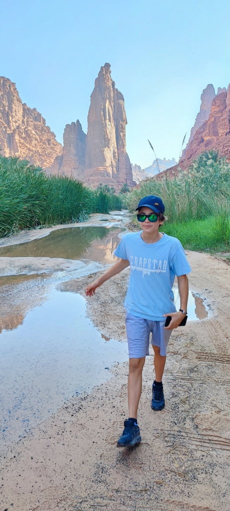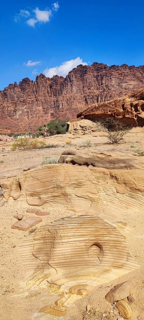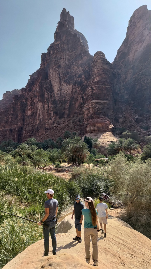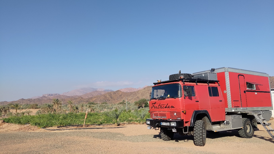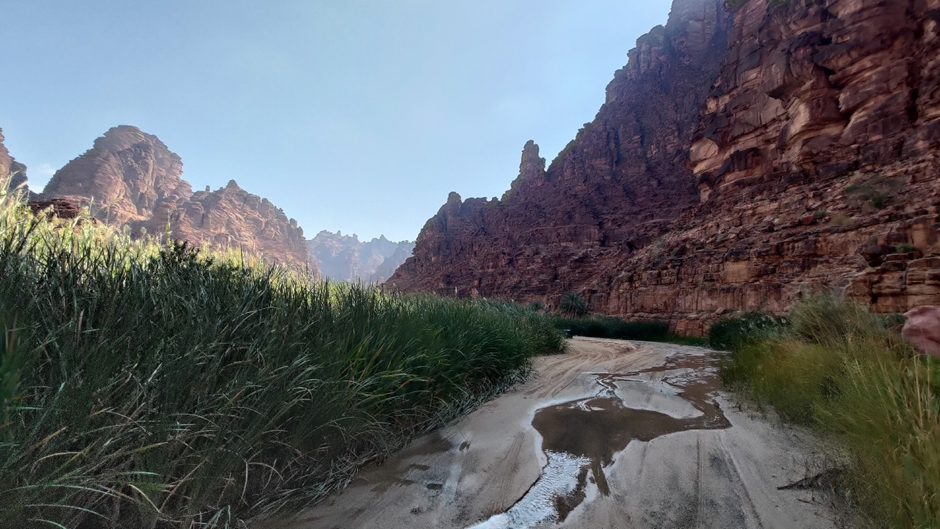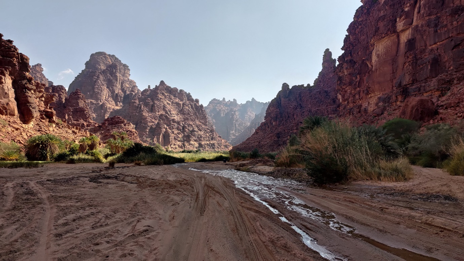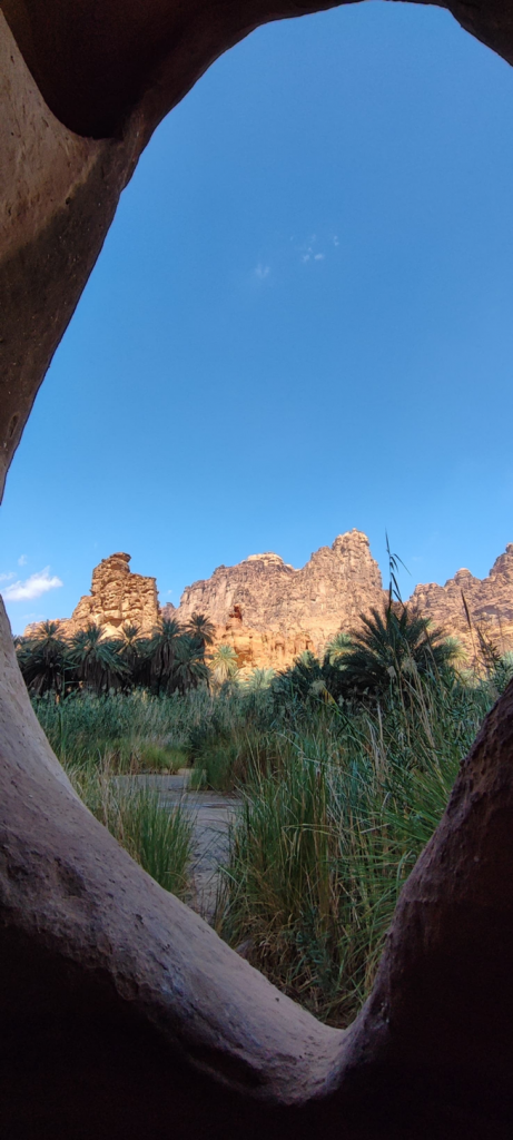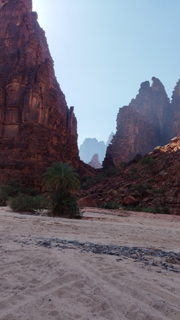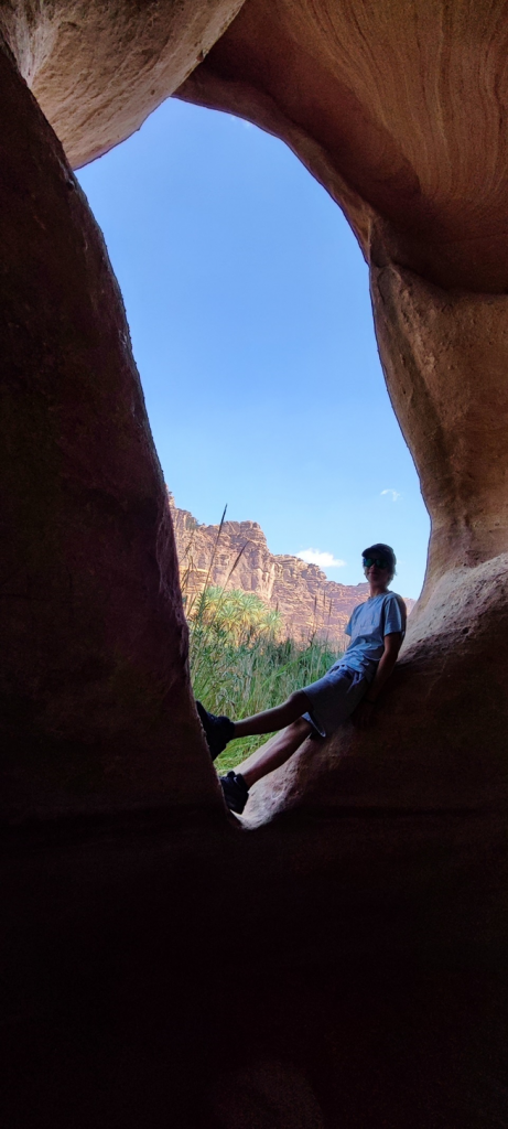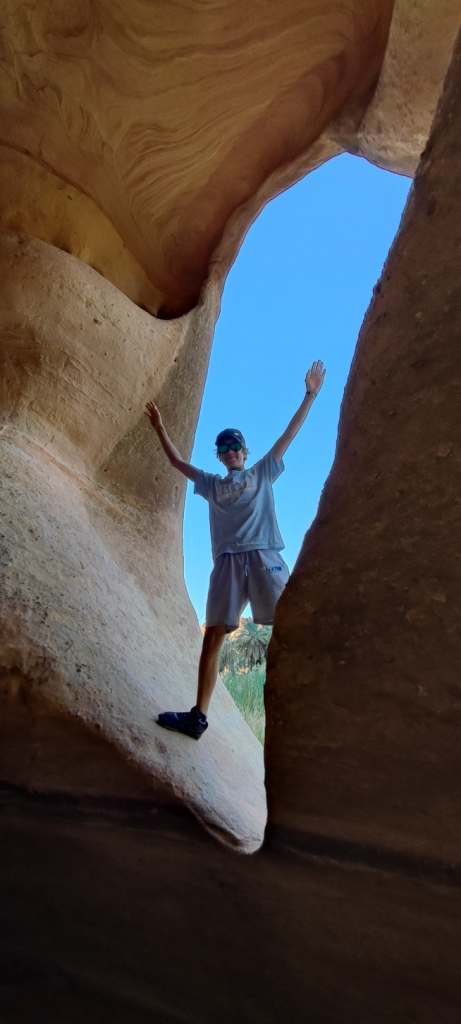 Als wir satt waren, sind wir mit seinem Auto zu Wadi Disah gefahren. Vor der Einfahrt wartete ein Freund von ihm, Ahmed, mit einem offenen Auto, womit wir ins Wadi reinfahren wollten. Bei der Einfahrt standen auch hier Polizisten, die uns auch diesmal, sogar mit dem kleinen 4×4 Auto, nicht reinfahren lassen wollten. Hamoud hat mit ihnen gesprochen und wir durften doch rein. Wie Hamoud erklärte, hatte es letzte Nacht gerechnet und für heute war auch Regen vorhergesagt, deswegen wollte der Polizist uns nicht reinlassen. Bei Regen können hier ganz schnell gewaltige Wassermassen runterkommen, die nicht nur das Wadi, sondern auch die gesamte Gegend überfluten. (Er hat uns später zu Hause Videos von der Flut vom 2021 gezeigt, wo alles um seine Farm vom Wasser bedeckt war. Die Flut hat Autos, Palmen und große Felsen mitgenommen.)