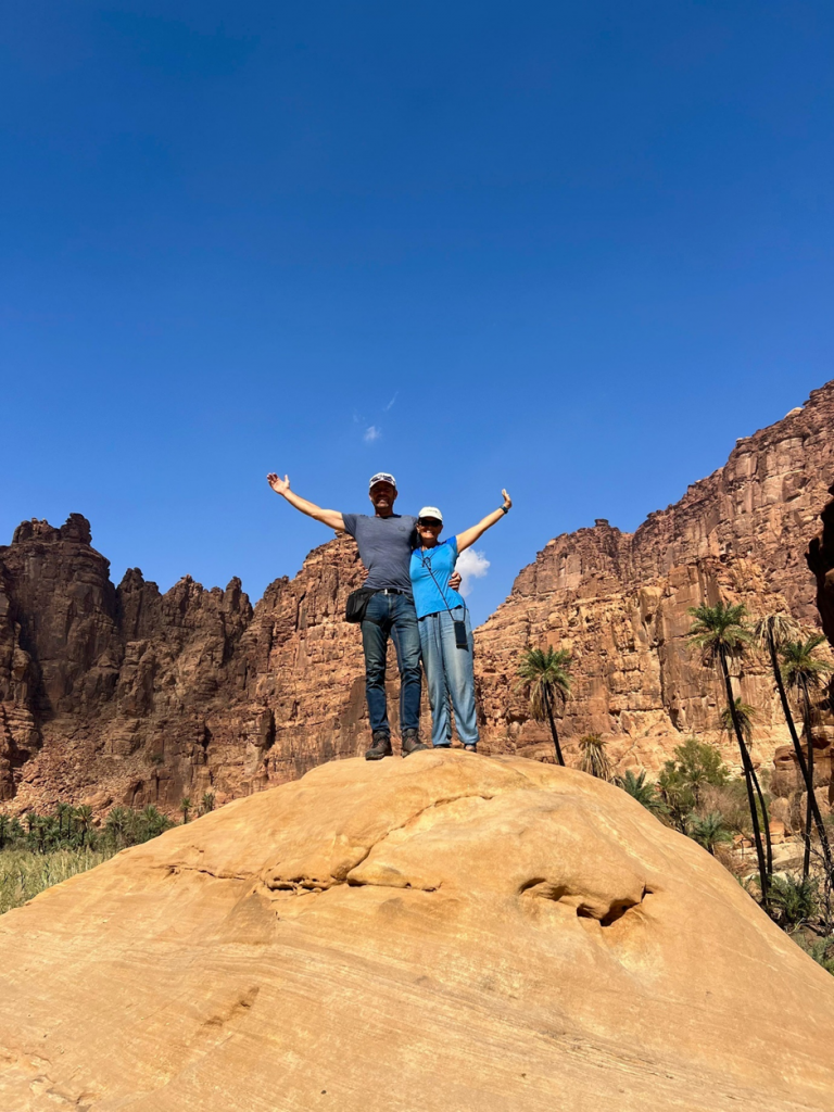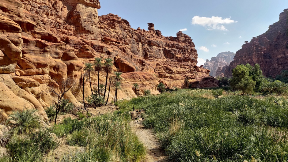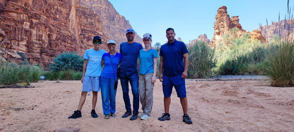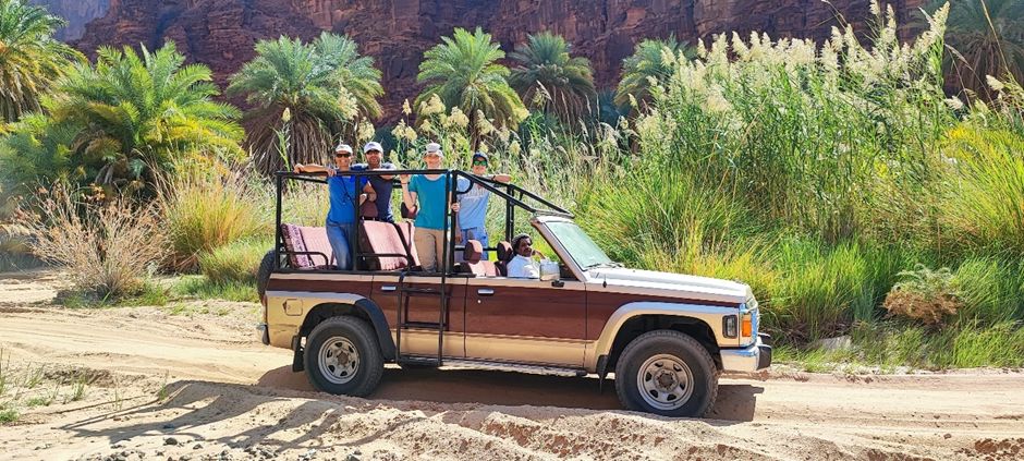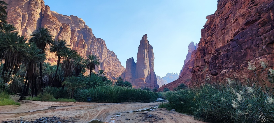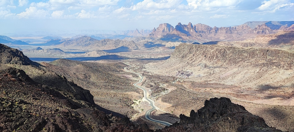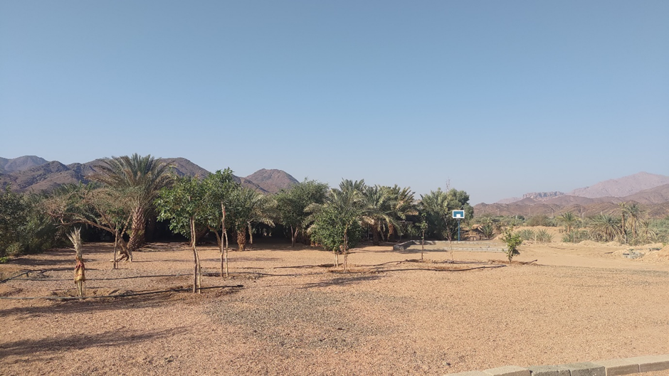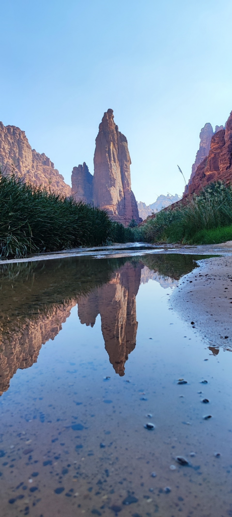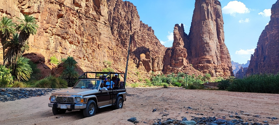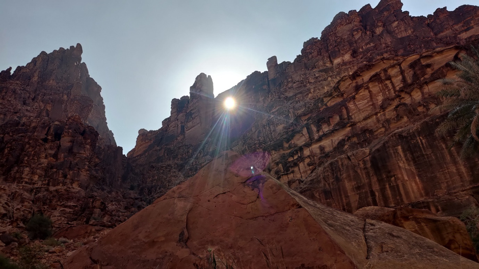 Als wir satt waren, sind wir mit seinem Auto zu Wadi Disah gefahren. Vor der Einfahrt wartete ein Freund von ihm, Ahmed, mit einem offenen Auto, womit wir ins Wadi reinfahren wollten. Bei der Einfahrt standen auch hier Polizisten, die uns auch diesmal, sogar mit dem kleinen 4×4 Auto, nicht reinfahren lassen wollten. Hamoud hat mit ihnen gesprochen und wir durften doch rein. Wie Hamoud erklärte, hatte es letzte Nacht gerechnet und für heute war auch Regen vorhergesagt, deswegen wollte der Polizist uns nicht reinlassen. Bei Regen können hier ganz schnell gewaltige Wassermassen runterkommen, die nicht nur das Wadi, sondern auch die gesamte Gegend überfluten. (Er hat uns später zu Hause Videos von der Flut vom 2021 gezeigt, wo alles um seine Farm vom Wasser bedeckt war. Die Flut hat Autos, Palmen und große Felsen mitgenommen.)
