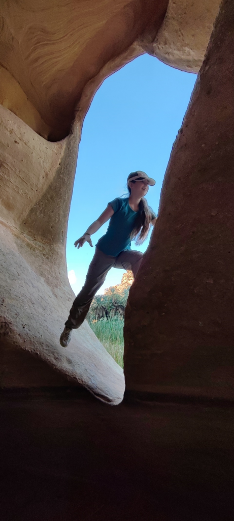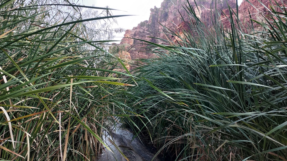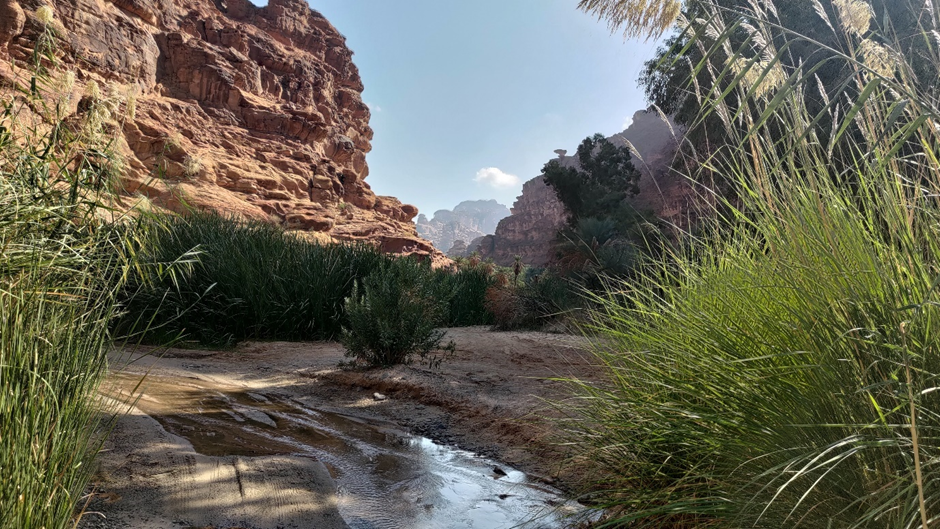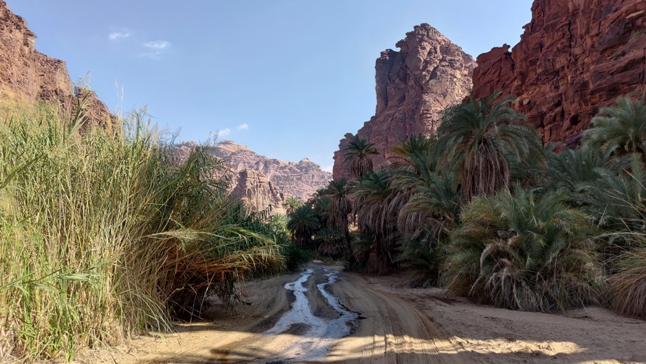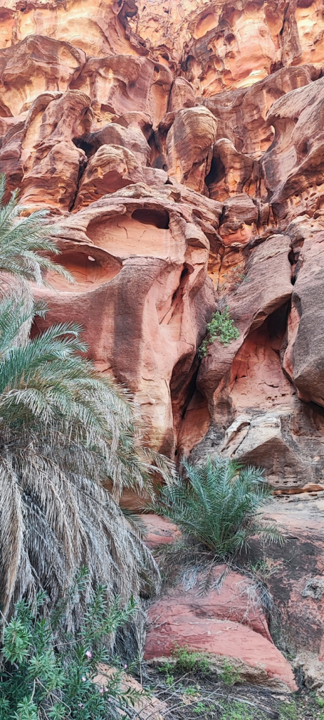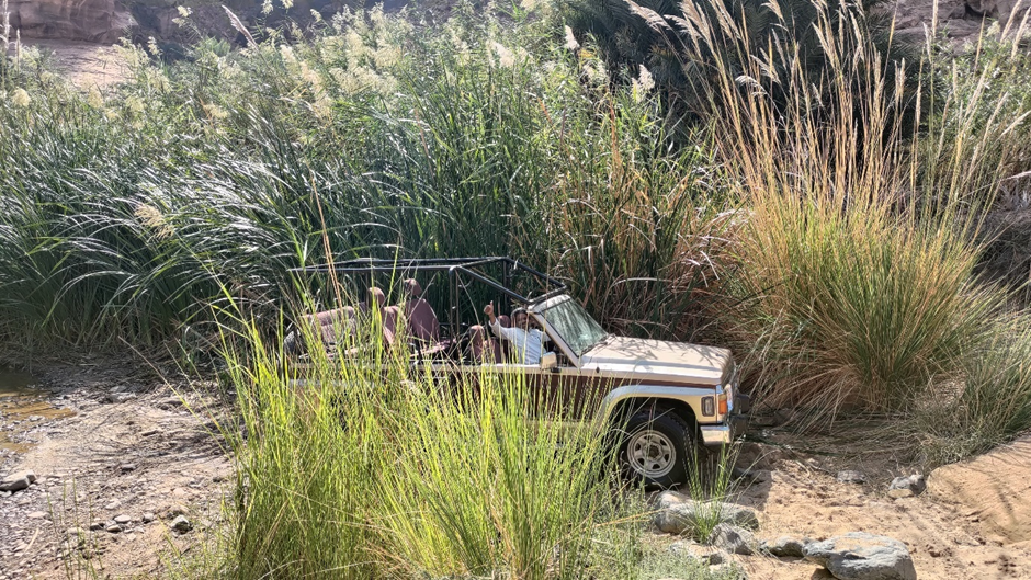Also waren wir drin im Wadi. Links und rechts waren sehr hohe, rote Felswände. Die Wände waren nicht glatt, sondern kunstvoll vom Wasser geformt. Im Tal waren Dattelpalmen und große Schilffelder. Mittendrin plätscherte Wasser. Wir sind mal durch Tiefsand, mal durch Wasser, mal über Felsen gefahren. Es war so unerwartet und so wunderschön.