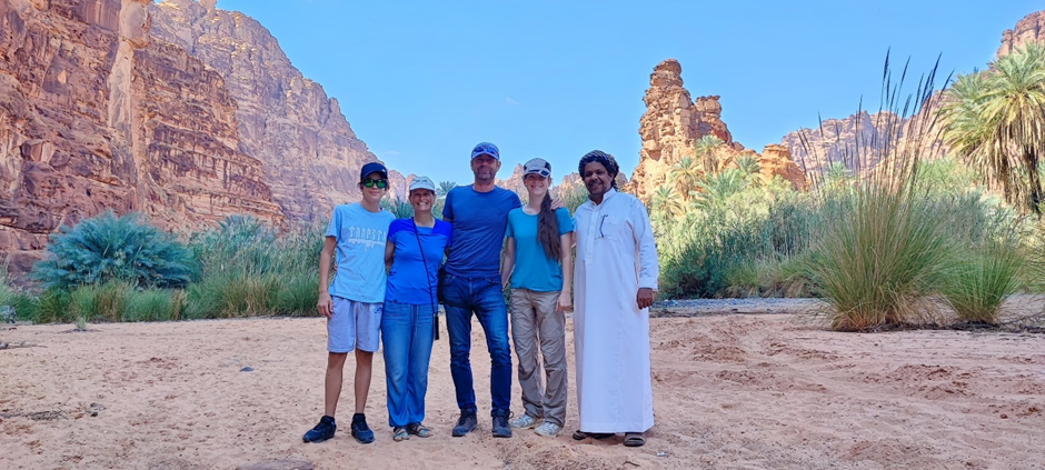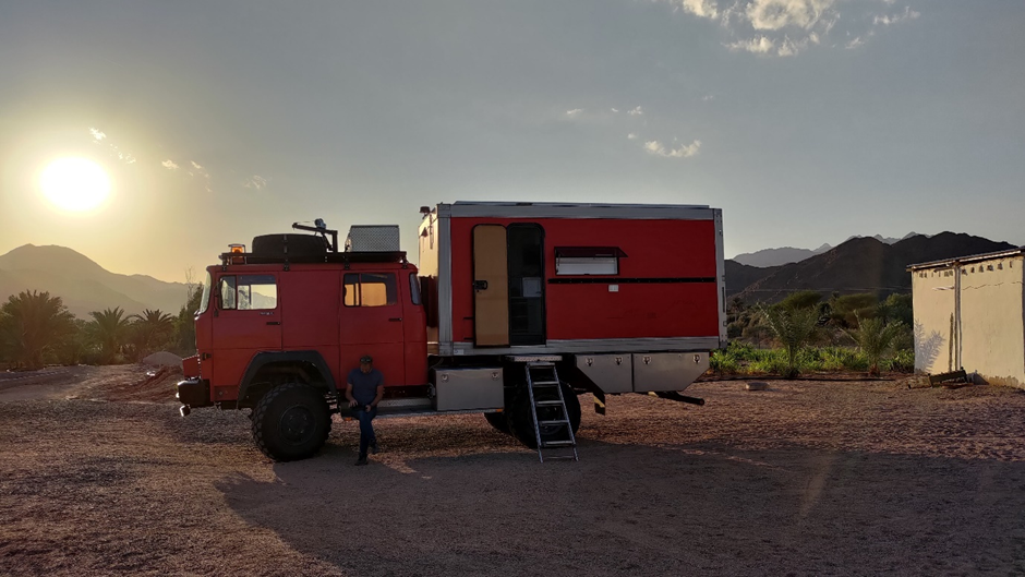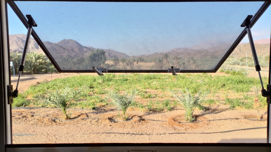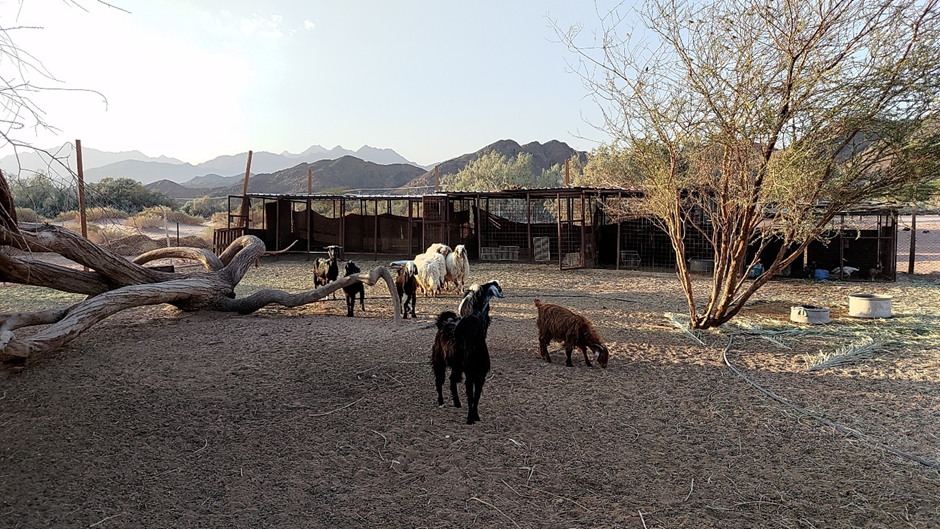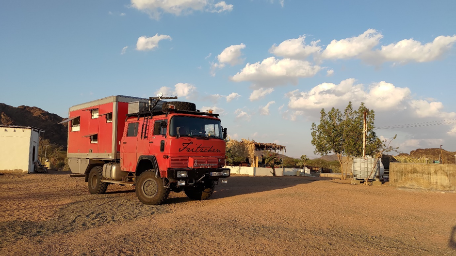 Auf dem Rückweg nach Hause haben wir bei einem Restaurant Mittagessen geholt und zu Hause gemeinsam gegessen. Danach hat uns Hamoud die Farm und wir ihm Fritzchen gezeigt. Mira hat einen Kokos-Nutella-Kuchen gebacken. Abends kamen Hamoud’s Bruder und seine Freude um im Freien gemeinsam zusammen, um ein Abendessen zu kochen und zu essen. Wie Hamoud erklärte, sind sie Wüstenmenschen, seine Familie stammt von hier. Seine Großeltern waren noch Beduinen. Sie sind mit den Tieren (Kamele, Schafe, Ziegen und Esel) dorthin gezogen, wo das Gras wuchs. Sie wussten, wo man Wasserlöcher oder Wasserbecken in den Felsen findet, wo das Wasser manchmal monatelang drin war. Sie hatten nur die Tiere, deren Milch, Datteln und Doum (eine andere Palmenfrucht) zu essen. Als das Öl gefunden wurde, hat sich alles verändert. Seine Familie ist nach Duba gezogen, aber die Farm haben sie behalten. Aus der Familie lebt nur er auf der Farm, aber alle anderen (Männer wie Frauen) kommen immer wieder raus, um in der Natur zu sein. Wenn seine Cousinen mit ihren Freundinnen kommen, muss er weggehen, oder draußen bleiben, da er die Frauen nicht sehen darf. Sie sind dann im Innenhof der Farm, der als Frauenbereich gilt.
