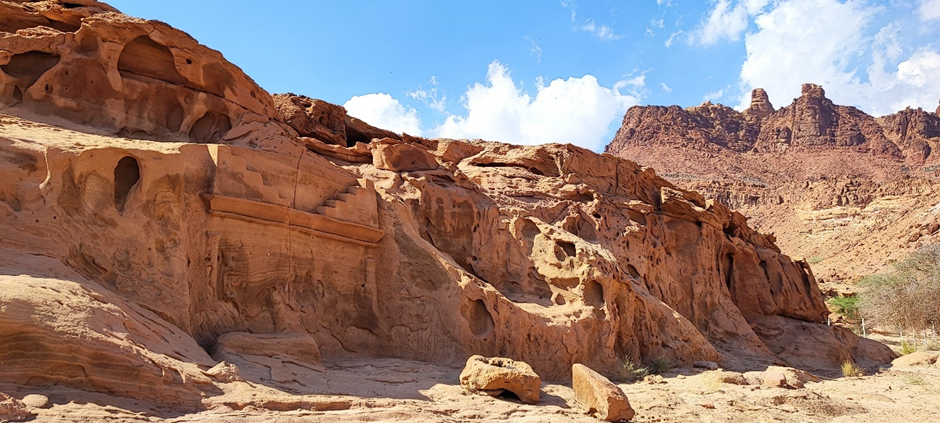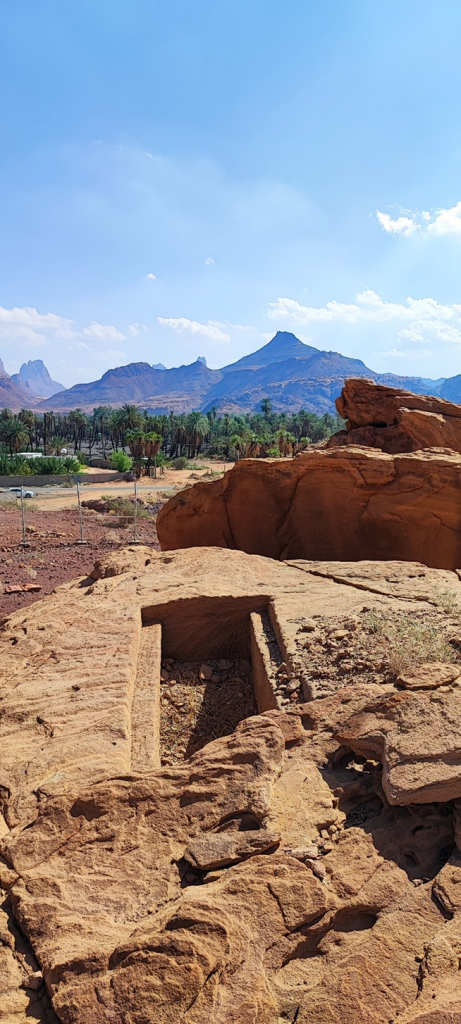 Als wir wieder bei Hamoud’s Auto waren, hat er uns erst zu einer Stelle gebracht, wo früher auch die Nabatäer (wie in Hegra) lebten. Er hat uns ein paar kleinere Gräber gezeigt.