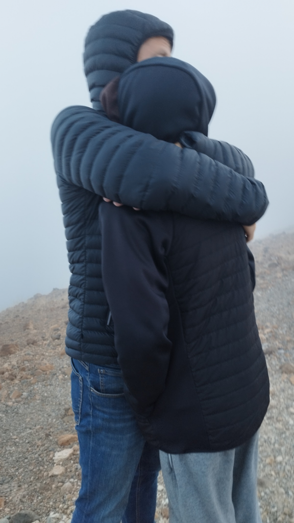 Wir sind tatsächlich Dreiviertelstunde vor Sonnenaufgang aufgestanden. Wir alle. Sogar die Kinder. Draußen war wolkig, windig und kalt. Wir haben gehofft, dass bis wir oben sind, der Wind die Wolken vertreibt. Wir haben ca. 15 Minuten gebraucht, um oben an der Kraterkante anzukommen. Der Weg war sehr steil und bedeckt mit Geröll, es war nicht einfach zu laufen. Wir waren froh, dass wir es nicht versucht haben mit Fritzchen hochzufahren. Auf dem Weg haben wir ab und zu auf Fritzchen zurückgeschaut.