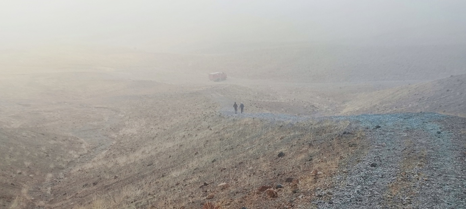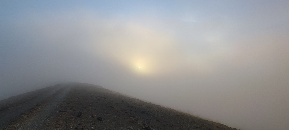 Oben angekommen wurden die Wolken leider nicht weniger, sondern eher mehr. Wir konnten nur erahnen, wo die Sonne aufgeht. Wir haben einen paar Minuten gewartet, aber es wurde nur immer kälter. Wir haben uns entschieden, den Rückzug anzutreten. Zum Glück haben wir Fritzchen im Nebel trotzdem gefunden!