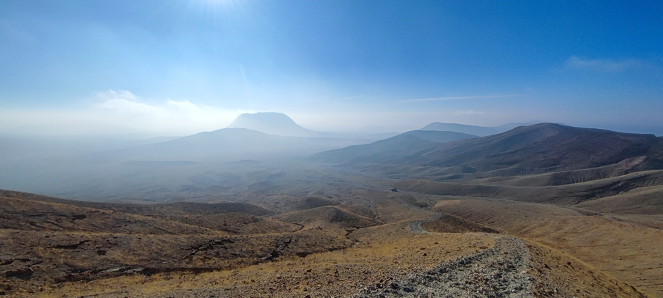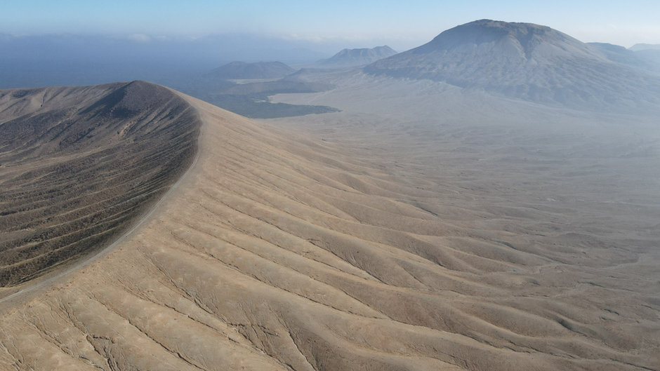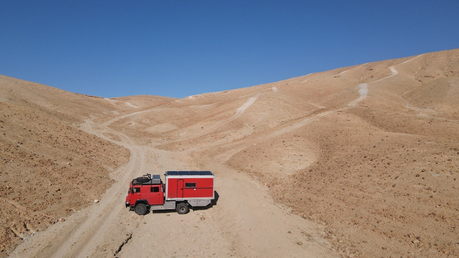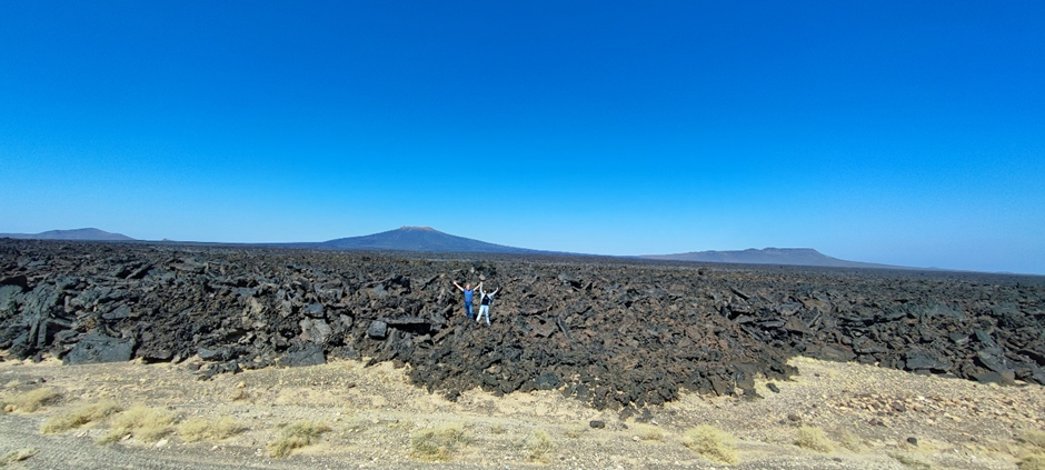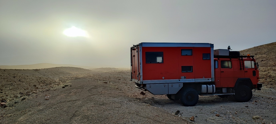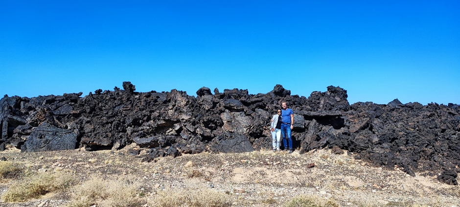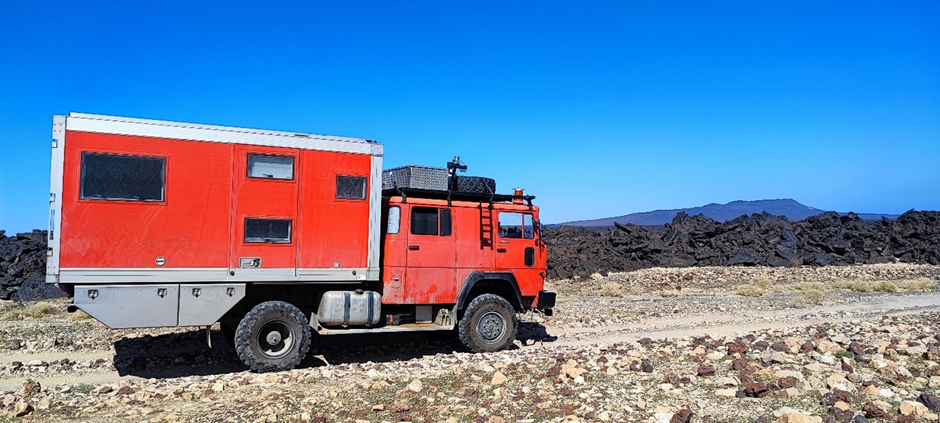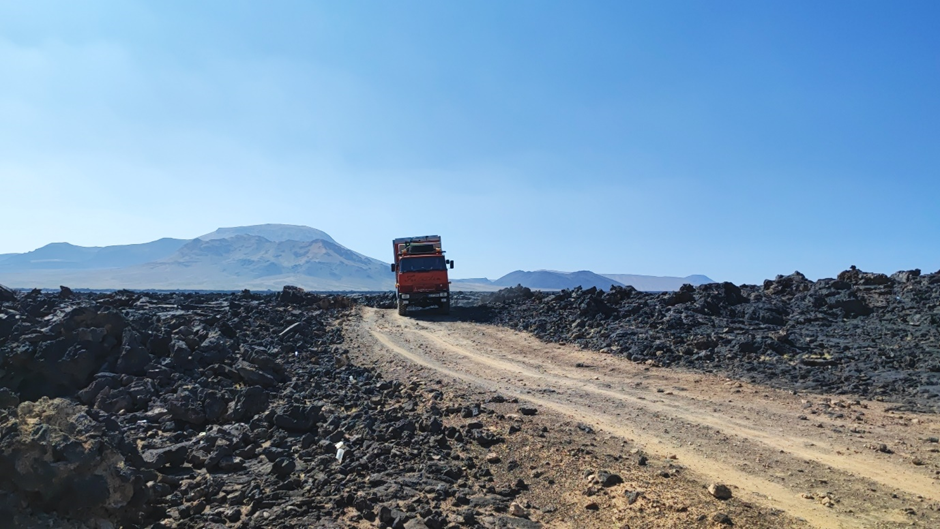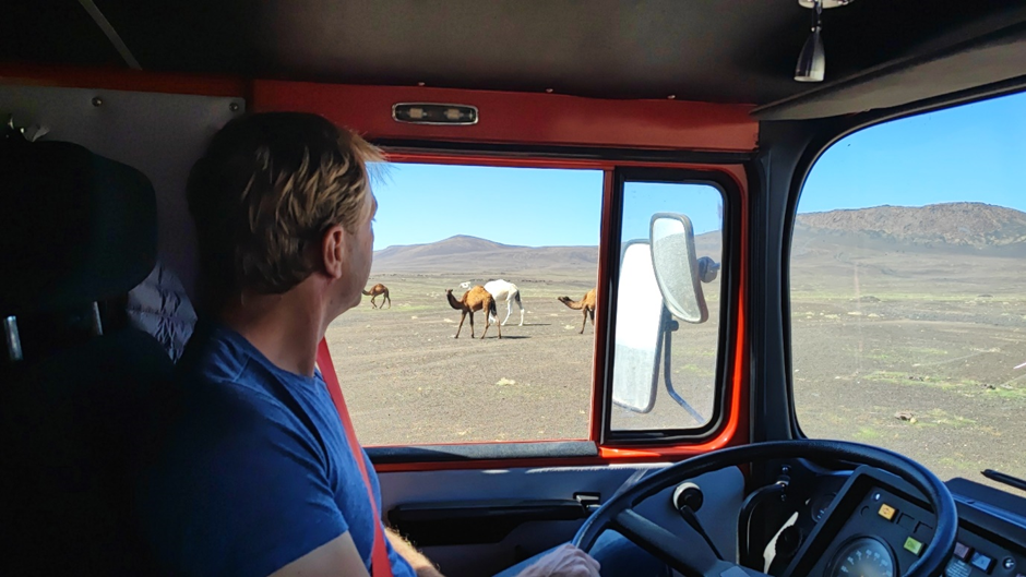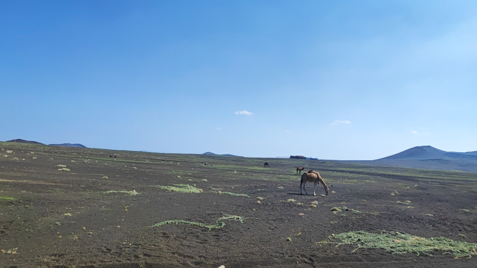 Wir haben fast 2 Stunden gebraucht, um ca. 17 km zu fahren. Es war ein bisschen einfacher, da wir den Weg schon gekannt haben. Wir mussten aber trotzdem höllisch aufpassen, unsere Reifen nicht zu beschädigen. Kurz bevor wir zur Straße angekommen, sind haben wir noch viele Kamele und einen roten Vulkan gesehen.