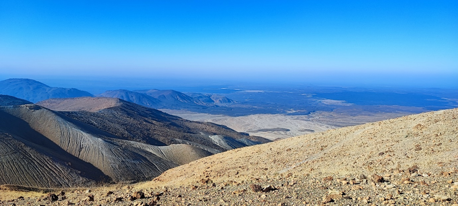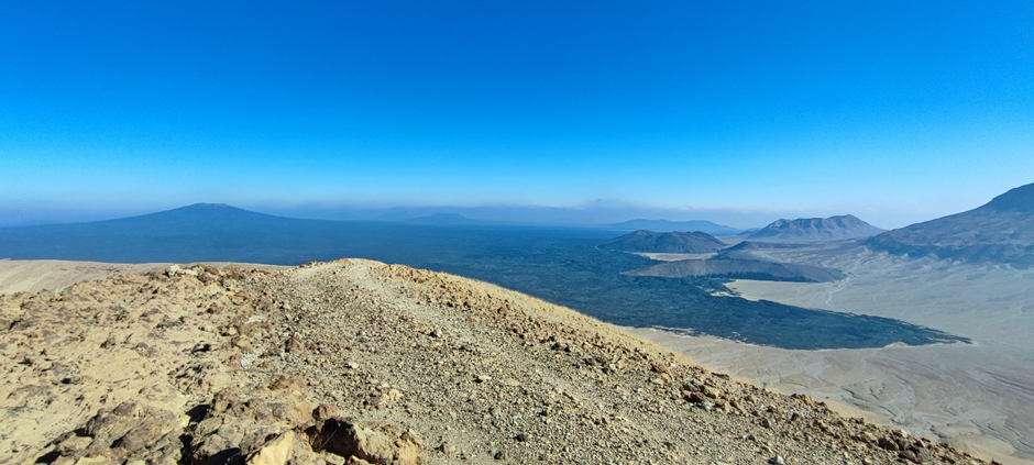 Blick vom Vulkanrand zu den Lavafelder des schwarzen Vulkans: