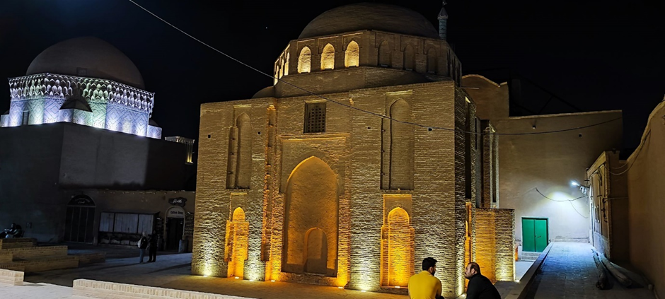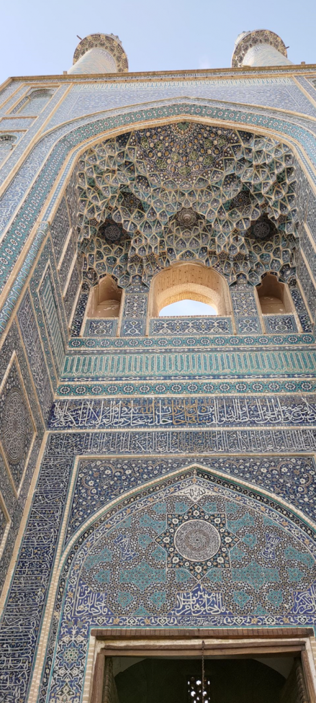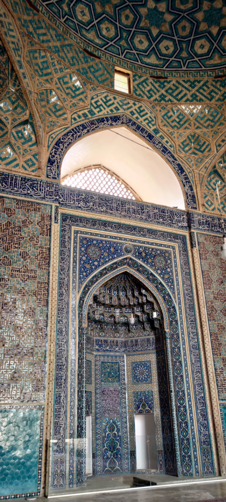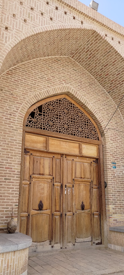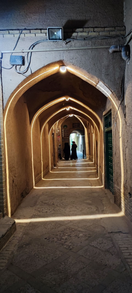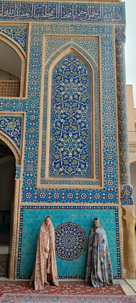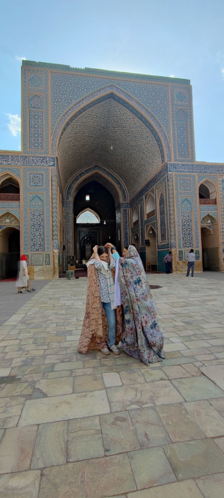 Als Nächstes wollten wir Geld wechseln. Wir hatten die Adresse einer Wechselstube aus IOverlander. Als wir hinliefen, ist uns erst klargeworden, dass sie im Basar ist. Aber auf dem Weg waren fast alle Läden des Basars zu. Natürlich auch die Wechselstube. Die Straßen waren auch fast leer. Klar, es war kurz nach Mittag, das Leben steht in der größten Hitze still. Erst Abends werden die Läden wieder geöffnet. Wir haben doch eine offene Wechselstube gefunden. Der Kurs war zwar ziemlich schlecht, aber wir hatten wieder Rial. (Wie ich schon erzählt habe, funktionieren in Iran die Kreditkarten leider nicht.) Wir sind dann in die Altstadt gelaufen. Wir wollten die Jameh-Moschee besuchen. Hierzu mussten Mira und ich iranische Hijabs anziehen: Bunte bodenlänge Kopftücher. Wir sahen ziemlich lustig aus.