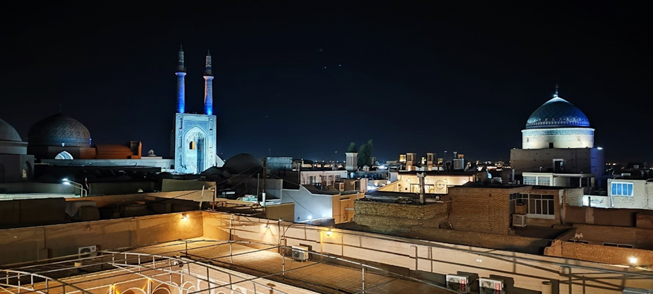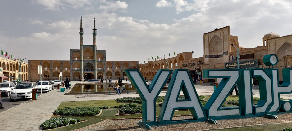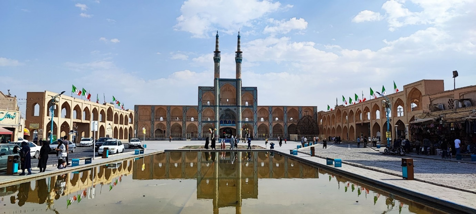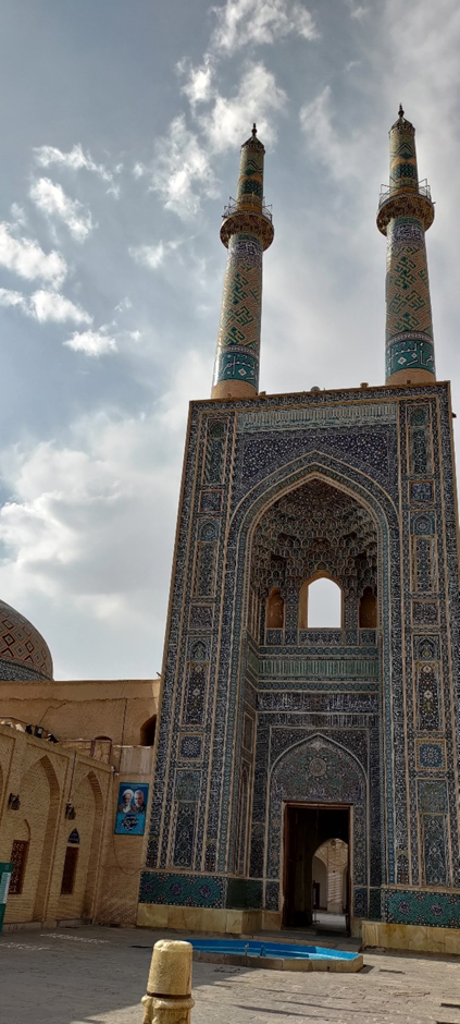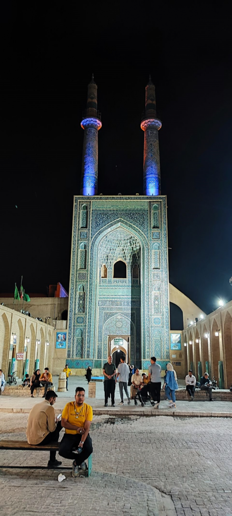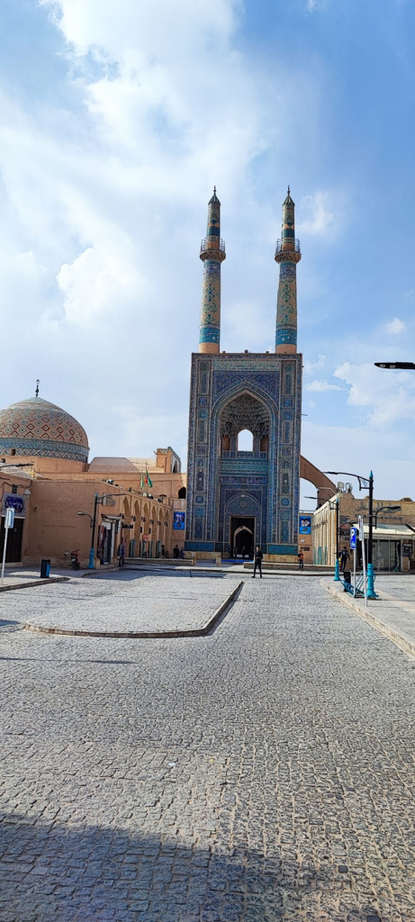 In Yazd angekommen, war es schon Mittag und affenheiß. Wir haben bei einem Park geparkt und sind in die Stadt gelaufen. Als Erstes sind wir zu dem dreistöckigen Amir-Chakhmaq-Moscheekomplex gelaufen. Drinnen waren kleine Restaurants, wo Marc gleich Getränke gekauft hat.