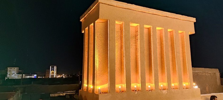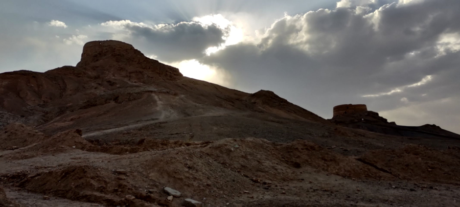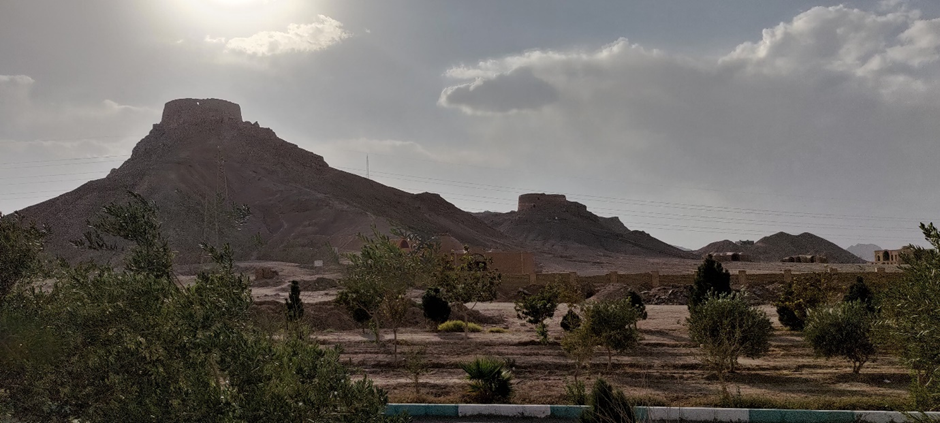 Als wir im Innenhof überlegt haben, was wir als nächstes anschauen sollten, kam ein Iraner auf uns zu. Er hat erzählt, er sei Guide und hat uns einige Vorschläge gemacht, was wir besuchen sollten. Er hat uns empfohlen, in der Mittagshitze aus der Stadt rauszufahren (z.B. zu den Türmen der Stille) und erst nach Sonnenuntergang zurückzukommen, wenn alles wieder offen ist und die Straßen und Gebäude schön beleuchtet sind. Wir sind seinem Rat gefolgt und sind zu Fritzchen zurückgelaufen, um zu den Türmen der Stille zu fahren. Die Türme der Stille sind die Orte, wo früher die Zoroastrier ihre Toten hingebracht haben. Aber warum haben sie es getan? Warum haben sie sie nicht beerdigt oder verbrannt? Der Grund liegt in ihrer Religion. Sie glauben an einen Gott (Ahura Mazda), aber sie achten auch die vier heiligen Elemente: Feuer, Wasser, Erde und Luft. Wenn sie ihre Tote verbrennen würden, würden sie die Luft beschmutzen. Wenn sie sie beerdigen würden, würde sie die Erde verunreinigen. Deshalb legten sie sie auf die Türme der Stille. Dort wurden die Toten von Geiern bis zum Knochen abgenagt. Heute dürfen sie dieses Ritual nicht mehr so durchführen. Stattdessen begraben sie ihre Toten in mit Beton ausgekleideten Särgen. Der Ort ist trotzdem bis heute sehr beindruckend.