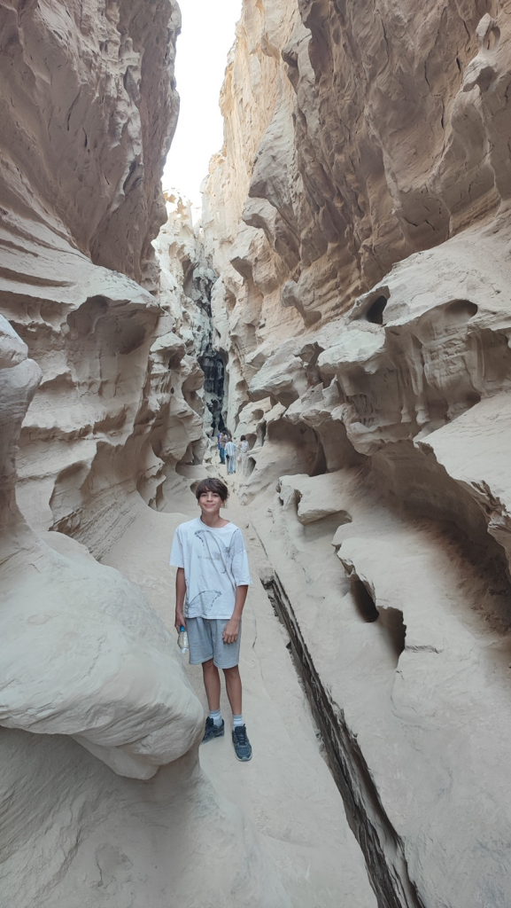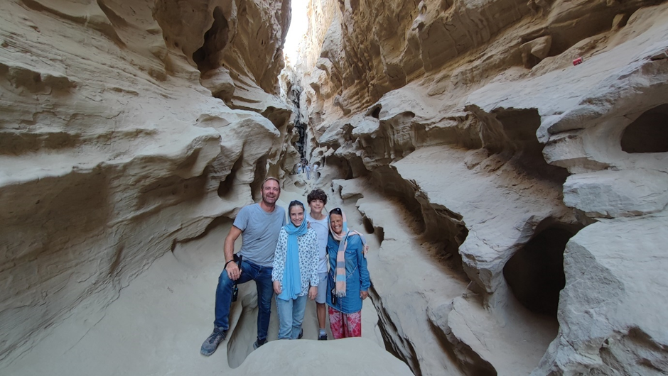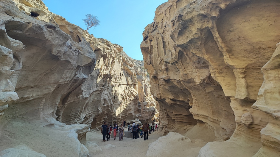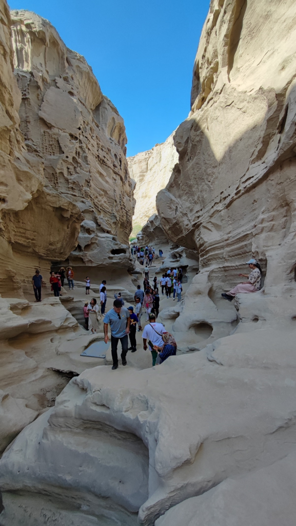 Der Parkplatz war relativ voll, also wir ahnten schon, dass wir nicht alleine sein werden. Wir waren trotzdem nicht darauf vorbereitet, was auf uns wartete. Direkt neben dem Parkplatz gab es Marktstände, wo man Getränke, Süßigkeiten und farbige Kleider und Masken kaufen konnte. Die Leute liefen in dichten Scharen zu den Canyon. Es war sehr heiß. Als wir im Canyon ankamen, wurde es schattiger uns so etwas erträglicher. Aber der Canyon war natürlich auch voll mit Menschen. Wir wissen, wir sind verwöhnt, aber wir hatten die meisten schönen Orte in der letzten Zeit nur für uns oder mussten sie nur mit einer Handvoll Leuten teilen. Qeshm ist allerdings so eine Art Urlaubsinsel für die Iraner, vor allem im Winter, wo es im größten Teil des Landes kalt ist. Hier ist es schön warm, die Landschaft reizend und noch dazu kann man hier dank der Freihandelszone günstig schöne Sachen einkaufen. Das bedeutet, dass die Insel in der Hochsaison von Dezember bis März viele iranische Touristen hat, was wir bisher im Iran so nicht erlebt haben.