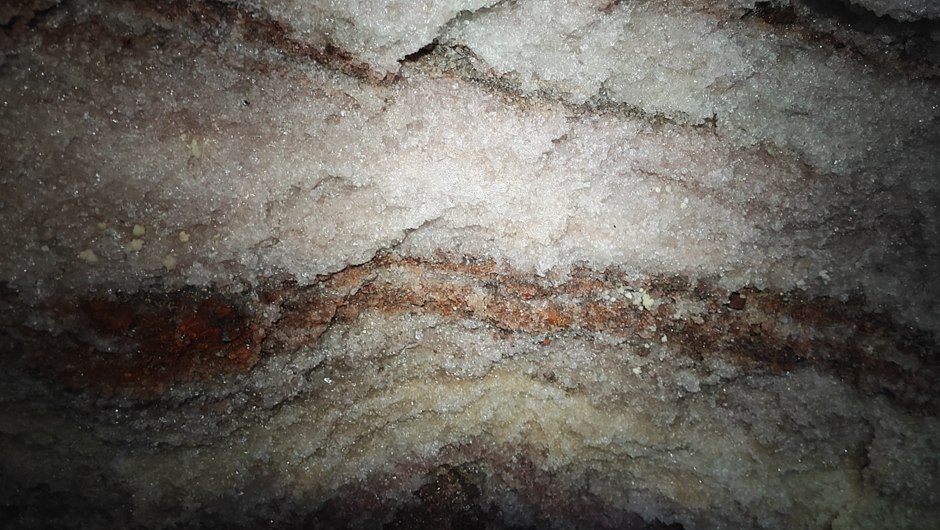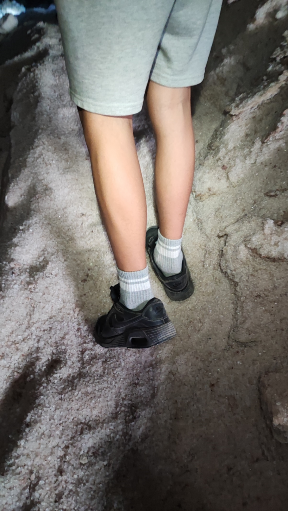 Der Boden war bedeckt mit rosanen Salzkristallen (Himalayasalz), die verschiedene Mineralien enthielten. Wir liefen auf Salzbergen in der Höhle.