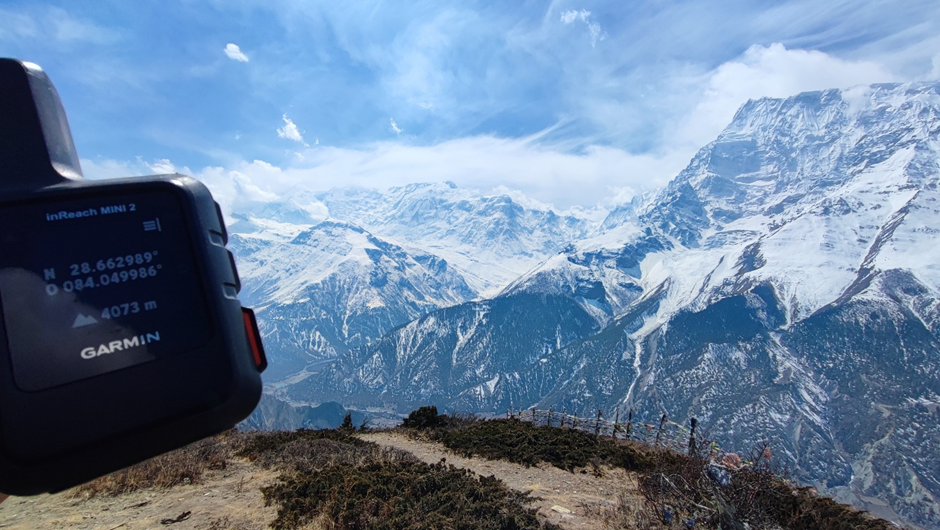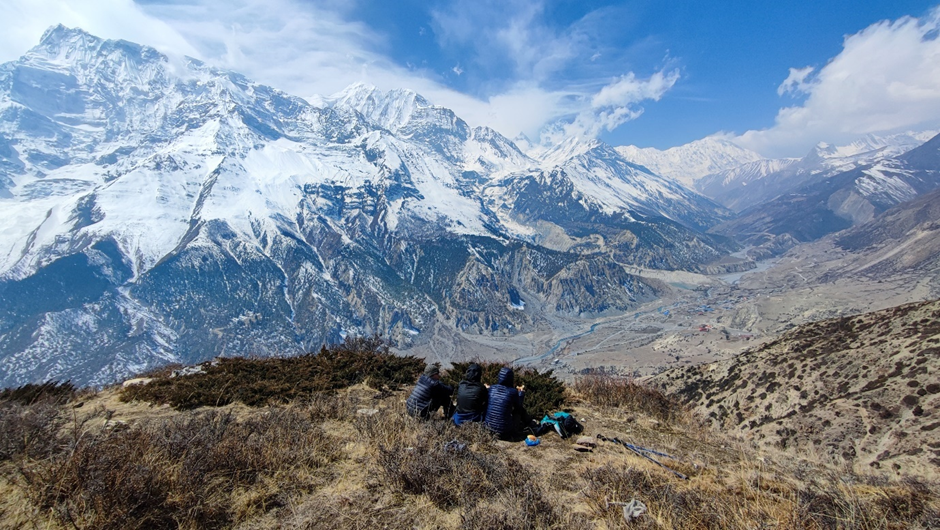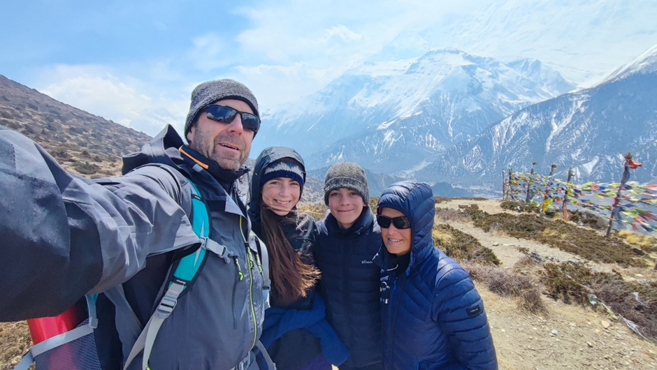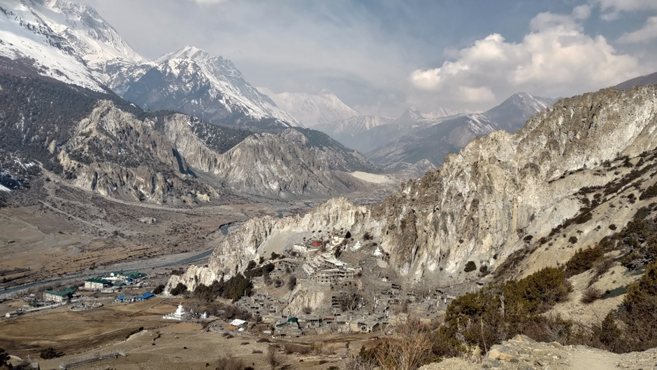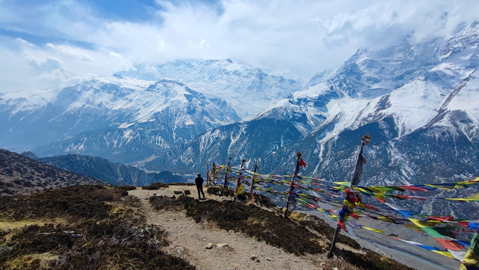 Wir liefen höher und höher und die Aussicht war trotz Wolken sehr beeindruckend. Oben, kurz vor dem Aussichtspunkt mit den vielen Gebetsfahnen wurde es extrem windig, wir konnten uns kaum auf den Füßen halten. Aber wir konnten viele sehr hohe Gipfel und gleichzeitig die Dörfer im Tal sehen.