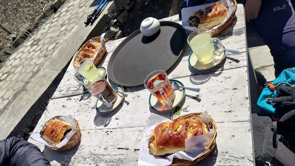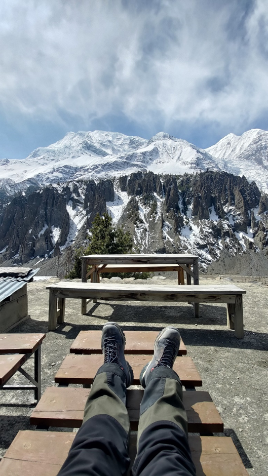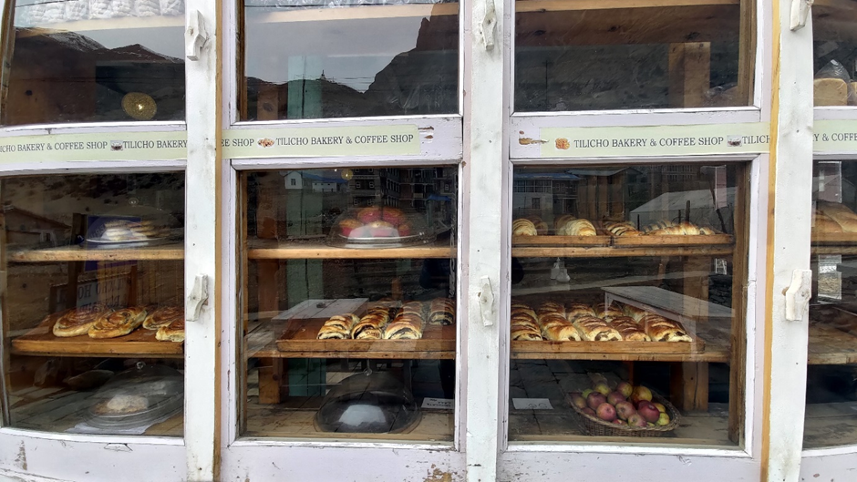 Wir haben ihn überzeugt, wenigstens erstmal bis nach Manang zu wandern. Dort haben wir die notwendigen Sachen besorgt, aber danach war Marius auch nicht besser drauf. Wir haben eine Bäckerei mit einer sehr ansprechenden Auswahl von Produkten im Schaufenster gesehen und uns entschieden, uns dort uns hinzusetzen. Wir haben Schoko- und Apfelkissen und heiße Getränke bestellt und besprochen, was wir jetzt machen.