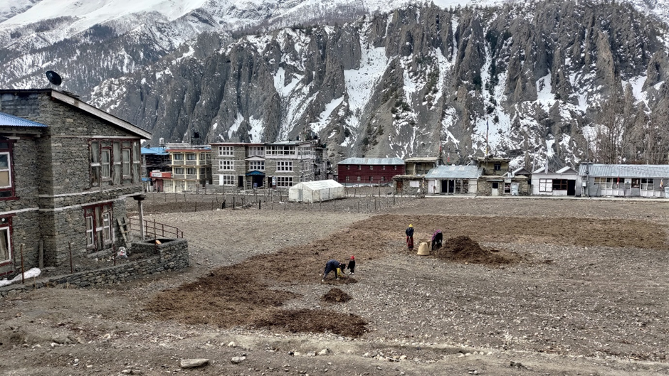 Marc ging es gut, mir hat den Medikament von unserem Host auch gut geholfen. Wir haben beide gut geschlafen und füllten uns fit. Mira hatte aber wieder Bauchweh und hat beim Frühstück kaum was runtergekriegt. Sie hat sich irgendwie gesammelt und wir liefen los. Wir haben nicht mal das 1 km entfernt liegende Manang erreicht, als Marius angefangen hat, sich zu beschweren. Sein Rücken tat weh und er fühlt sich sehr schnell müde und außer Atem. Er wollte heute nirgendwohin laufen.