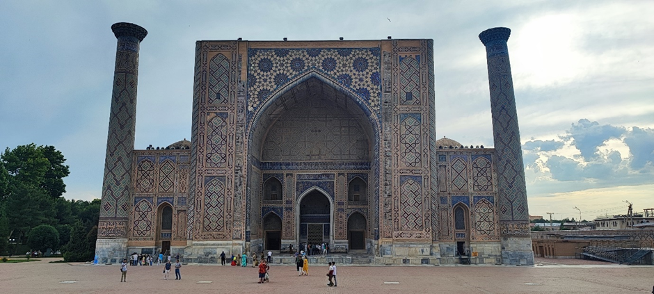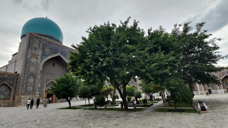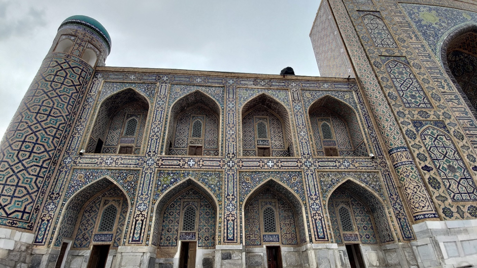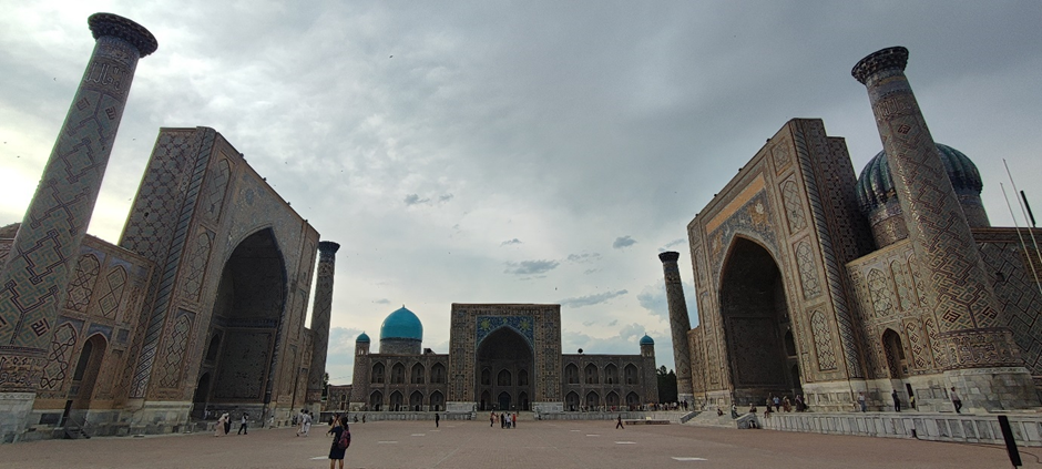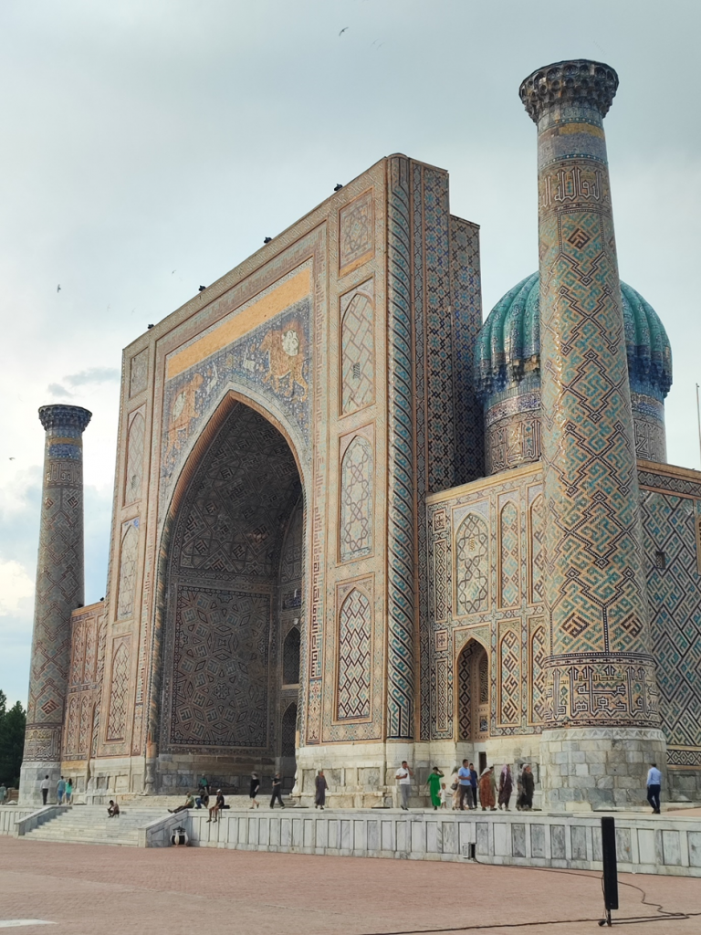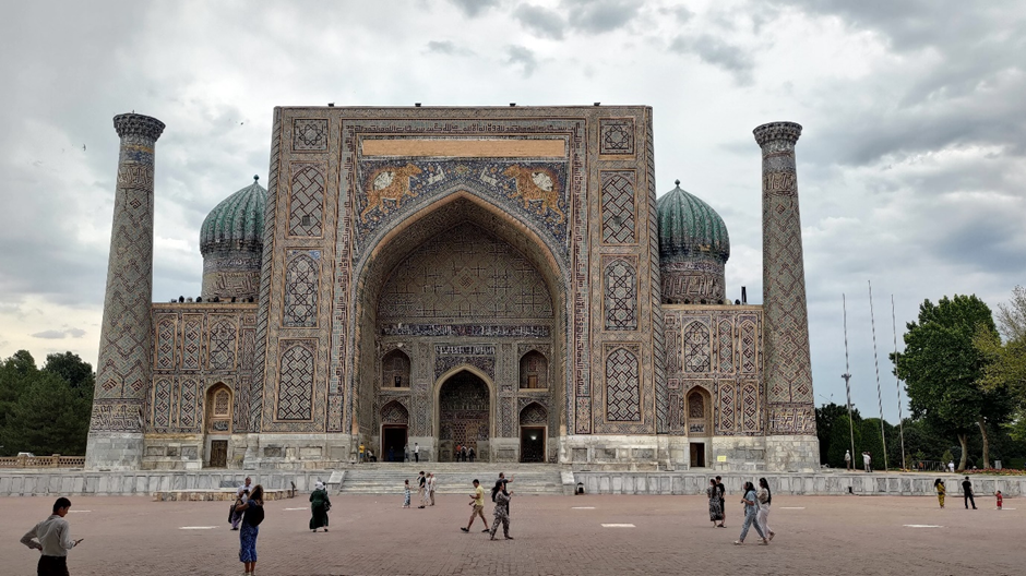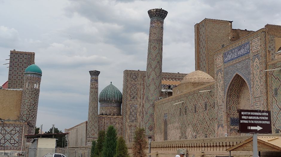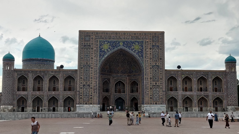 Der Registan, was auf Tadschik „Sandige Platz“ bedeutet, war das Zentrum vom mittelalterlichen Samarkand und beinhaltet heutzutage drei großartige Mädressen. Alle 3 sind wunderschön und überall mit Majolica und azurfarbigen Mosaiks bedeckt. Ihr Alter merkt man vor allem bei ihren schiefen Türmen, die schon vielen Erdbeben getrotzt haben. Der Platz zwischen den dreien ist sehr gut proportioniert und war wahrscheinlich ein großer Basar.