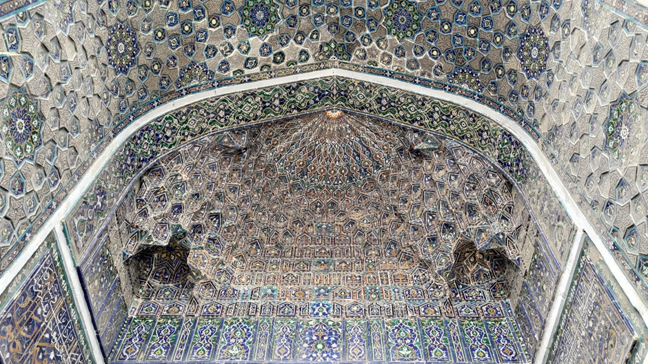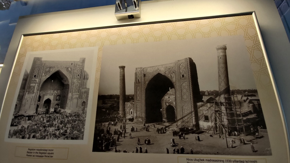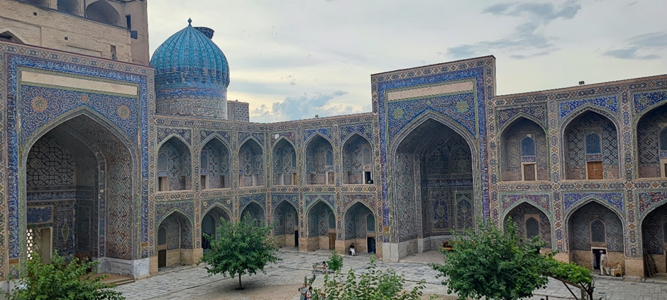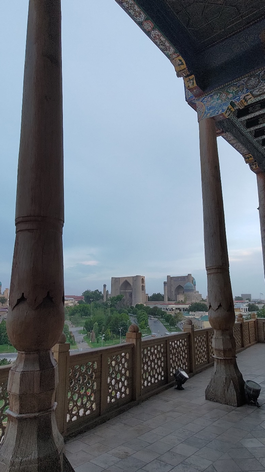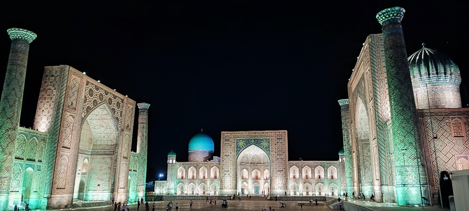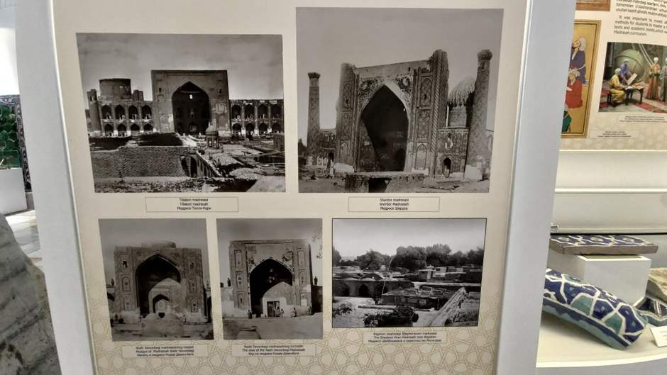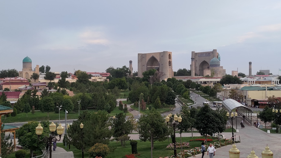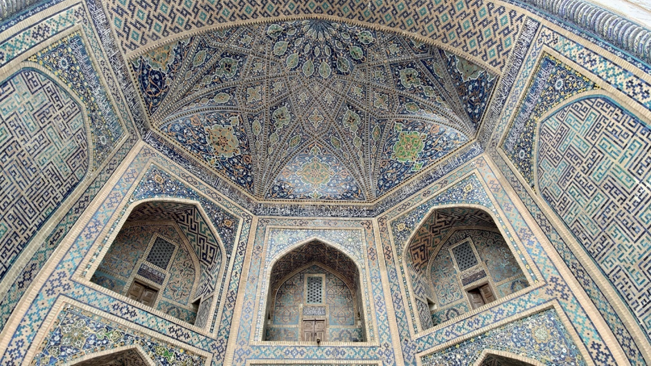 Der Registan, was auf Tadschik „Sandige Platz“ bedeutet, war das Zentrum vom mittelalterlichen Samarkand und beinhaltet heutzutage drei großartige Mädressen. Alle 3 sind wunderschön und überall mit Majolica und azurfarbigen Mosaiks bedeckt. Ihr Alter merkt man vor allem bei ihren schiefen Türmen, die schon vielen Erdbeben getrotzt haben. Der Platz zwischen den dreien ist sehr gut proportioniert und war wahrscheinlich ein großer Basar.