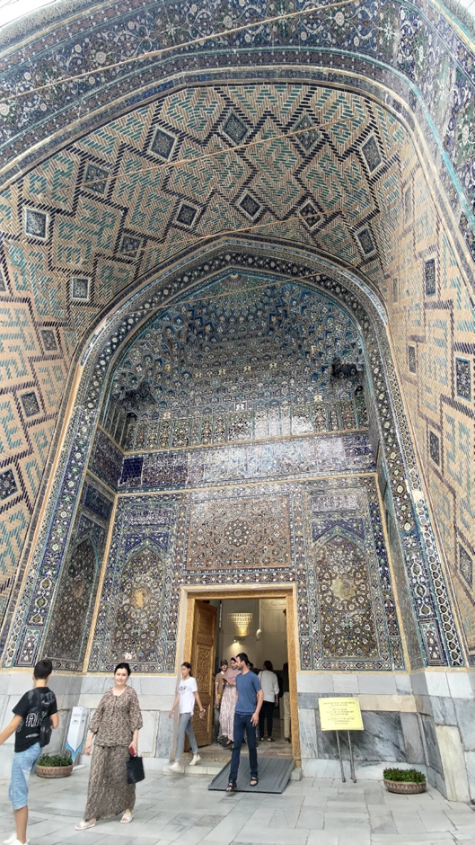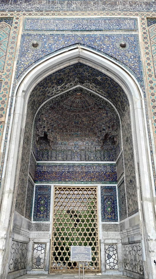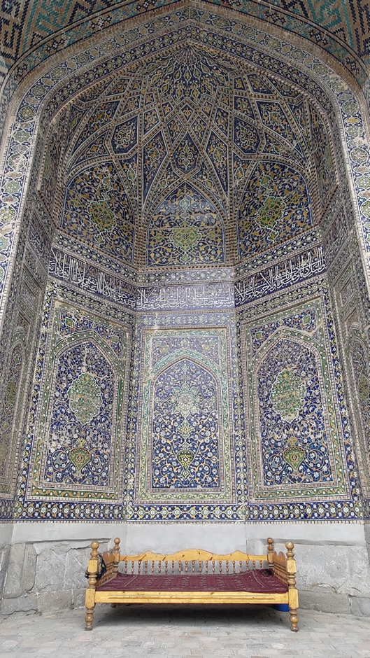 Als erstes haben wir die älteste der 3 Mädressen, die Ulugbek Medresse besucht. Die wurde 1420 unter Ulugbek (Timurs Enkel) erbaut. Ulugbek war ein sehr milder und erleuchteter Herrscher, der sehr interessiert und talentiert an Mathematik und Astronomie war. Er hat in Samarkand auch ein großes Observatorium gebaut.