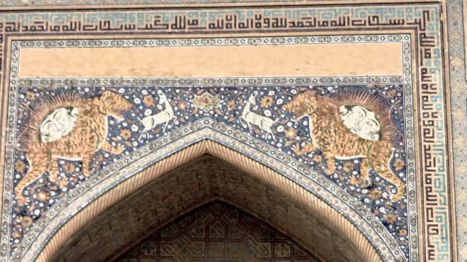 Die anderen zwei Gebäude sind spätere Nachahmungen von Emir Yalangtush und stammen aus dem 17. Jh. Die Mädresse gegenüber von Ulugbeks ist die Sher Dor (Löwen) Mädresse, die in 1636 fertiggestellt wurde. Die Fassade über dem großen Eingangstor ist dekoriert mit Löwen (die eher wie Tiger aussehen), Rehen und Sonnen mit mongolisch aussehenden Gesichtern, die alle sehr komisch und nicht real aussehen. Der Grund warum sie so anders sind, ist das Verbot des Islams, lebendige Wesen darzustellen.