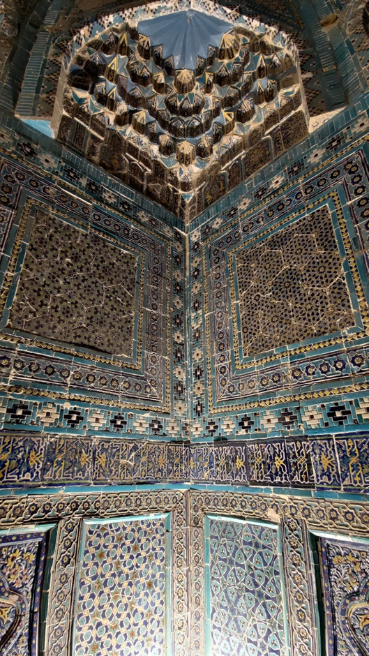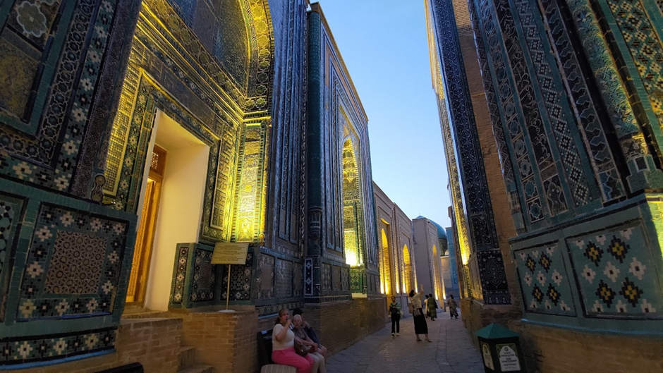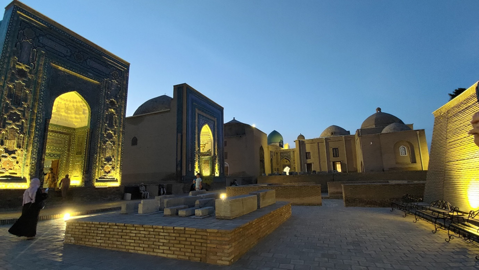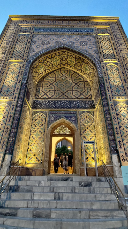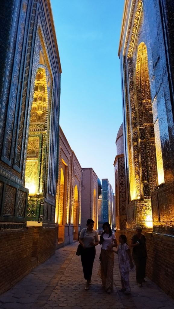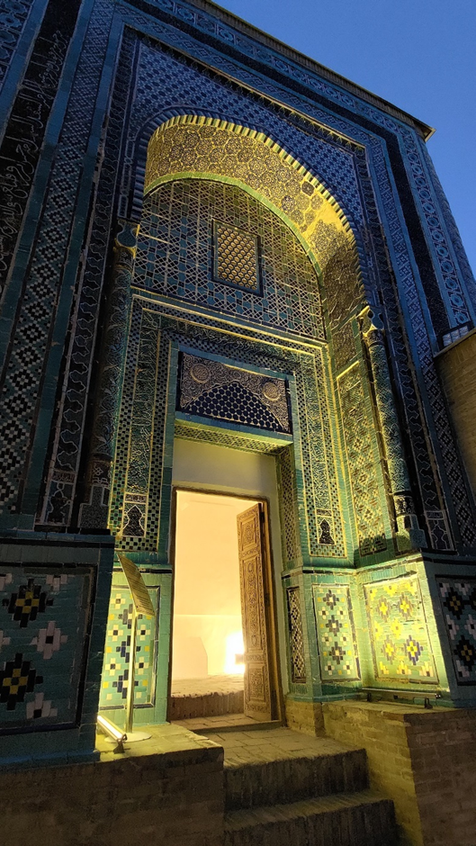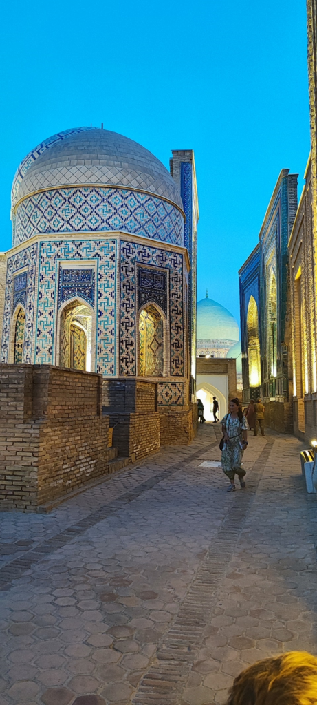 Oben ankommen, standen wir am Anfang eines Boulevards von Mausoleen, eines schöner als das andere. Die mosaikbedeckten Meisterwerke haben die reichste Flieskunst der muslimischen Welt. Wir waren dort in der blauen Stunde. Als die Lichter angemacht wurden, wirkte der ganze Komplex von wunderschönen Gebäuden noch beeindruckender.