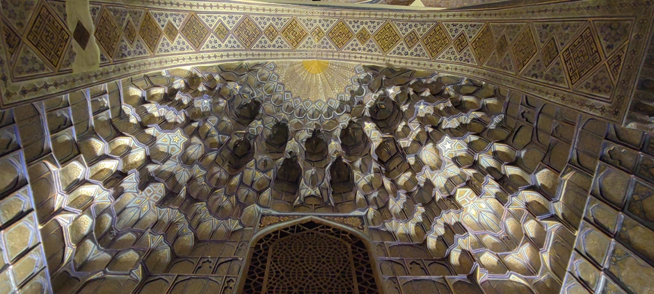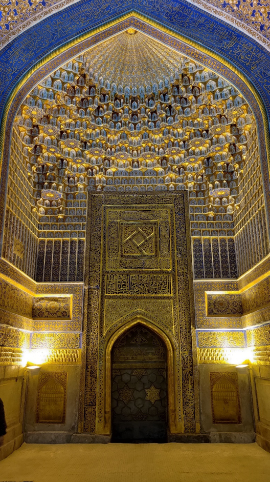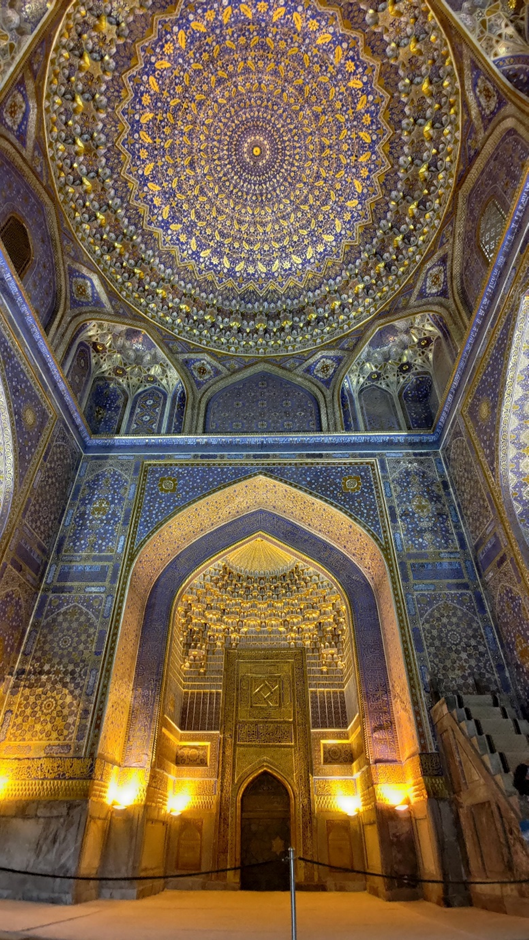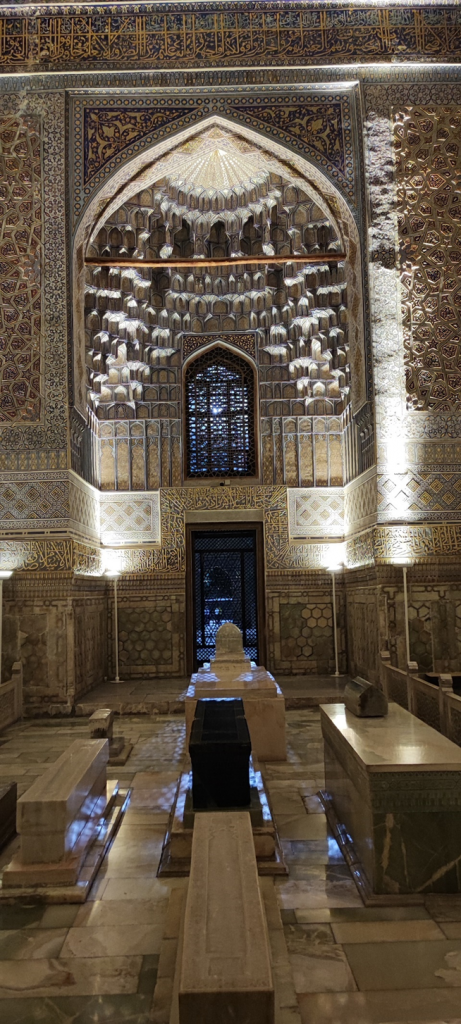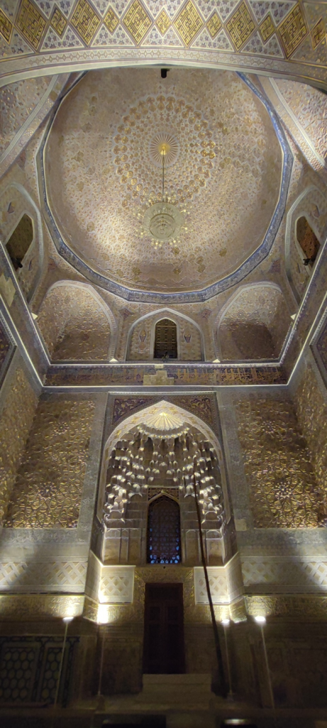 Nach dem Essen hat Humo uns gefragt, ob wir noch was sehen wollten. Noch was „echtes“. (Er hat unsere Erklärungen, warum wir New Samarkand nicht mochten, nachvollzogen und wollte uns noch was wirklich schönes zeigen.) Ich habe über das Amir Temur Mausoleum gelesen und vorgeschlagen, dass wir vielleicht noch dieses anschauen könnten. Das Mausoleum von den großen Herrscher Timur und seiner Familie war wirklich wunderschön. Von draußen auch, aber drinnen noch mehr. Die goldene Kuppel mit feiner Dekoration war einzigartig und sehr beeindruckend.