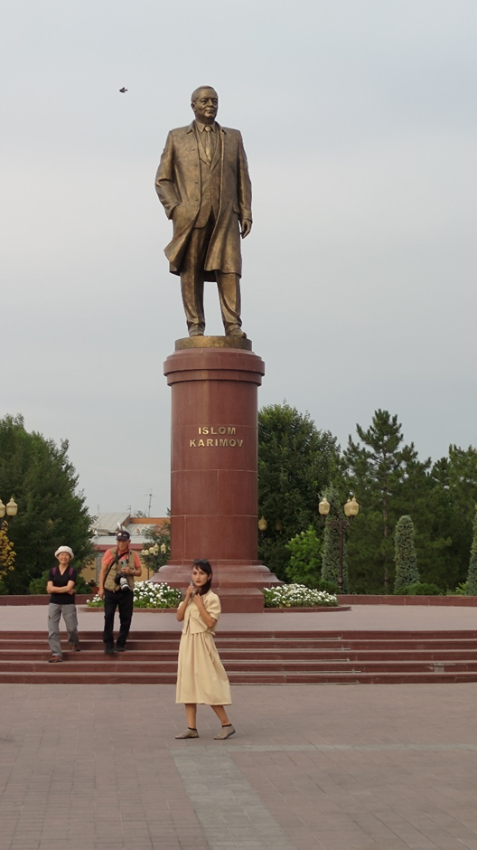 Nachdem wir den Registan angeschaut haben, trafen wir davor Humo, der uns den Rest der Stadt zeigen wollte. Zwischen Souveniershops und vielen Touristen liefen gemeinsam zur Bibi-Khanym Moschee. Auf dem Weg haben wir die Statue des ersten Präsidenten Islom Karimov gesehen.